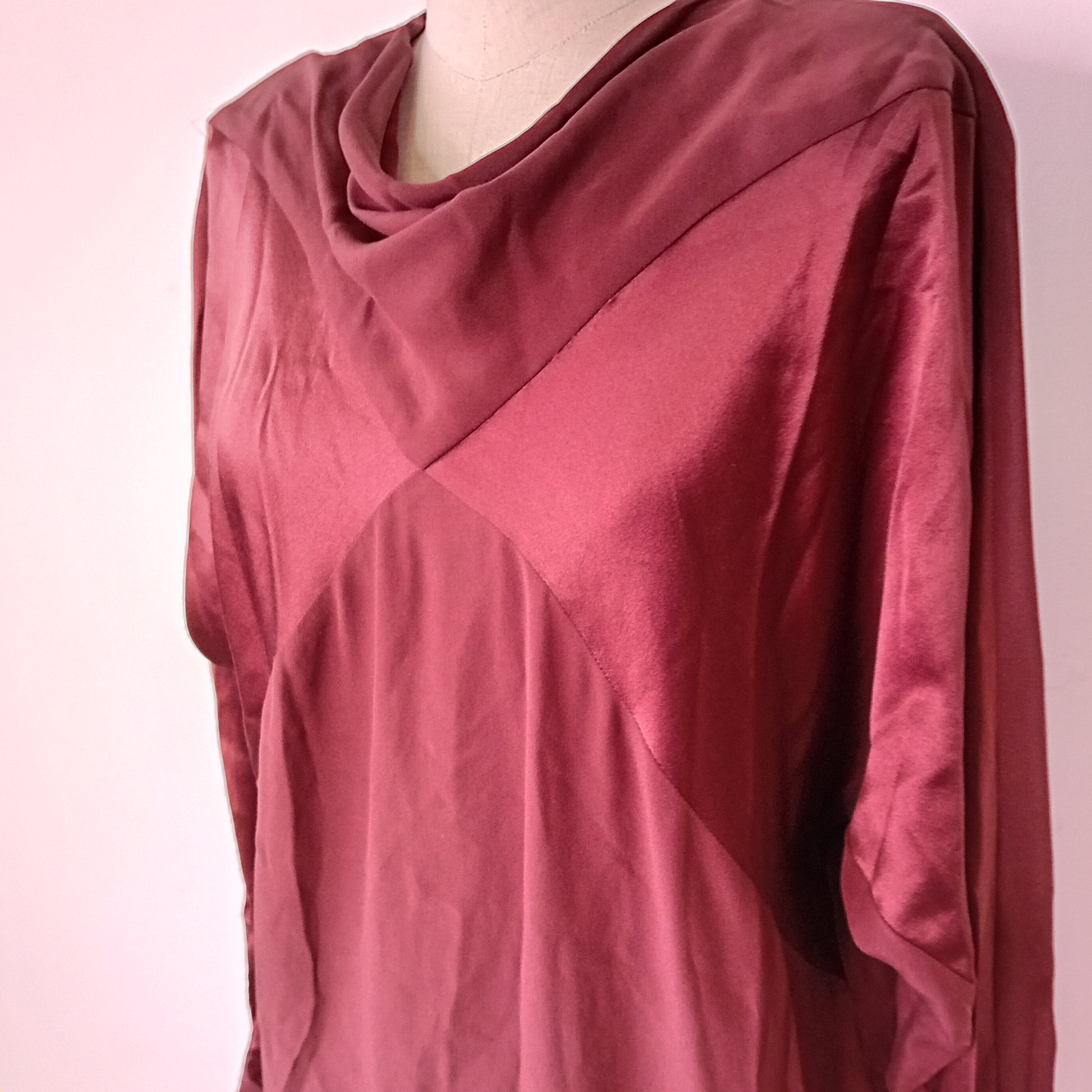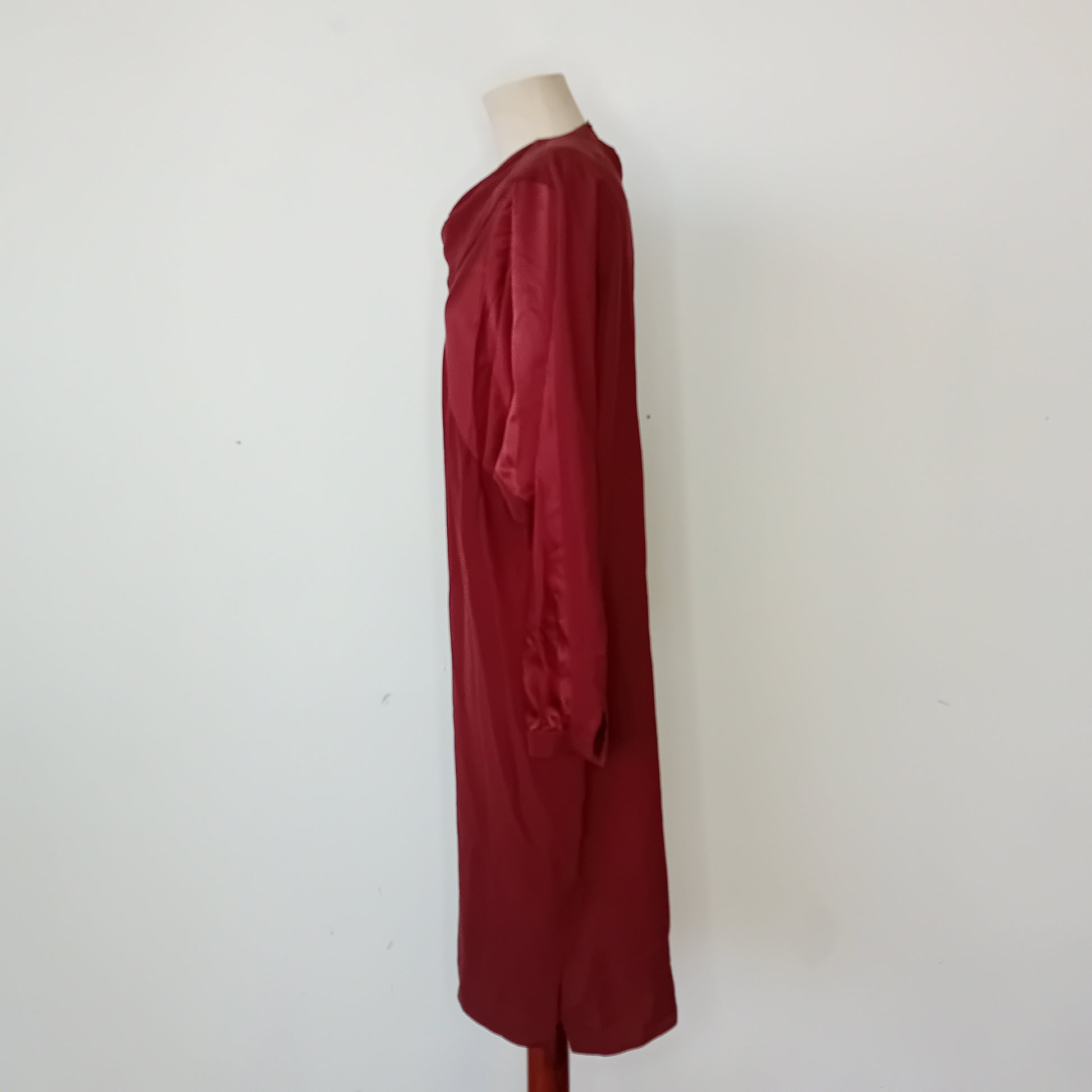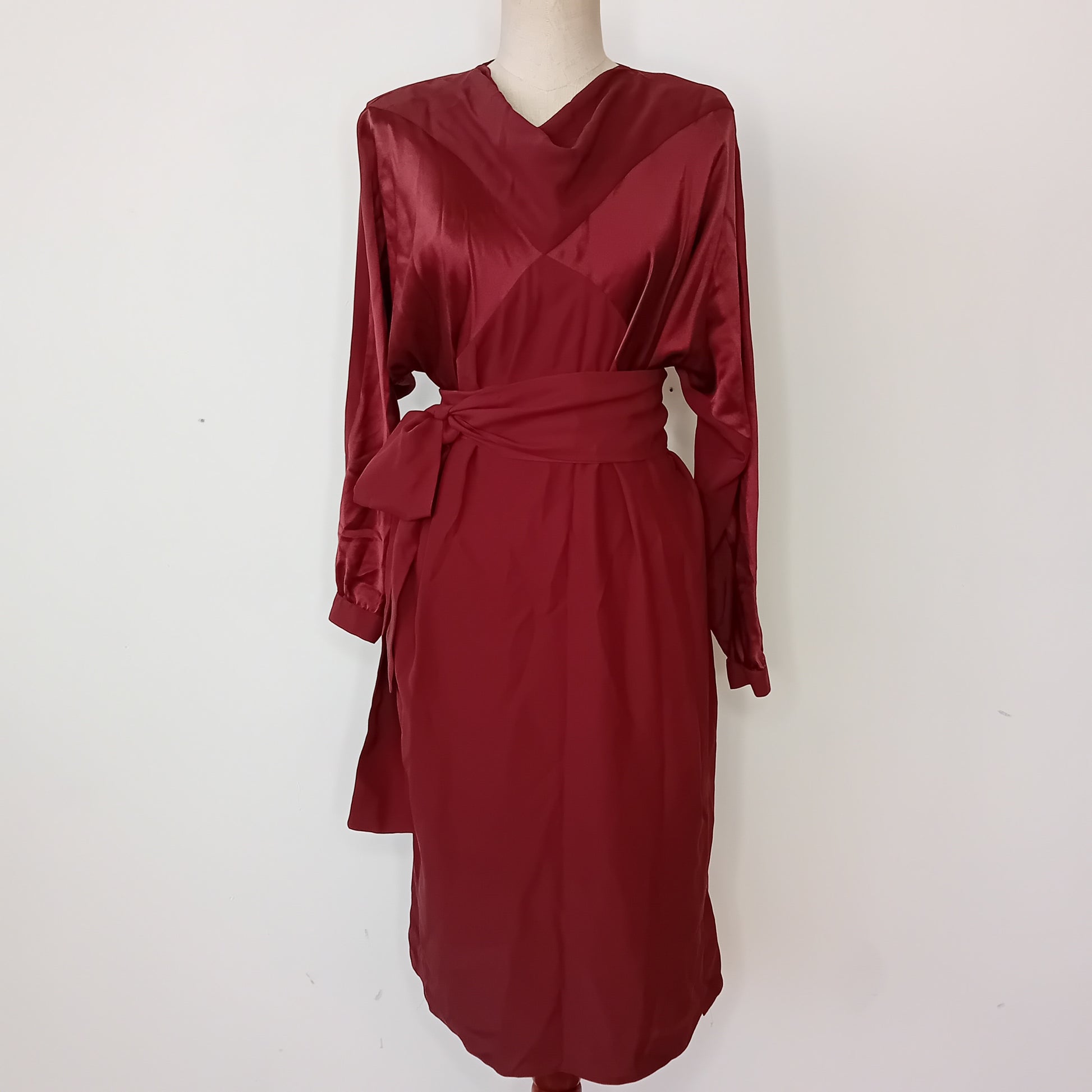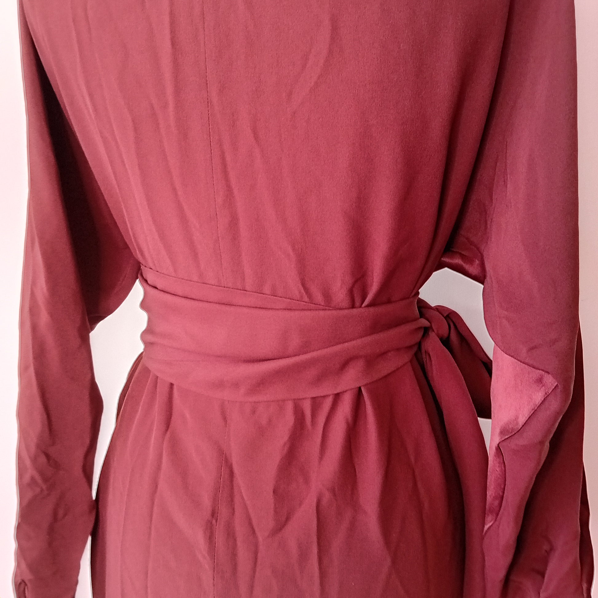 Abito vintage PIANOFORTE, in pura seta marrone, spalline rinforzate, maniche lunghe con chiusura a bottone, scollo morbido a barca, chiusura posteriore con bottone e scollo a goccia, incrocio frontale di tessuto, tra seta liscia e seta grezza, scende dritto, lunghezza midi, con cintura rimovibile abbinata. Amato, ottimamente conservato. La cintura presenta una piccola macchia.