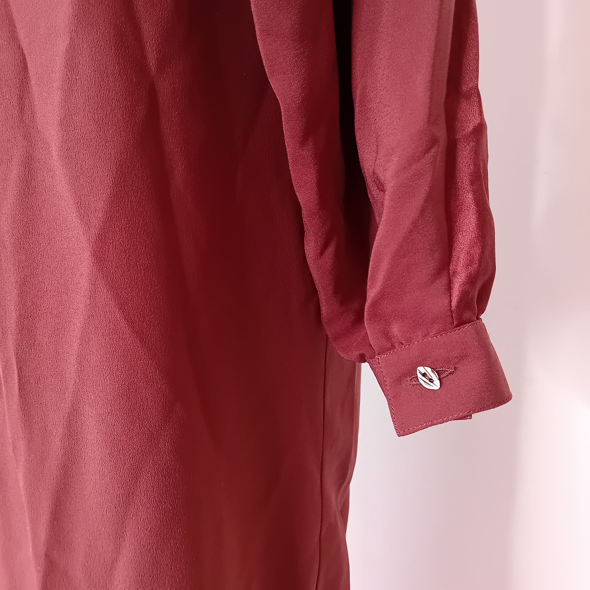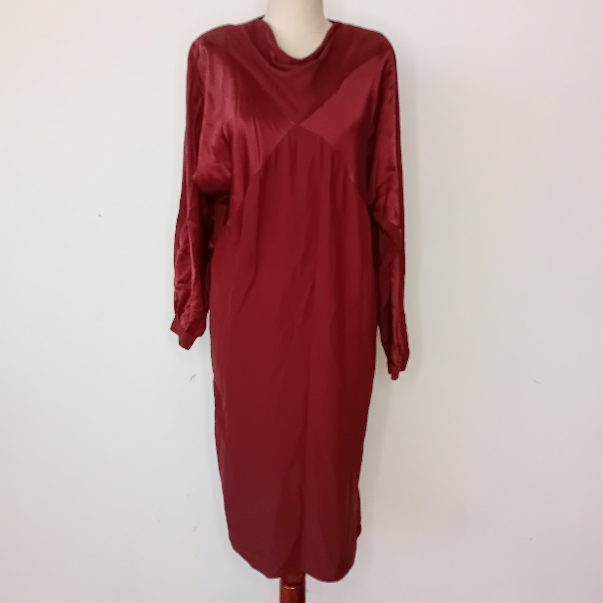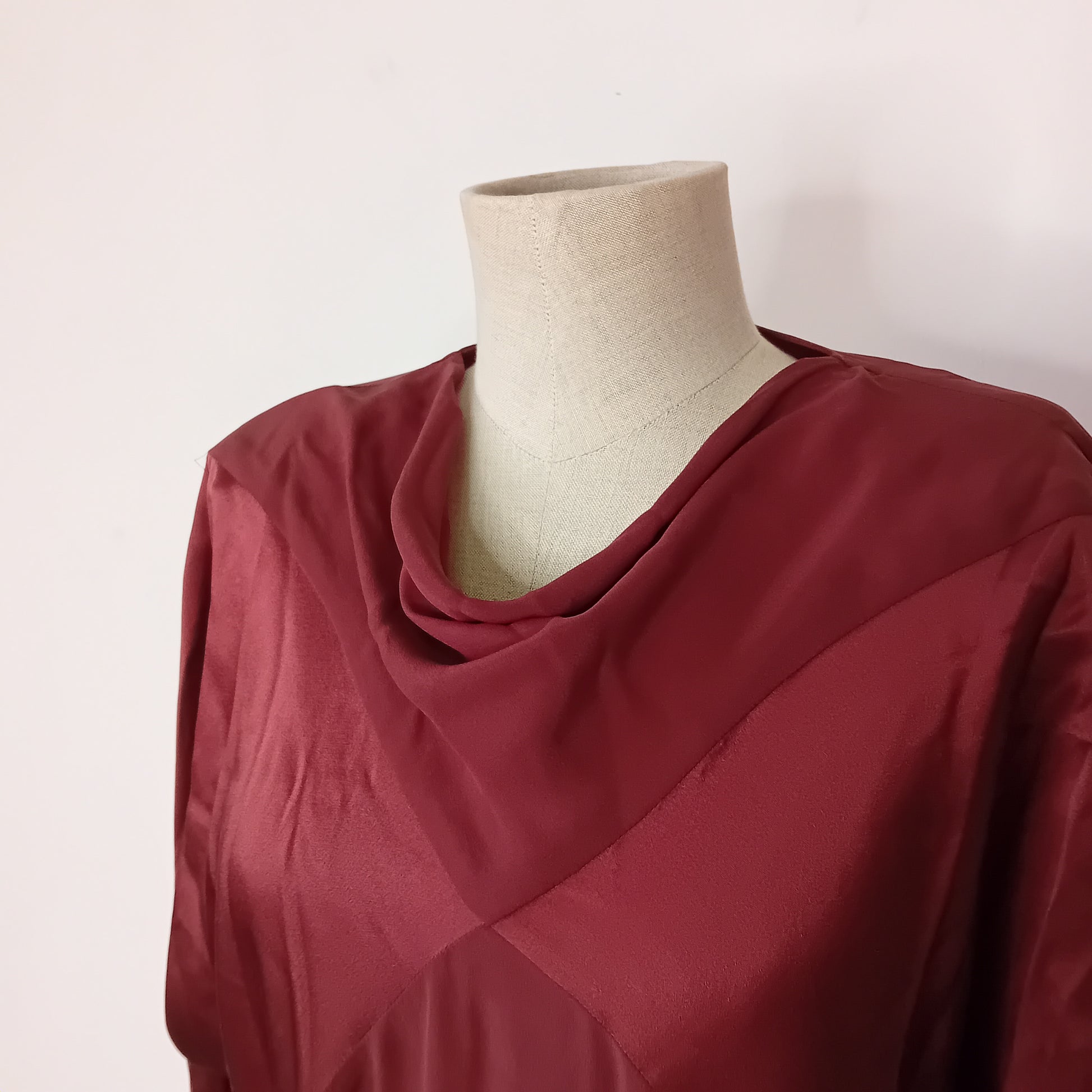 Abito vintage PIANOFORTE, in pura seta marrone, spalline rinforzate, maniche lunghe con chiusura a bottone, scollo morbido a barca, chiusura posteriore con bottone e scollo a goccia, incrocio frontale di tessuto, tra seta liscia e seta grezza, scende dritto, lunghezza midi, con cintura rimovibile abbinata. Amato, ottimamente conservato. La cintura presenta una piccola macchia.