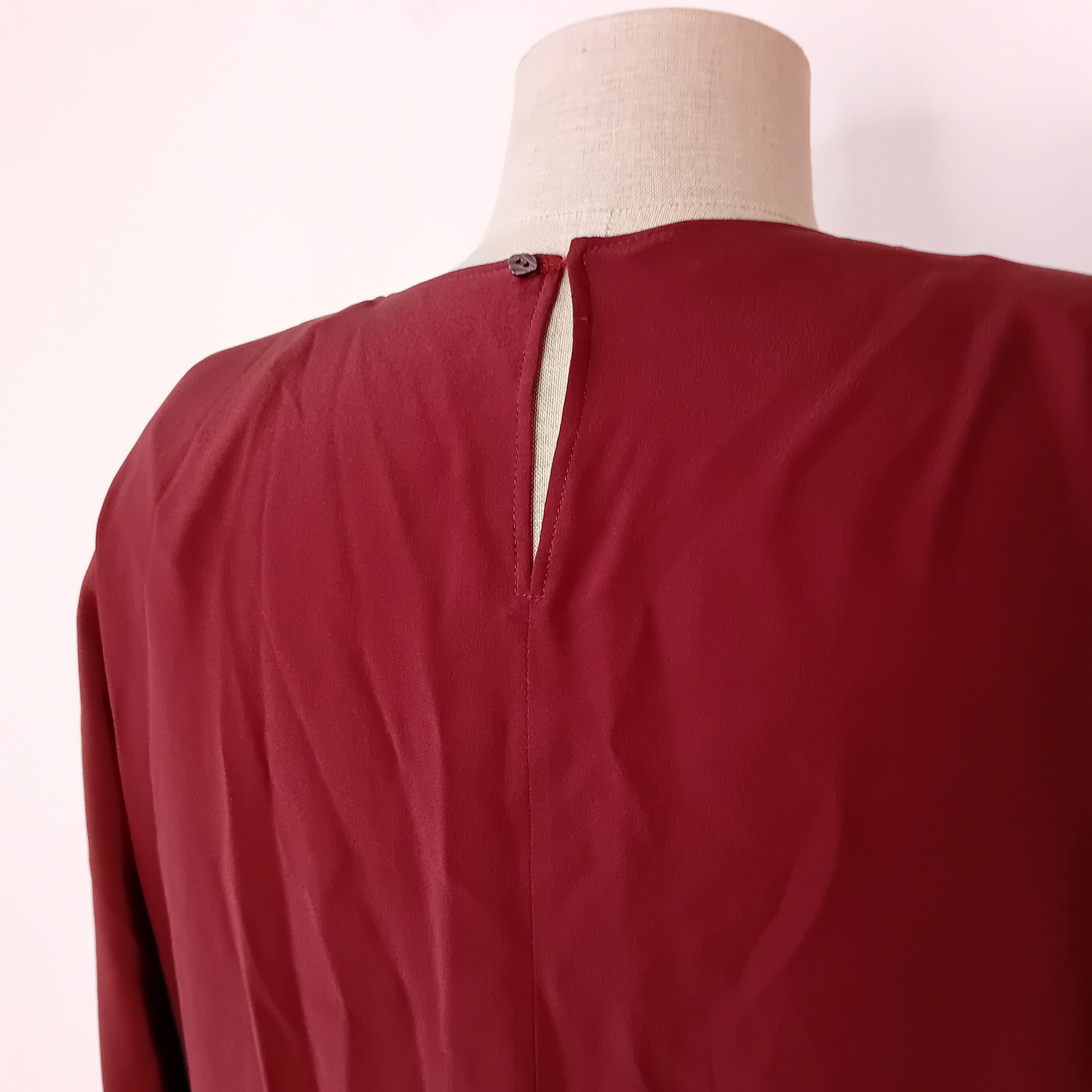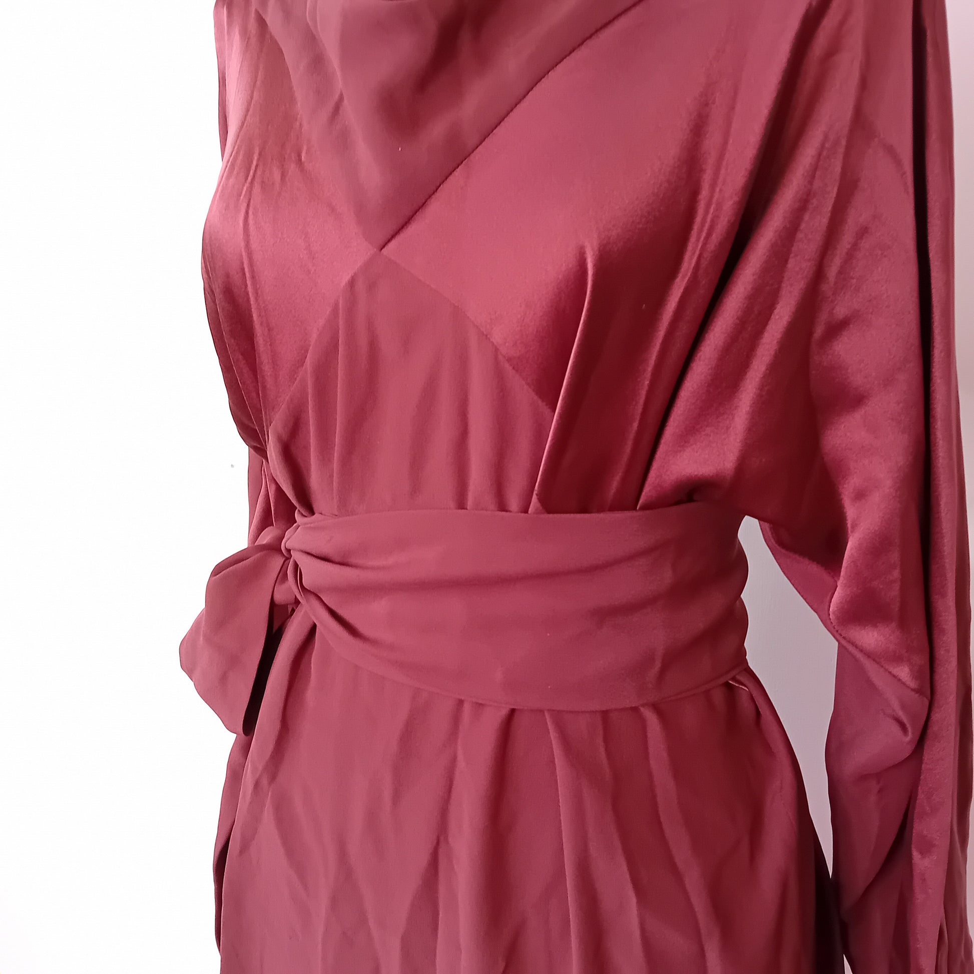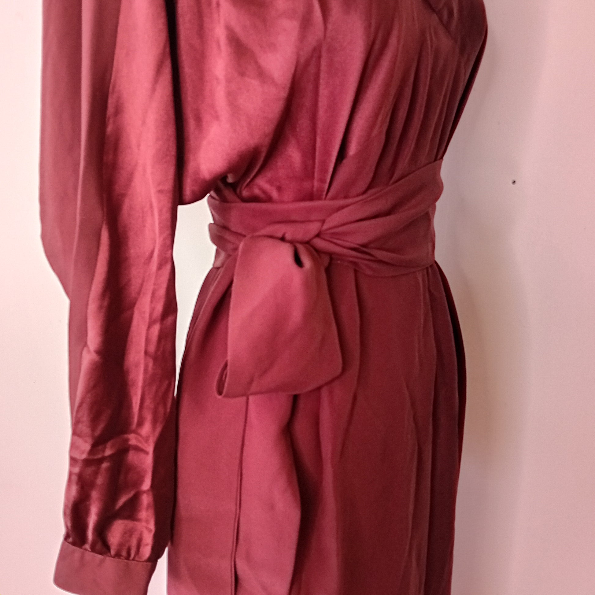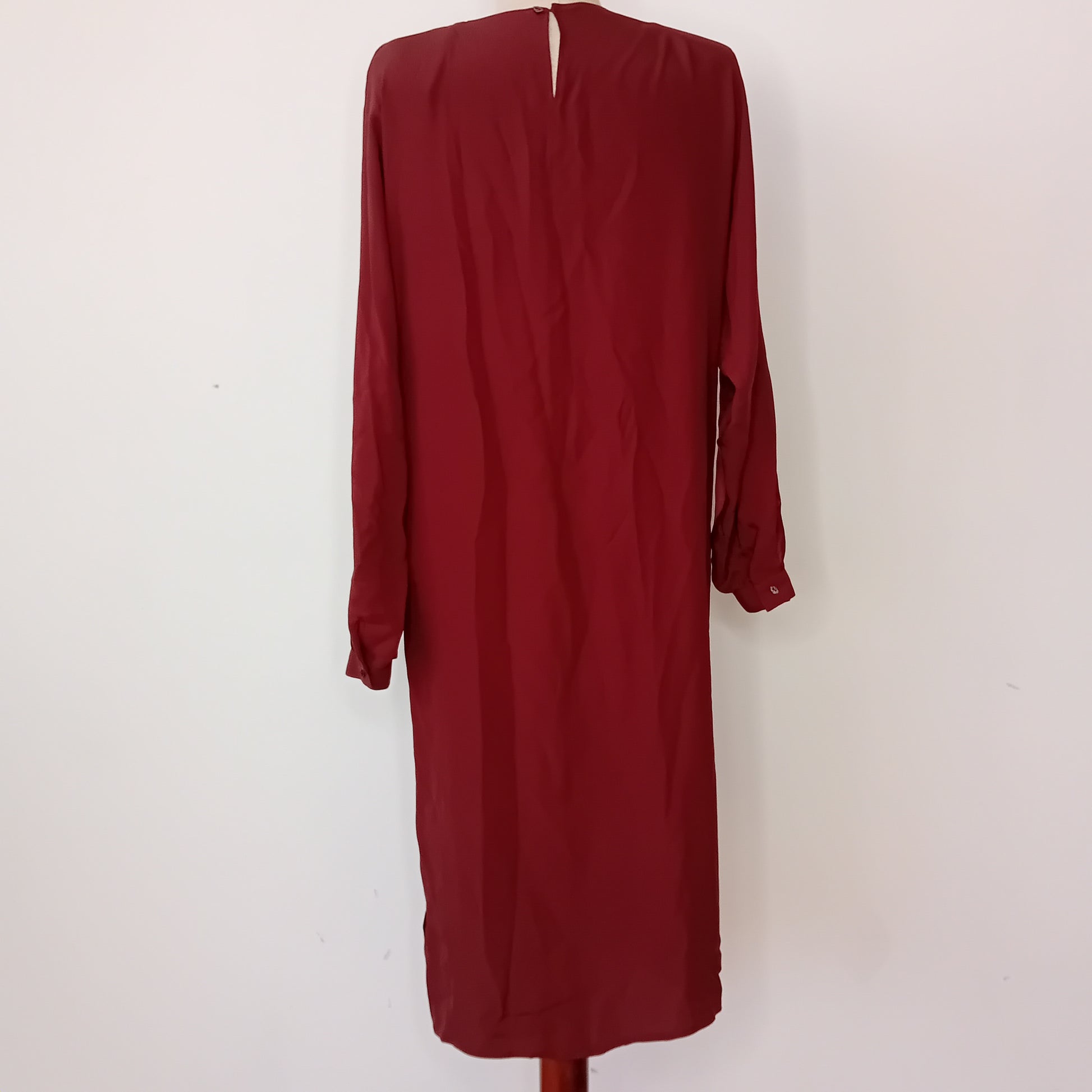 Abito vintage PIANOFORTE, in pura seta marrone, spalline rinforzate, maniche lunghe con chiusura a bottone, scollo morbido a barca, chiusura posteriore con bottone e scollo a goccia, incrocio frontale di tessuto, tra seta liscia e seta grezza, scende dritto, lunghezza midi, con cintura rimovibile abbinata. Amato, ottimamente conservato. La cintura presenta una piccola macchia.