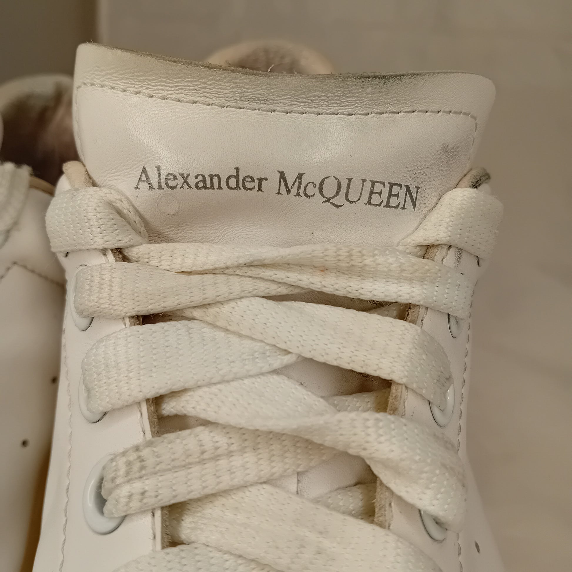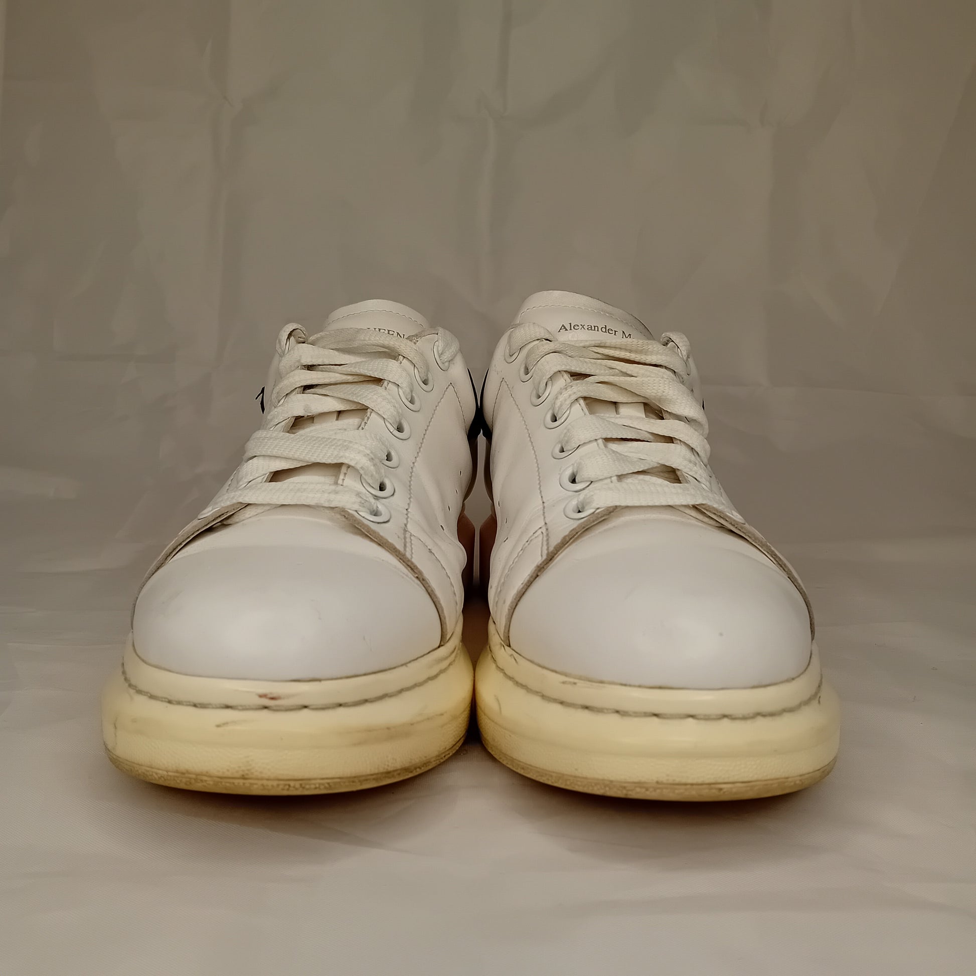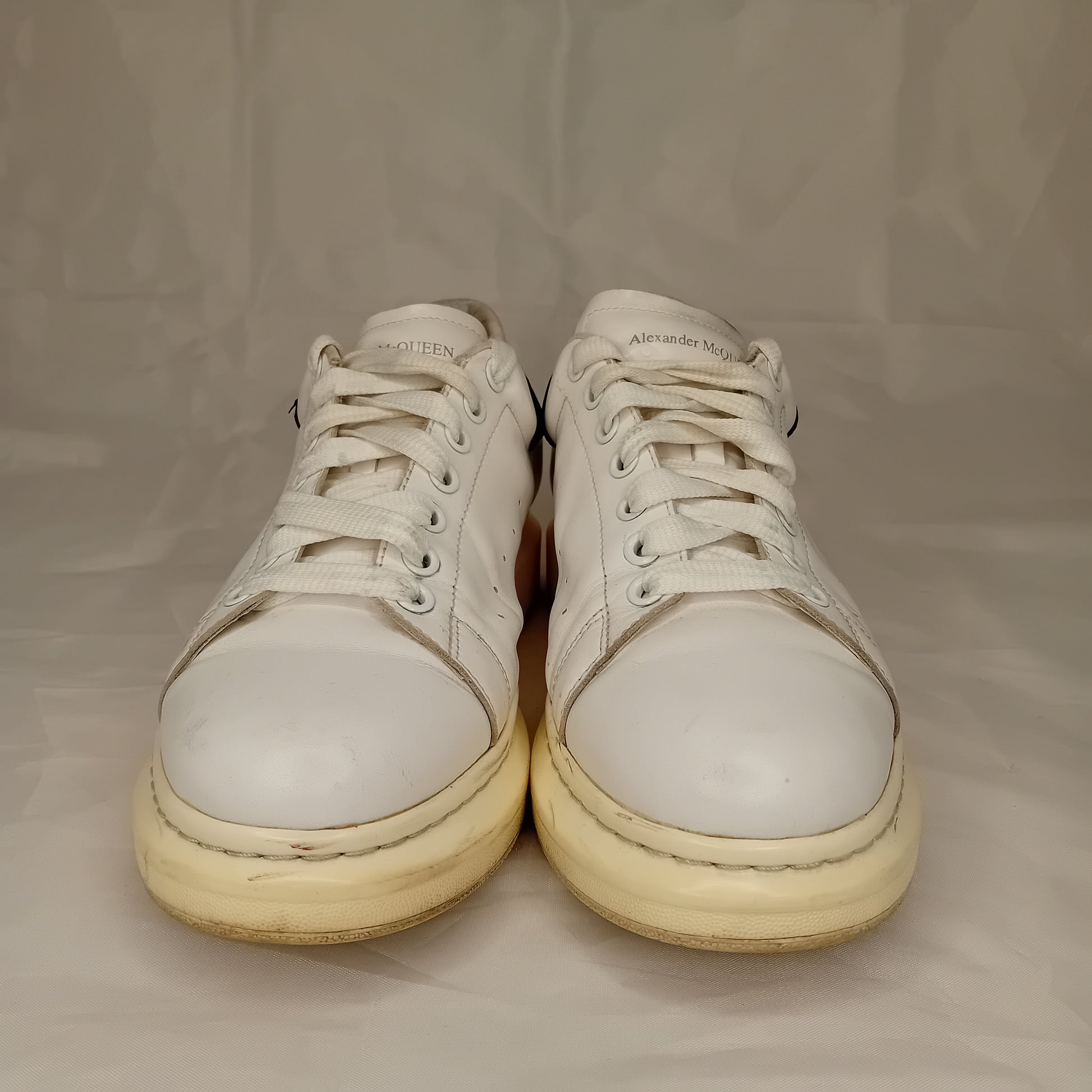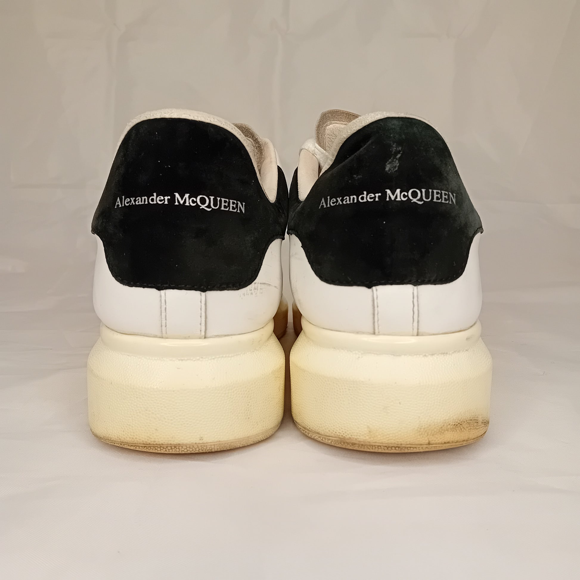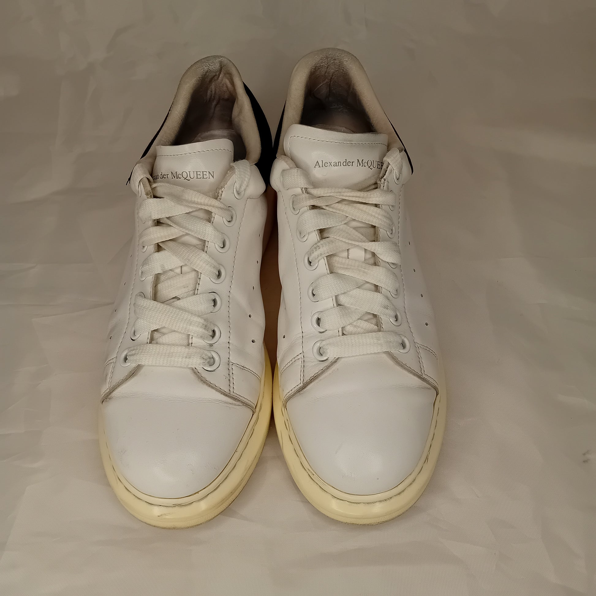 Sneakers ALEXANDER MCQUEEN, modello oversize da uomo, in pelle liscia bianca, sette fori, tallone in scamosciato nero. Amate, presentano segni di utilizzo sparsi. La taglia è stata ricavata dalla misura della soletta interna.