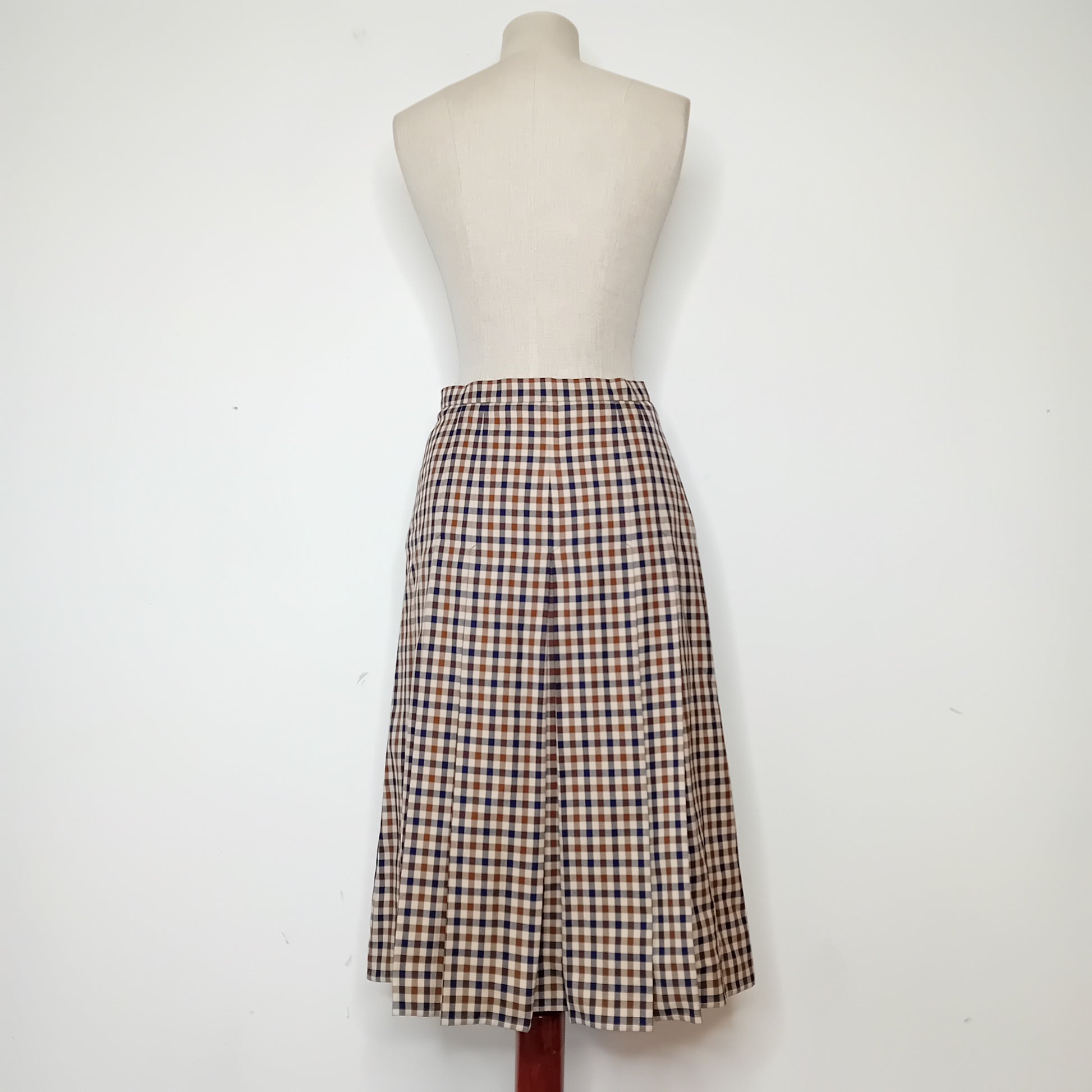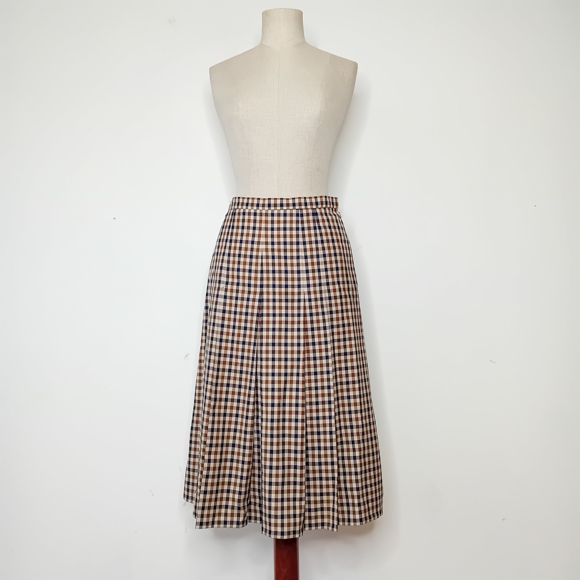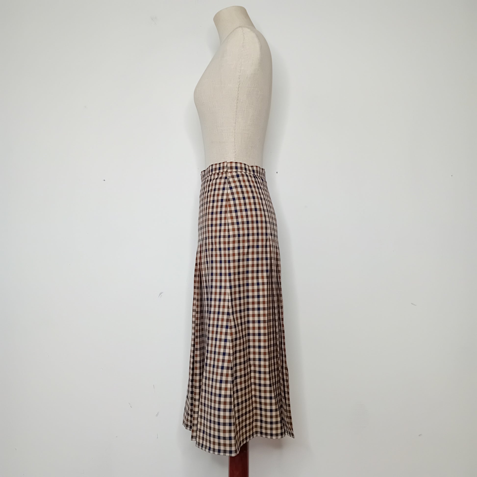 Gonna vintage AQUASCUTUM of London, in tartan piccolo, cinturino in vita e piegoni, lunghezza midi, interamente foderata. Amata, presenta un piccolo buco frontale e un'ampia macchia lungo la fodera interna. Esternamente molto ben conservata.