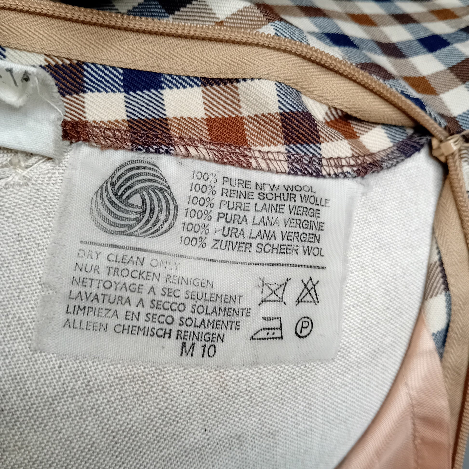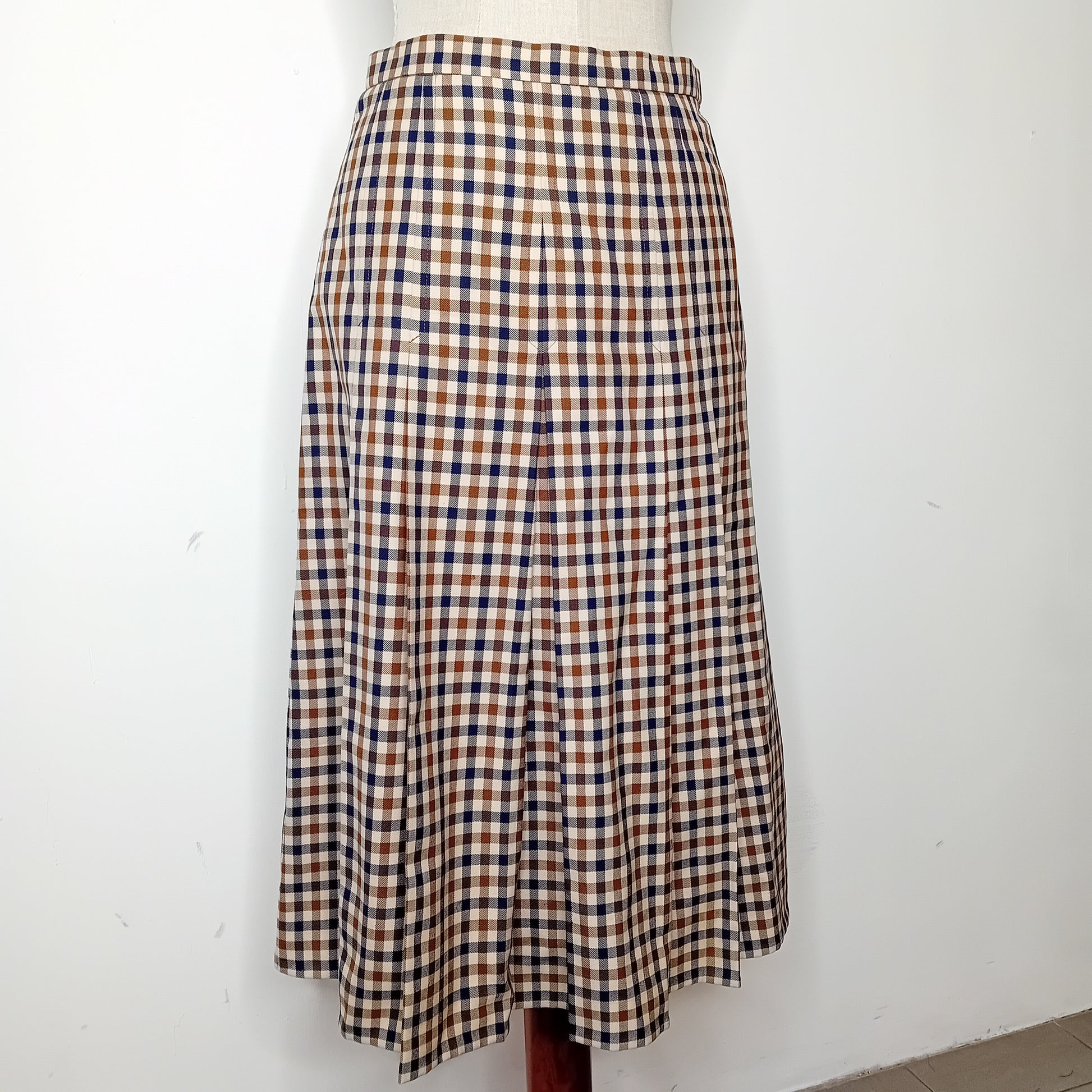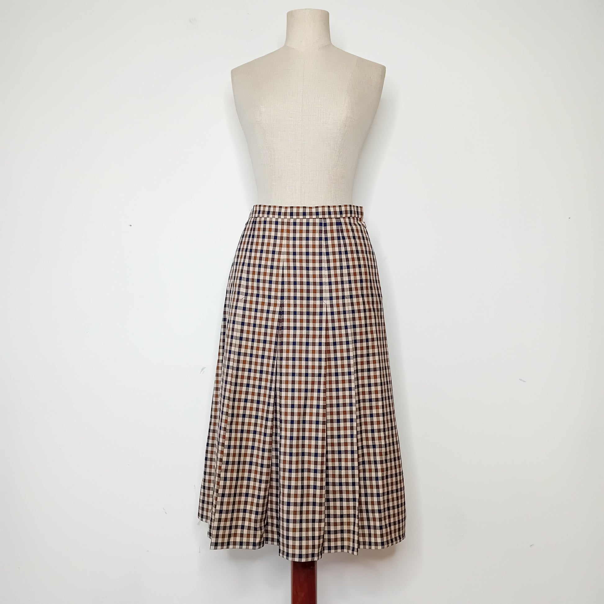Gonna vintage AQUASCUTUM of London, in tartan piccolo, cinturino in vita e piegoni, lunghezza midi, interamente foderata. Amata, presenta un piccolo buco frontale e un'ampia macchia lungo la fodera interna. Esternamente molto ben conservata.