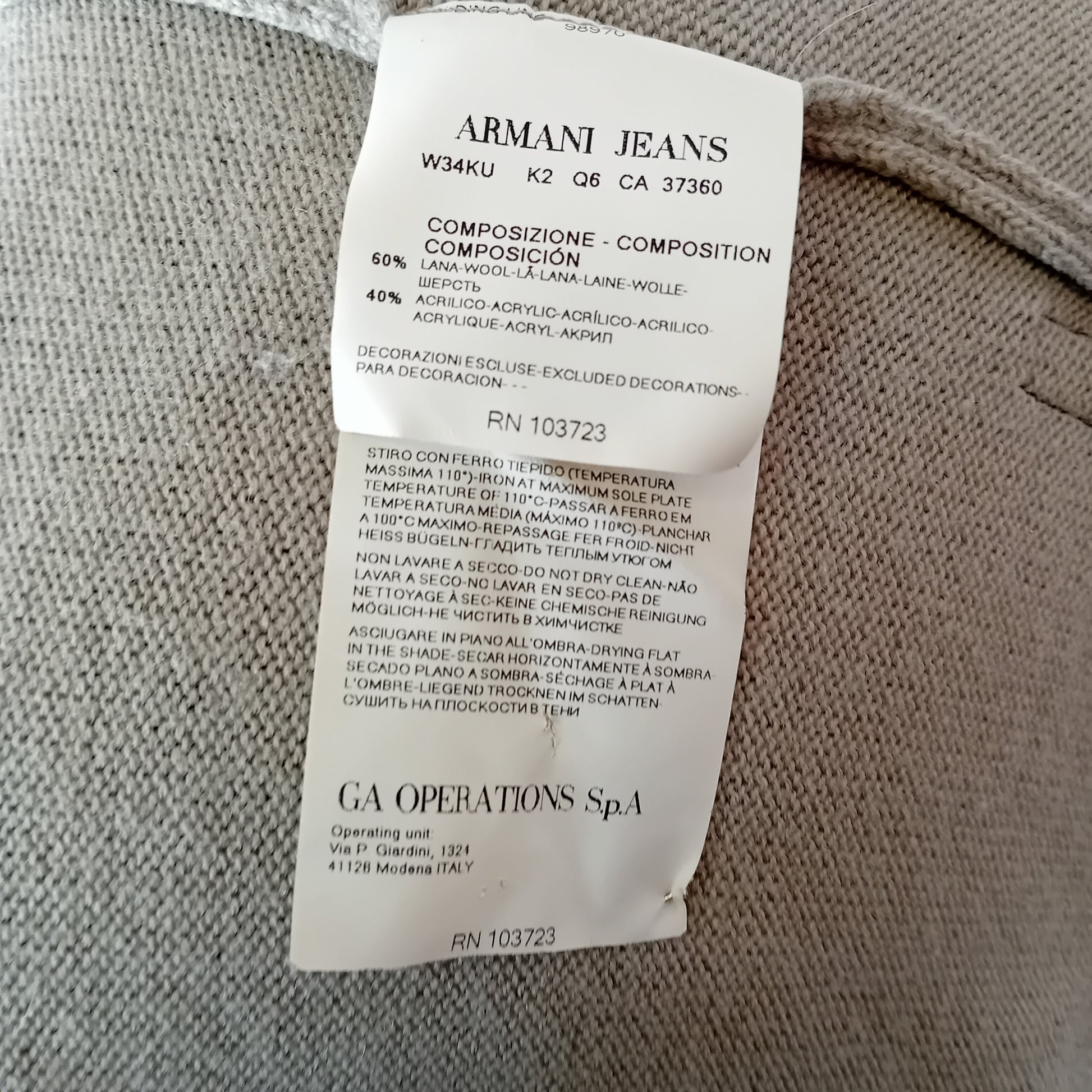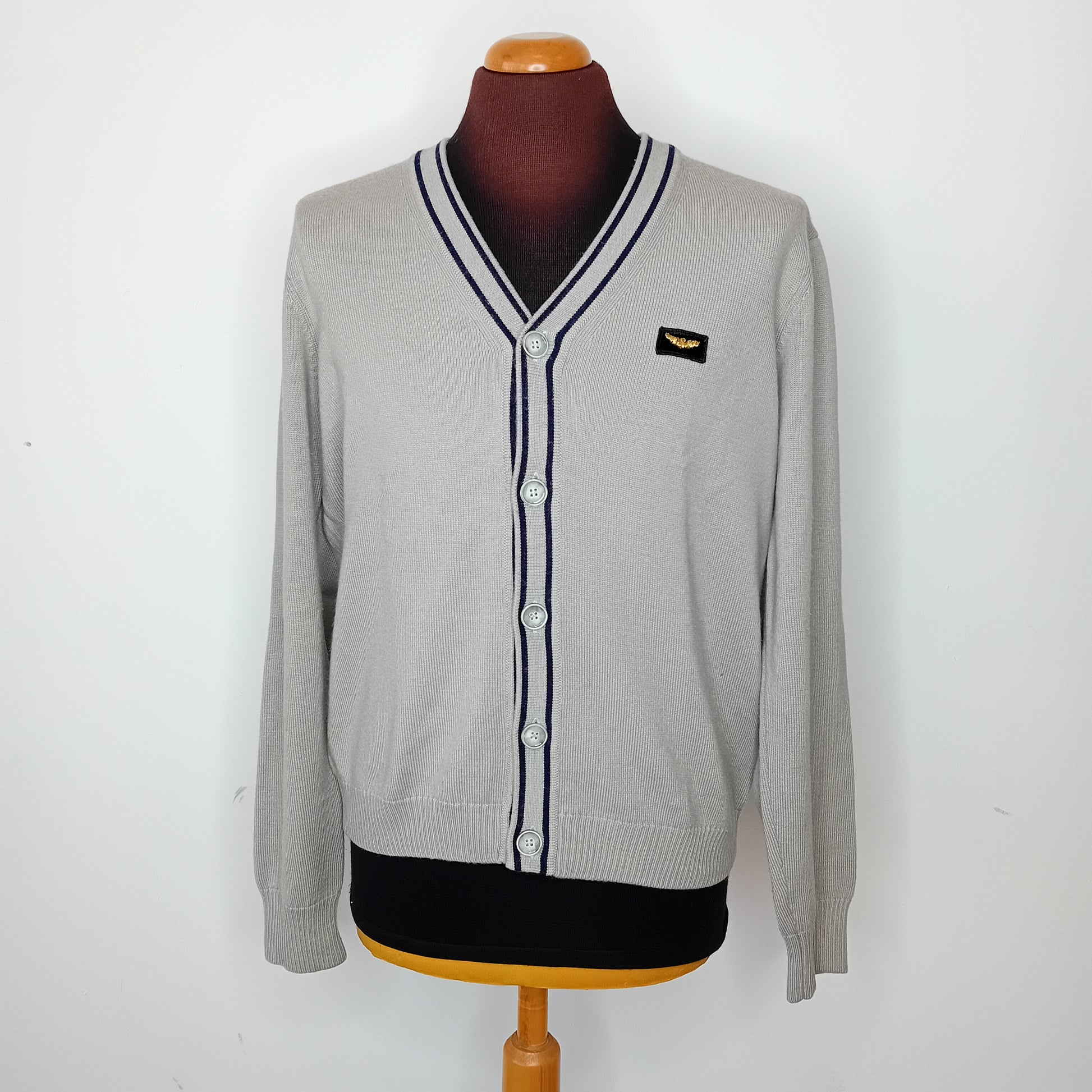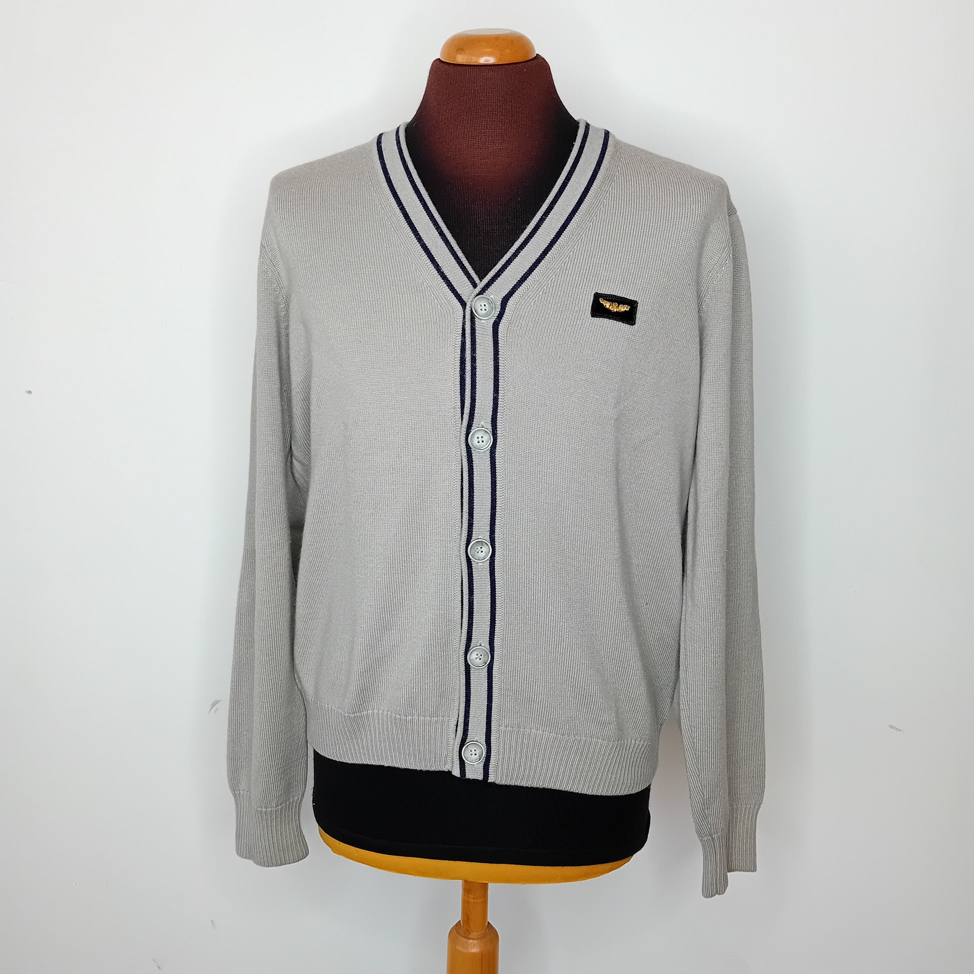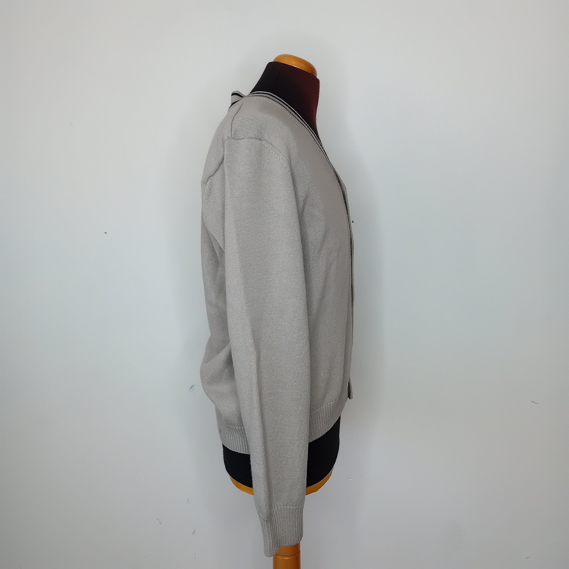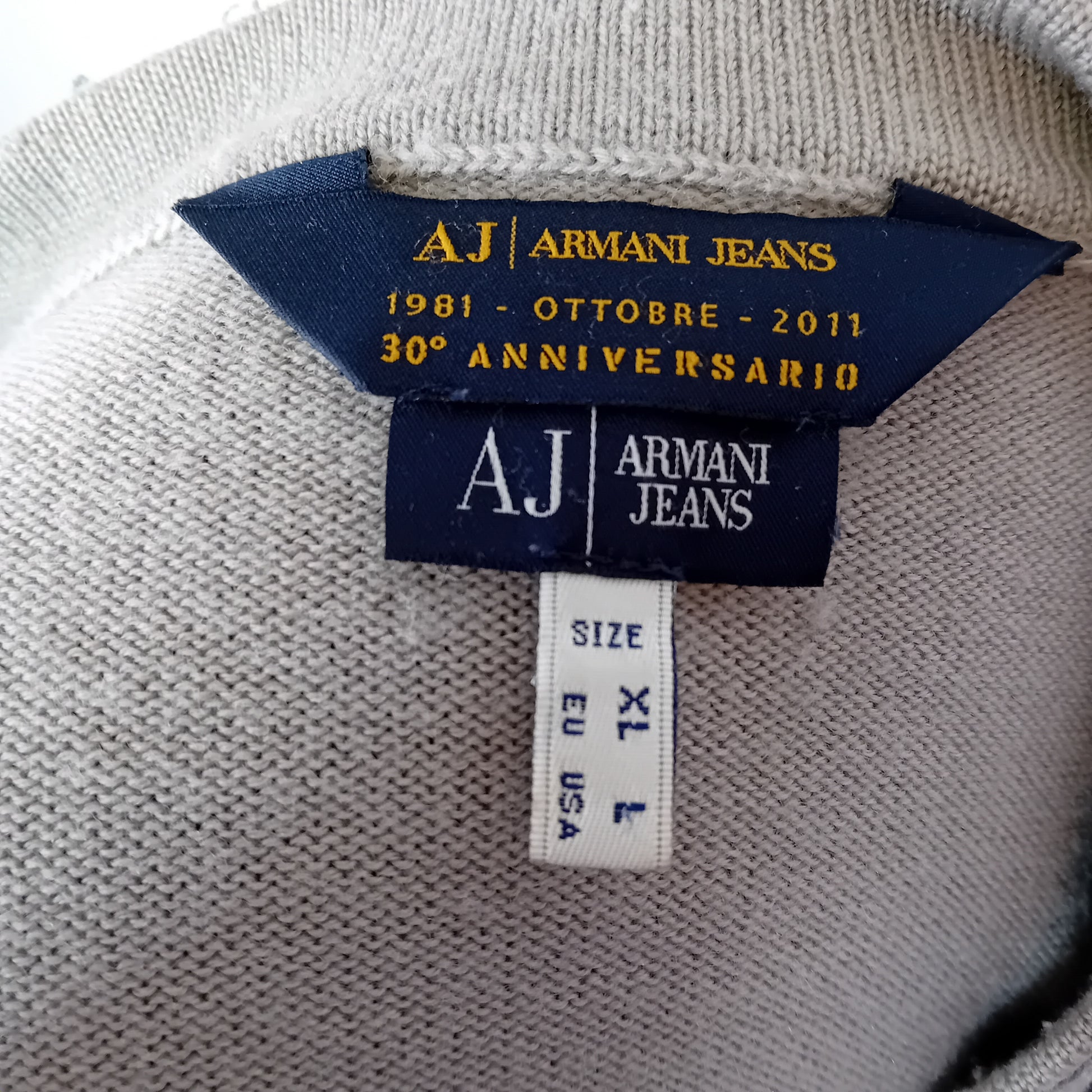 Cardigan ARMANI JEANS per il 30 anniversario dell'azienda, a maglia rasata grigia, scollo a V, no tasche. Amato, presenta qualche piccolo pallino, ben conservato.