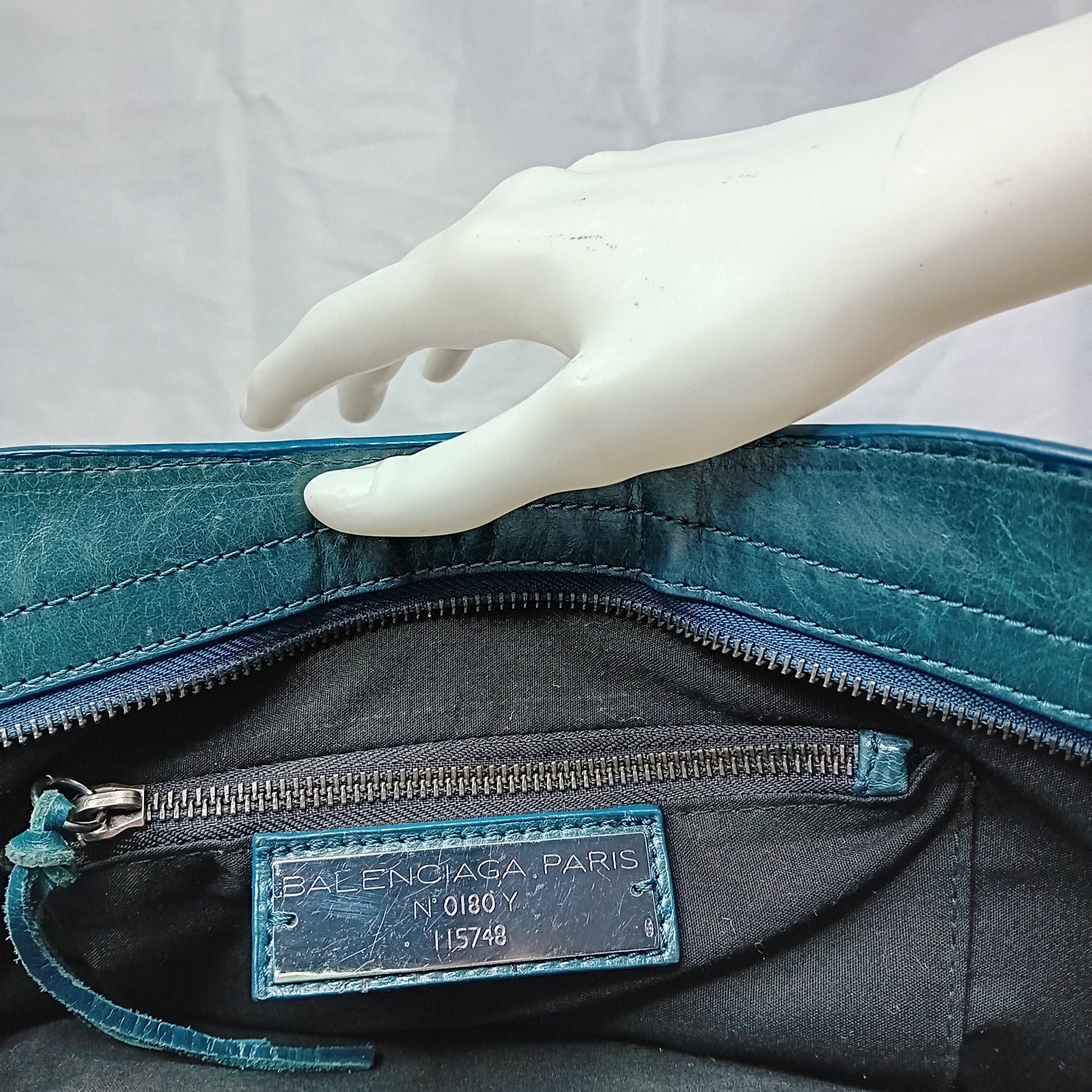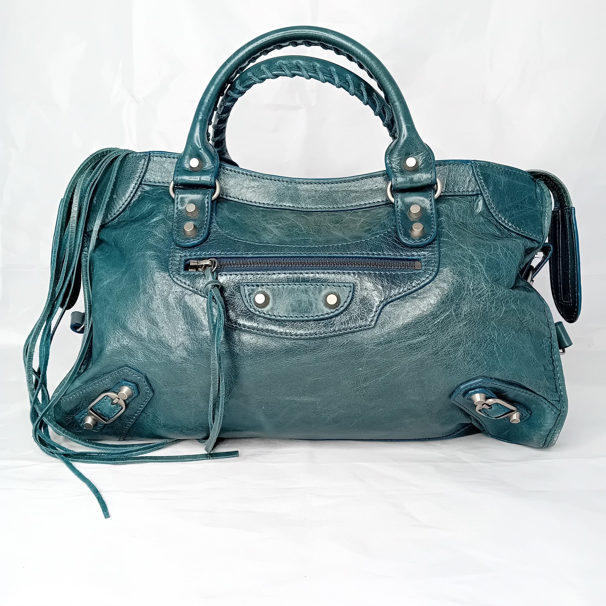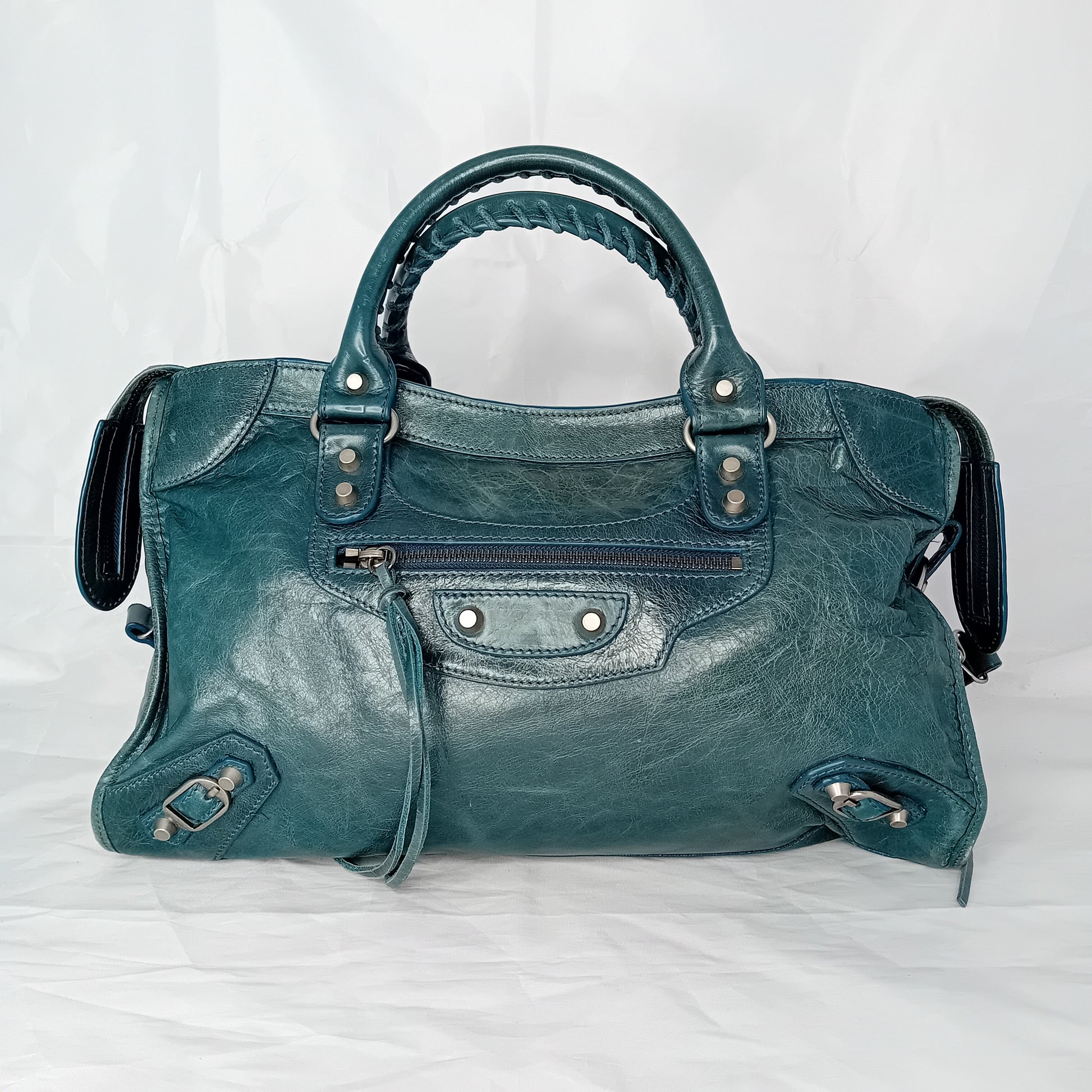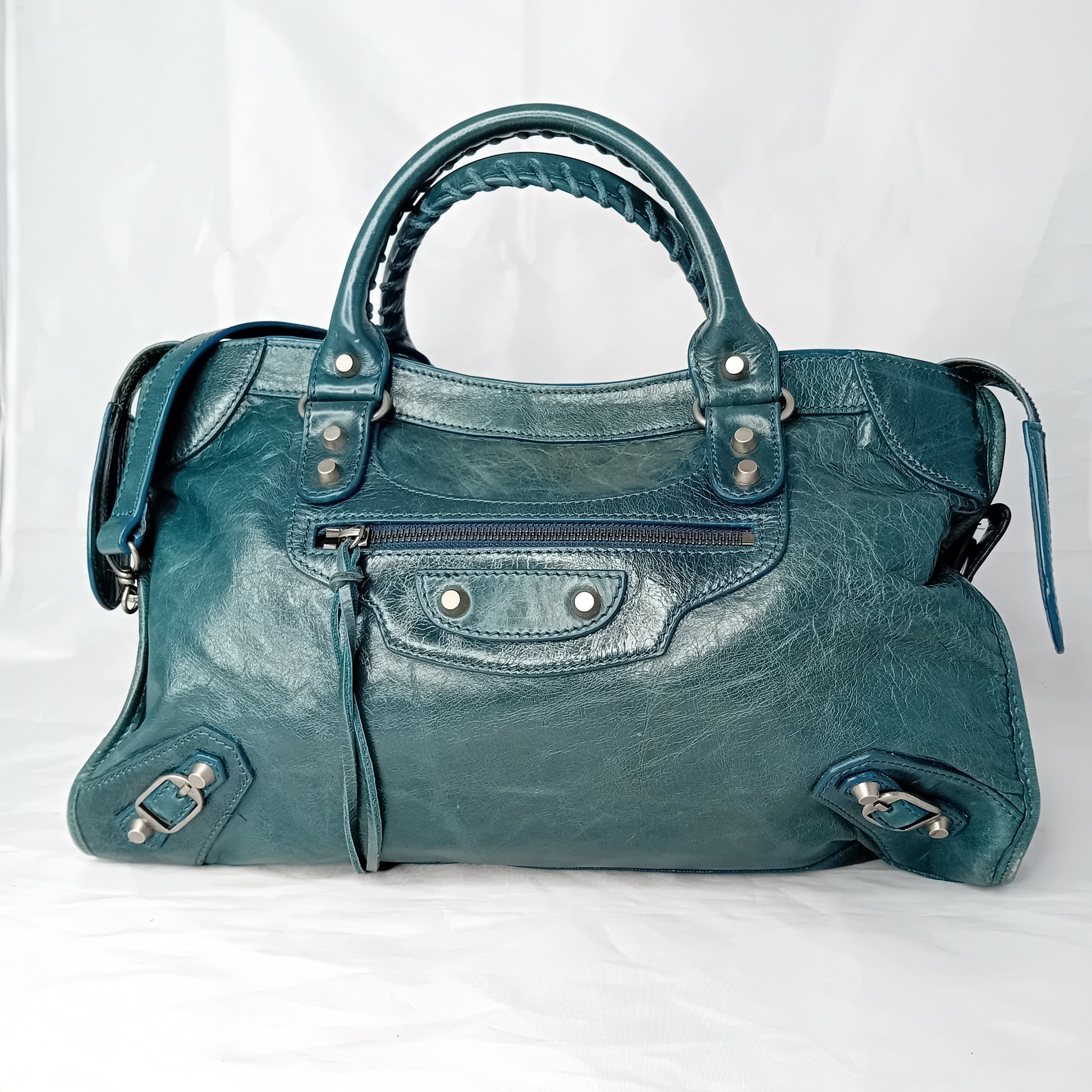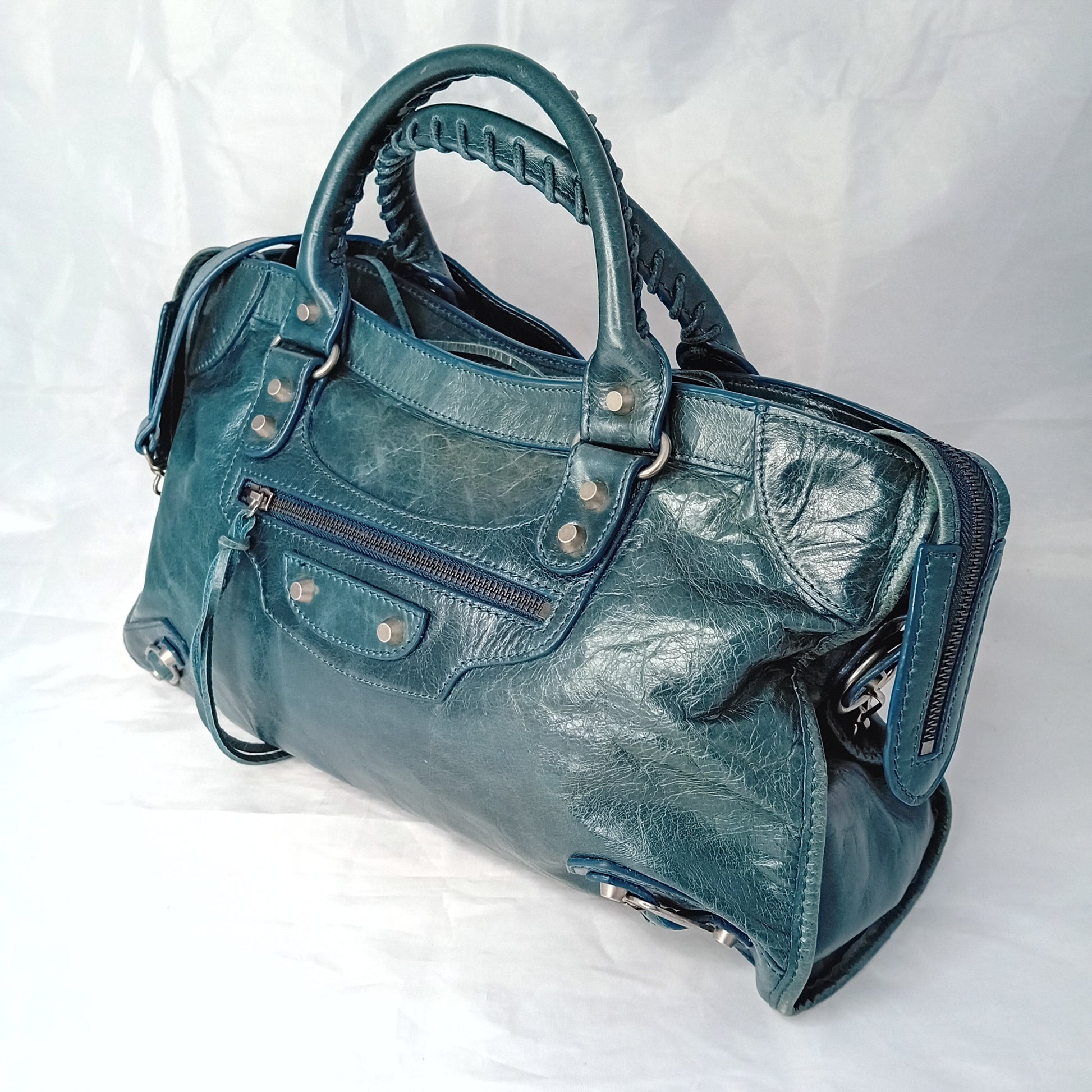 Borsa BALENCIAGA, modello City, in pelle petrolio, doppi manici, tracolla rimovibile, doppia zip, interno ad un unico scomparto con tasca con zip. Amata, presenta consueti segni di utilizzo, due ampie macchie all'interno della fodera.