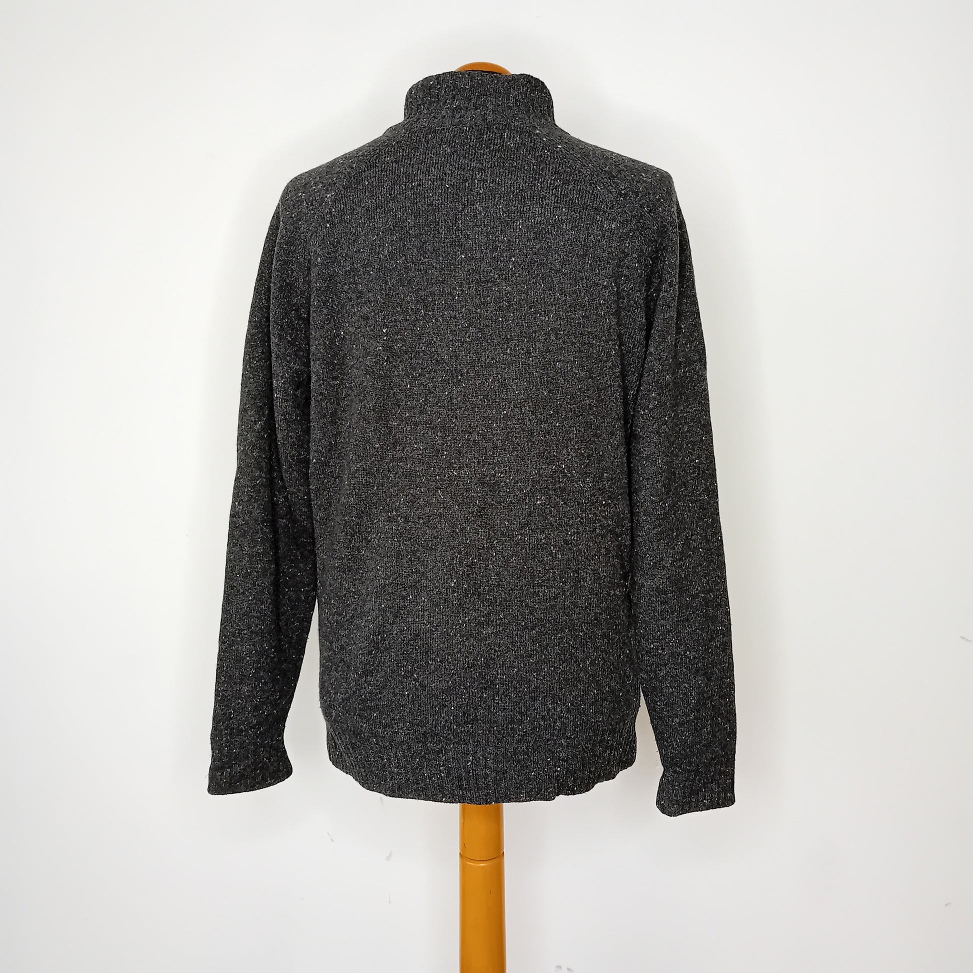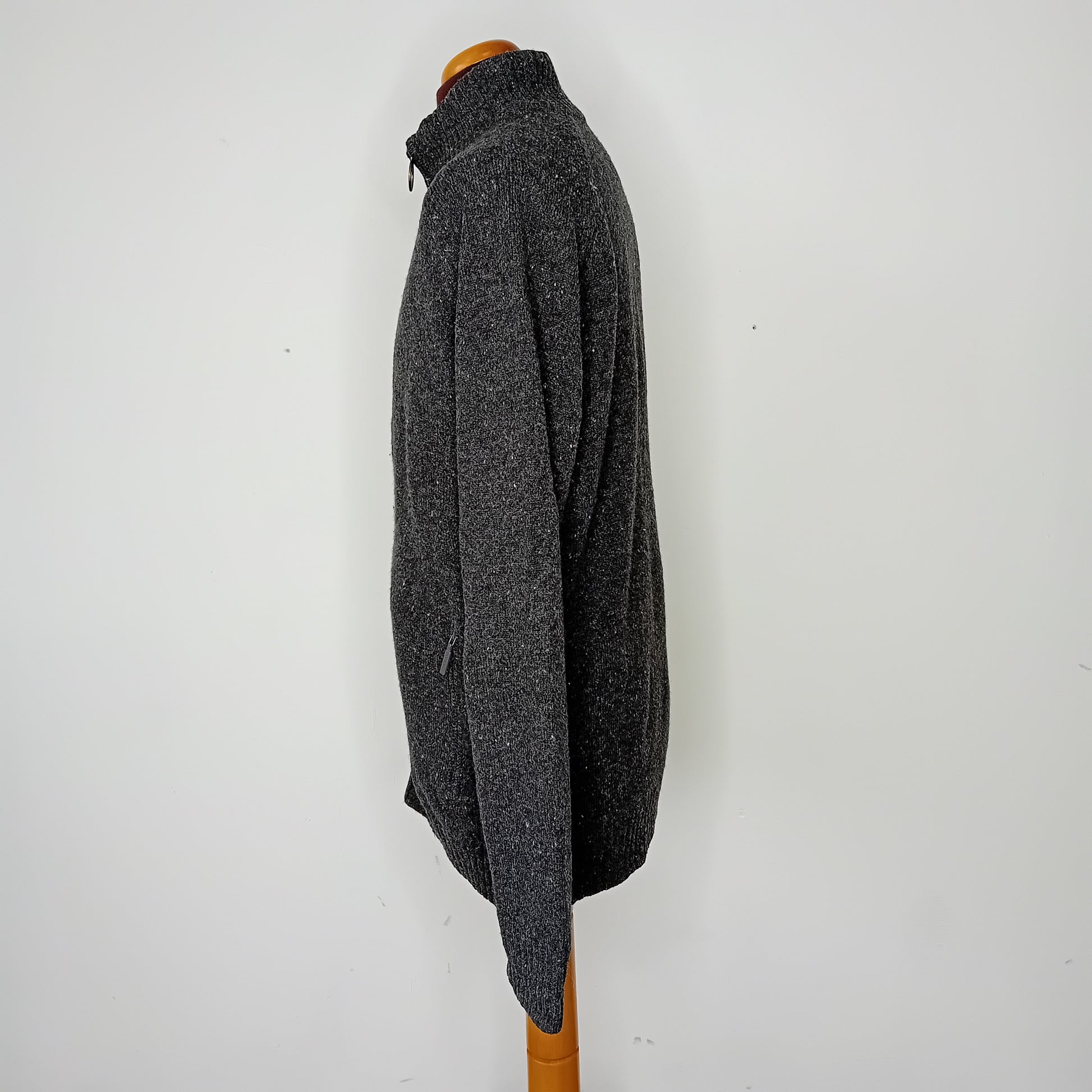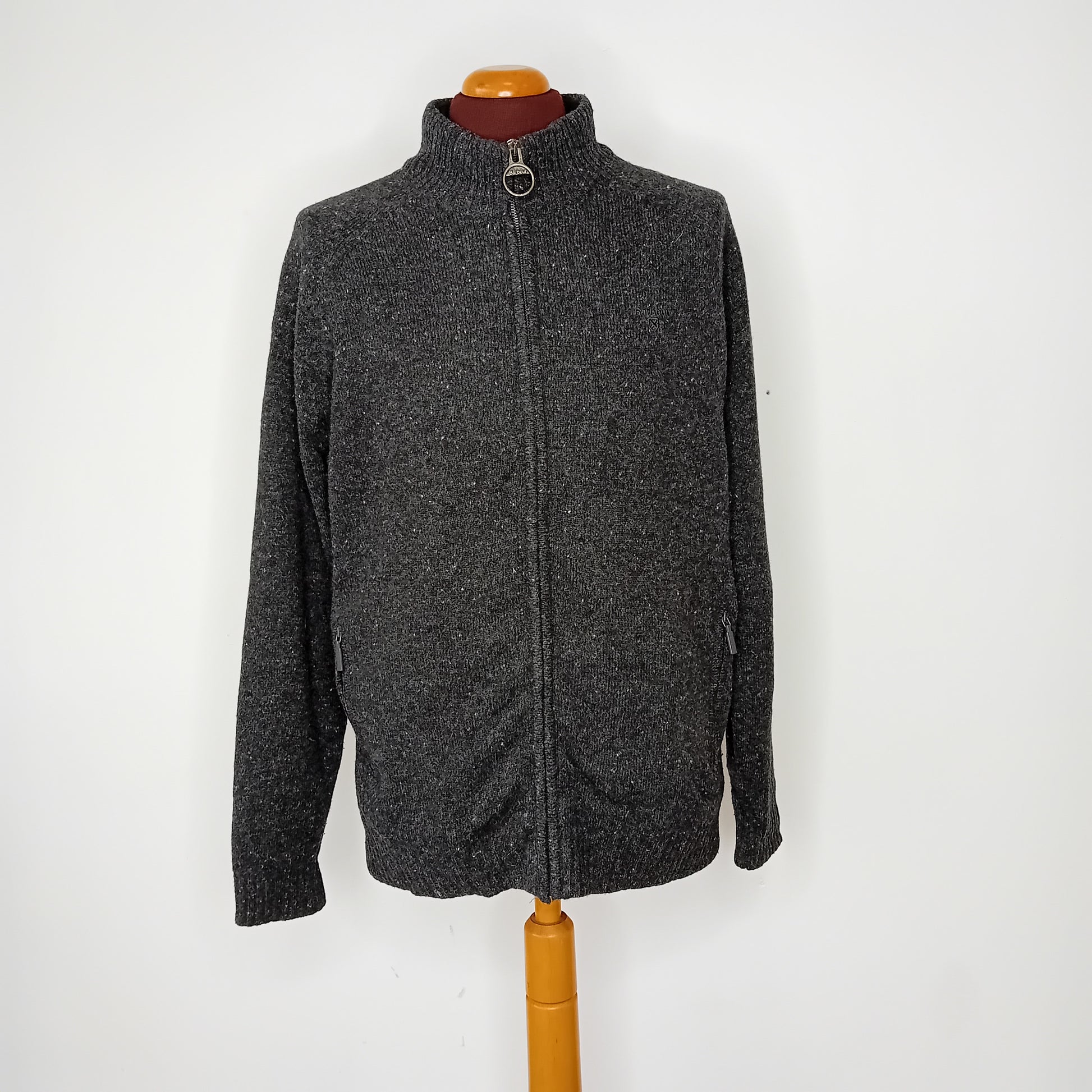 Cardigan BARBOUR, grigio melange, maniche raglan, chiusura a zip, doppia tasca a zip, interamente foderato. Amato, leggermente scucita la fodera nell'ascella interna. Molto ben conservato.