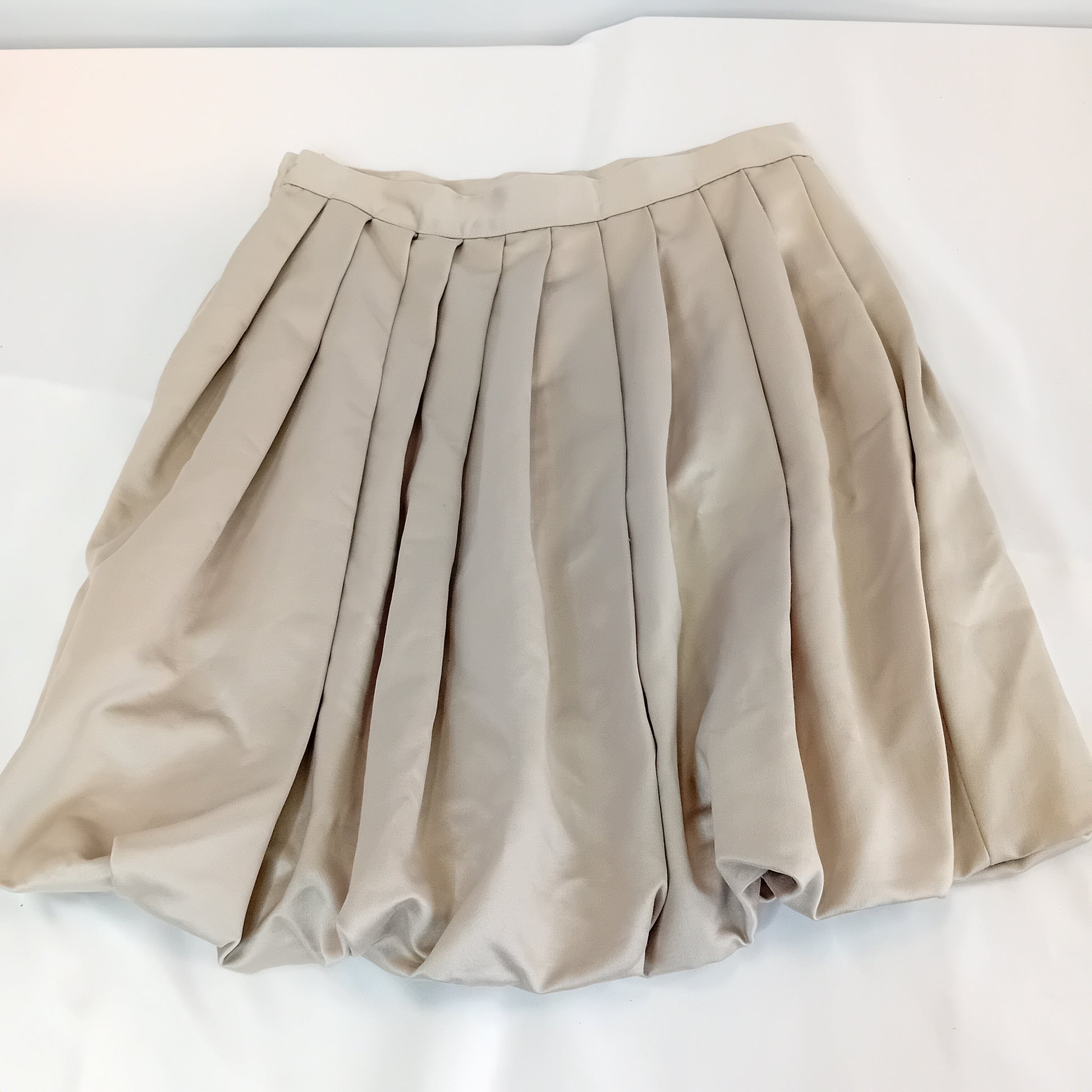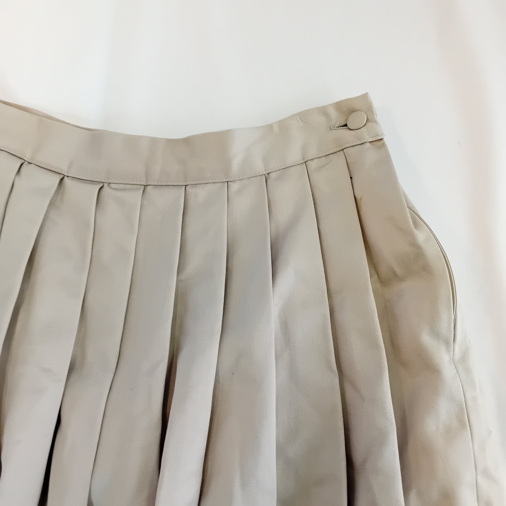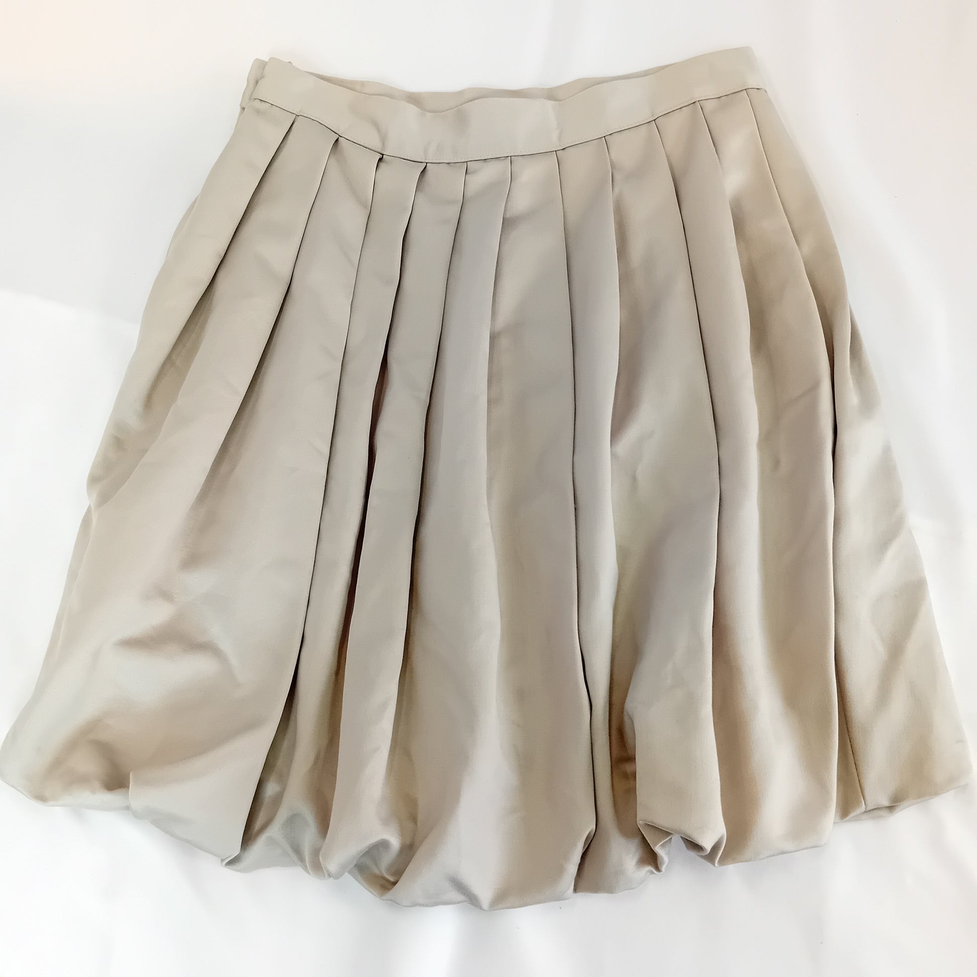 Mini gonna vintage BLUMARINE by ANNA MOLINARI, a pieghe e palloncino, grigio perla, senza tasche, interamente foderata. Amata, presenta una macchia vicino alla cerniera. L'etichetta interna si sta staccando. Ben conservata.