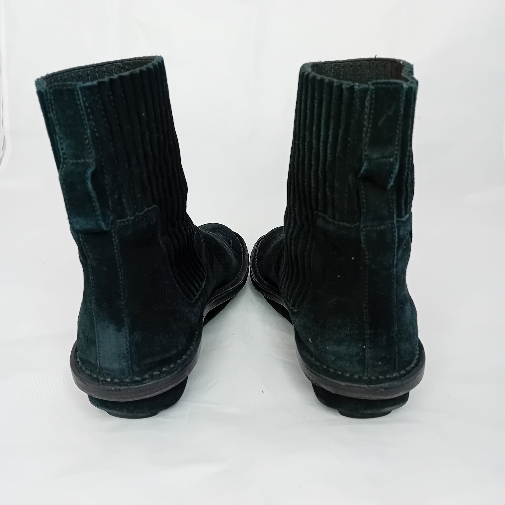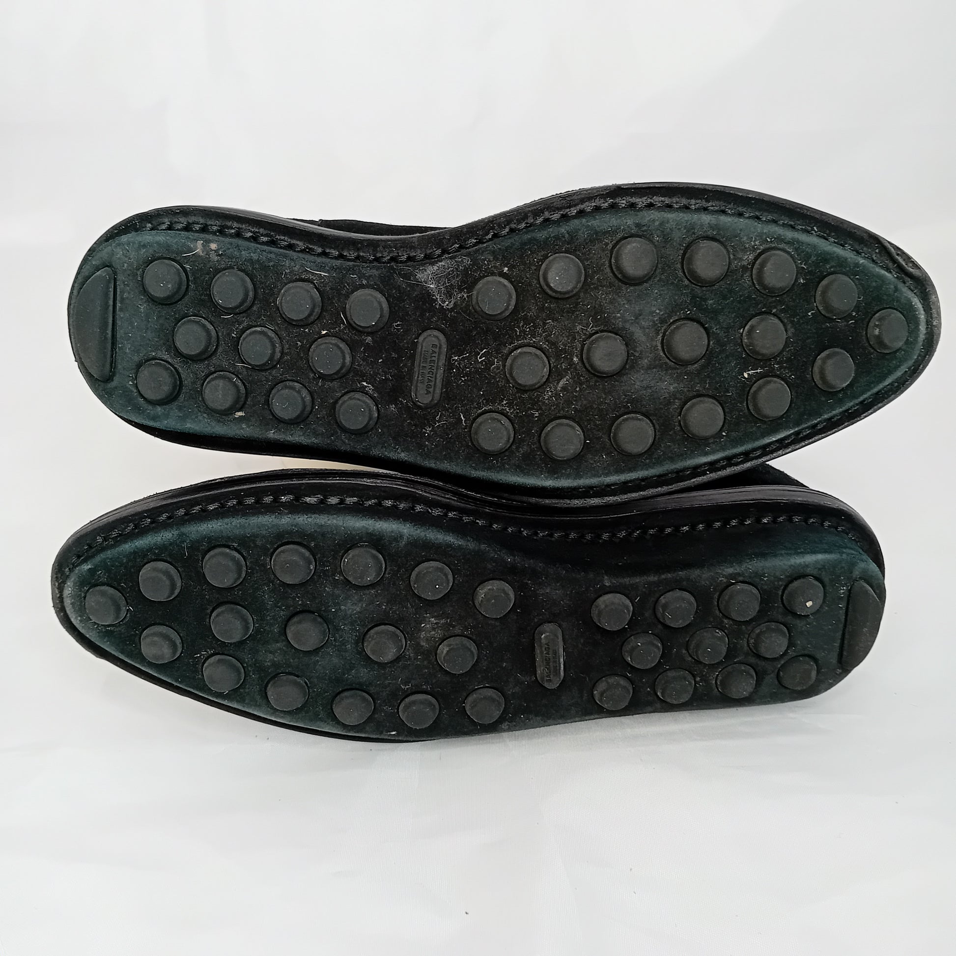 Booties BALENCIAGA in pelle nera scamosciata, leggermente a punta, con elastico alla caviglia, leggermente platform. Amati, presentano segni di utilizzo sparsi,molto ben conservati.