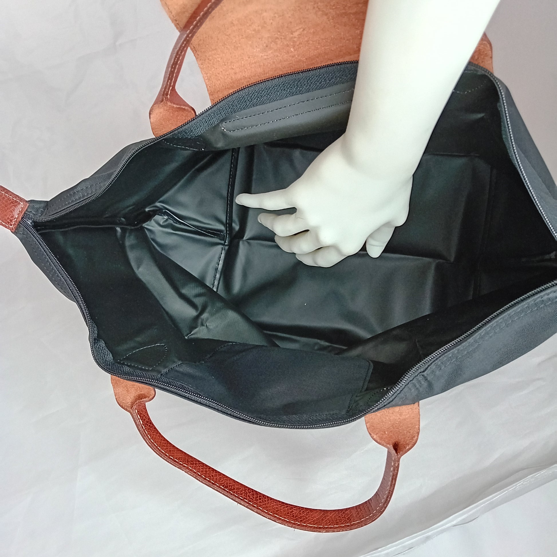 Borsa con manico LONGCHAMP, modello Sac pliant, taglia M, in tela nera e dettagli in cuoio. Made in France. Nuova con etichetta.