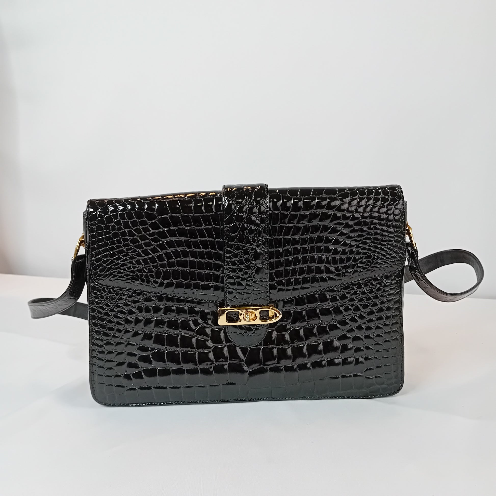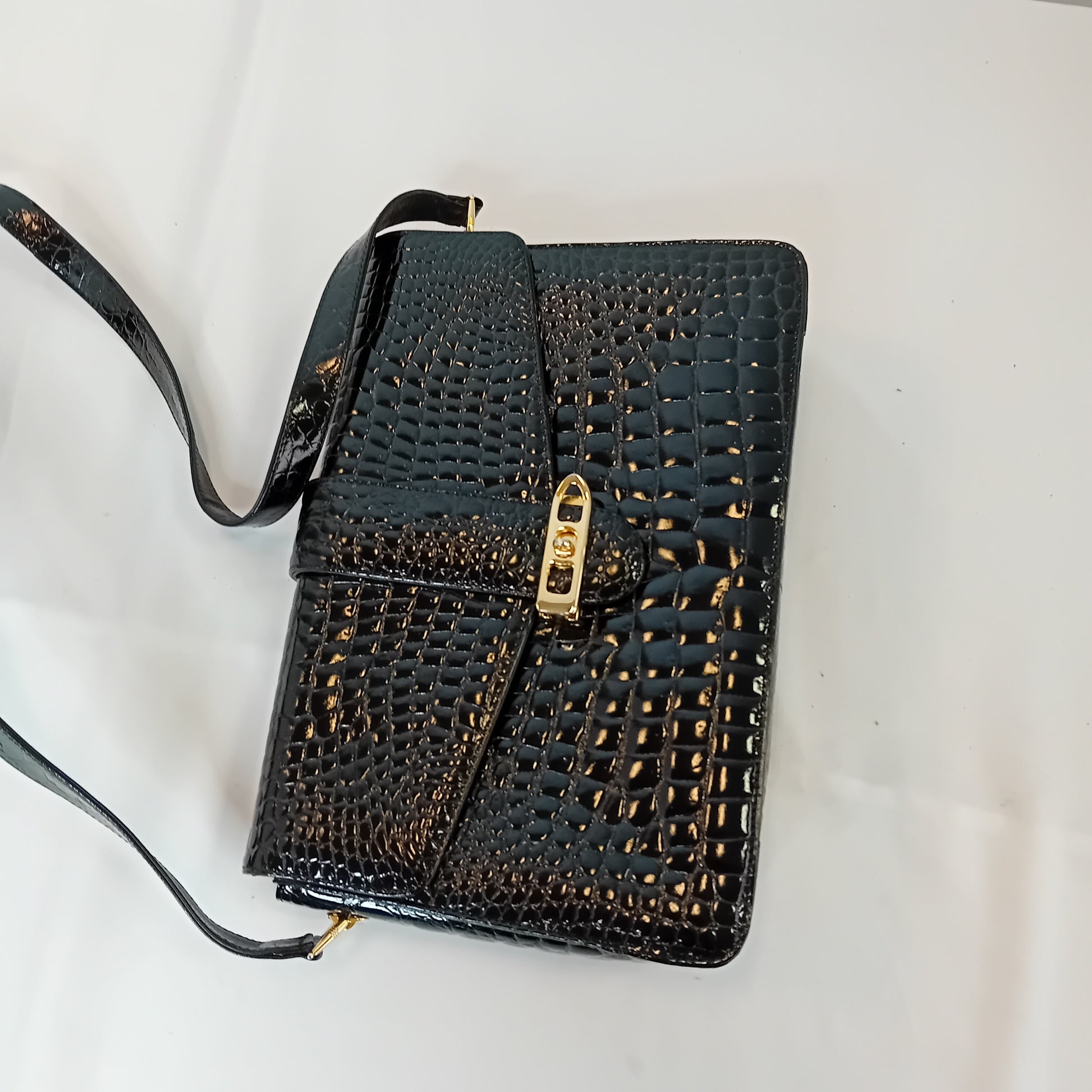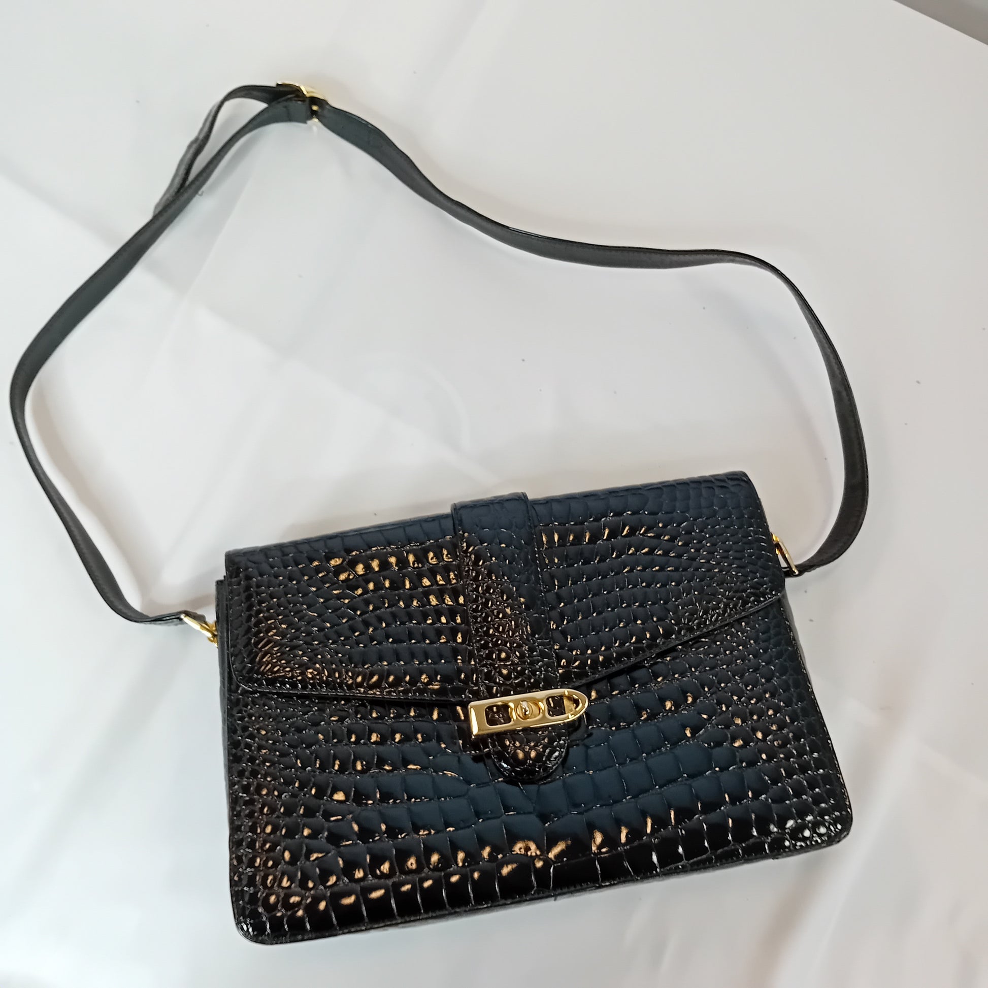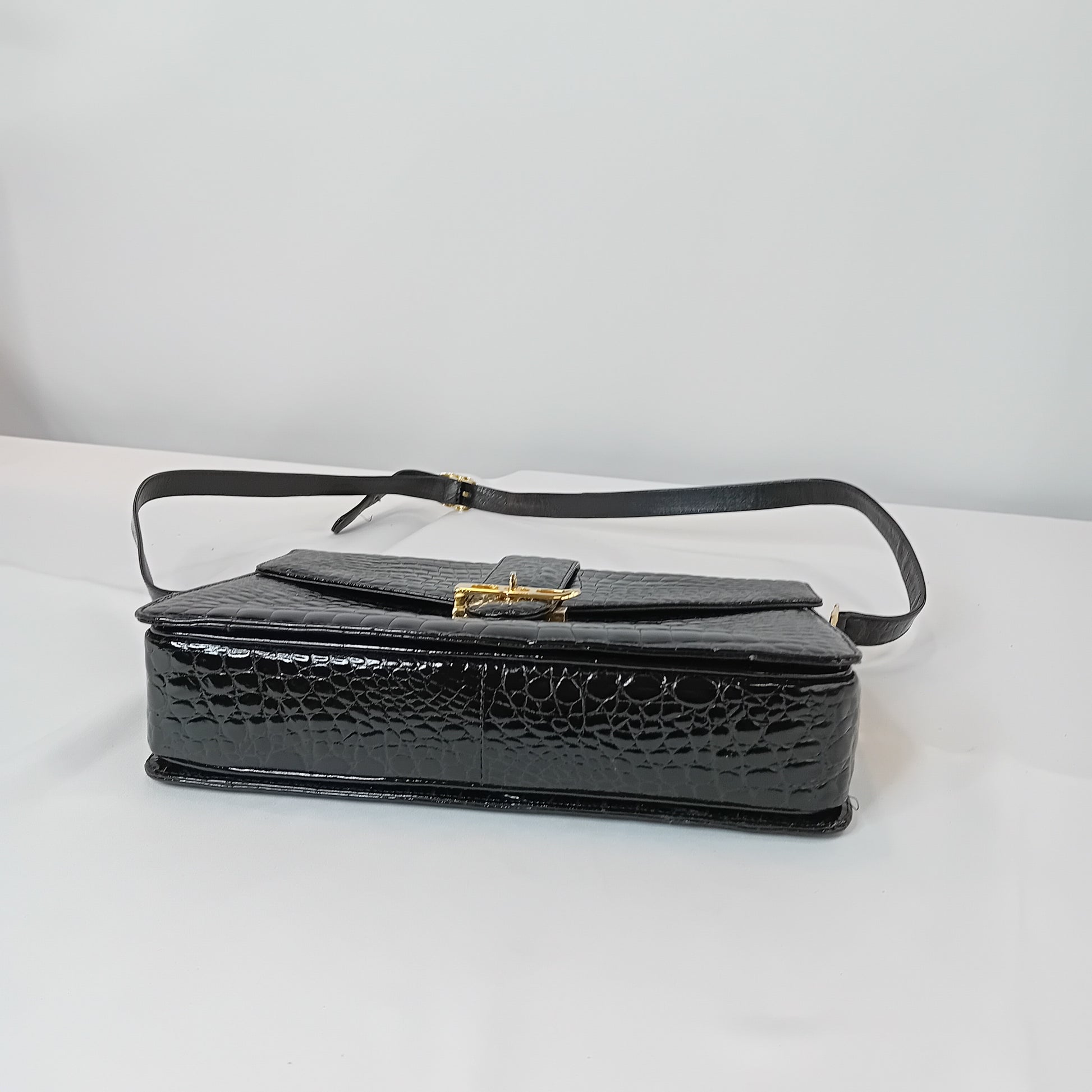 Borsa vintage in coccodrillo nero, a tracolla regolabile, con patta, chiusura manuale, interno a tre scomparti, con tre tasche di cui una con zip. Scarsamente amata, ottimamente conservata.