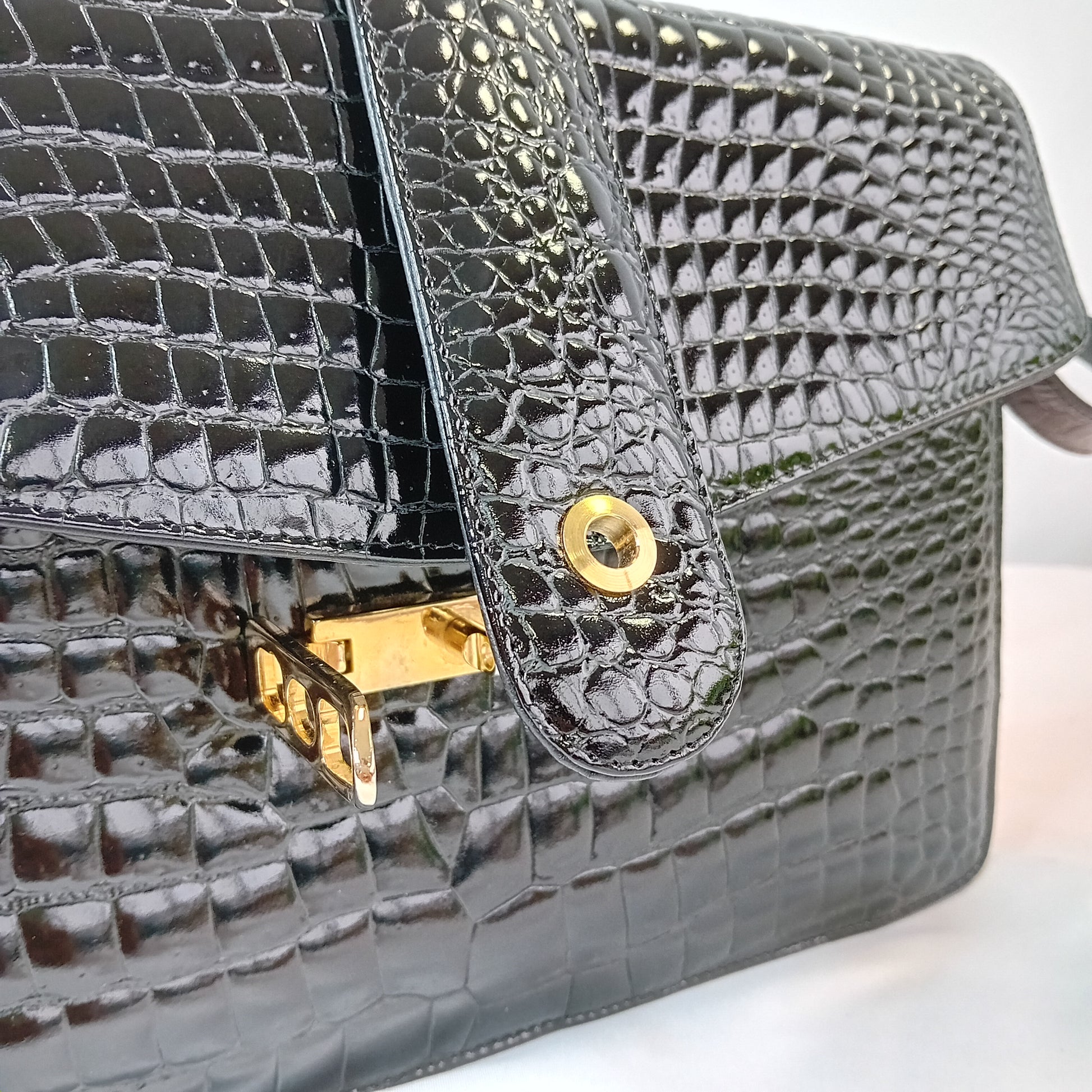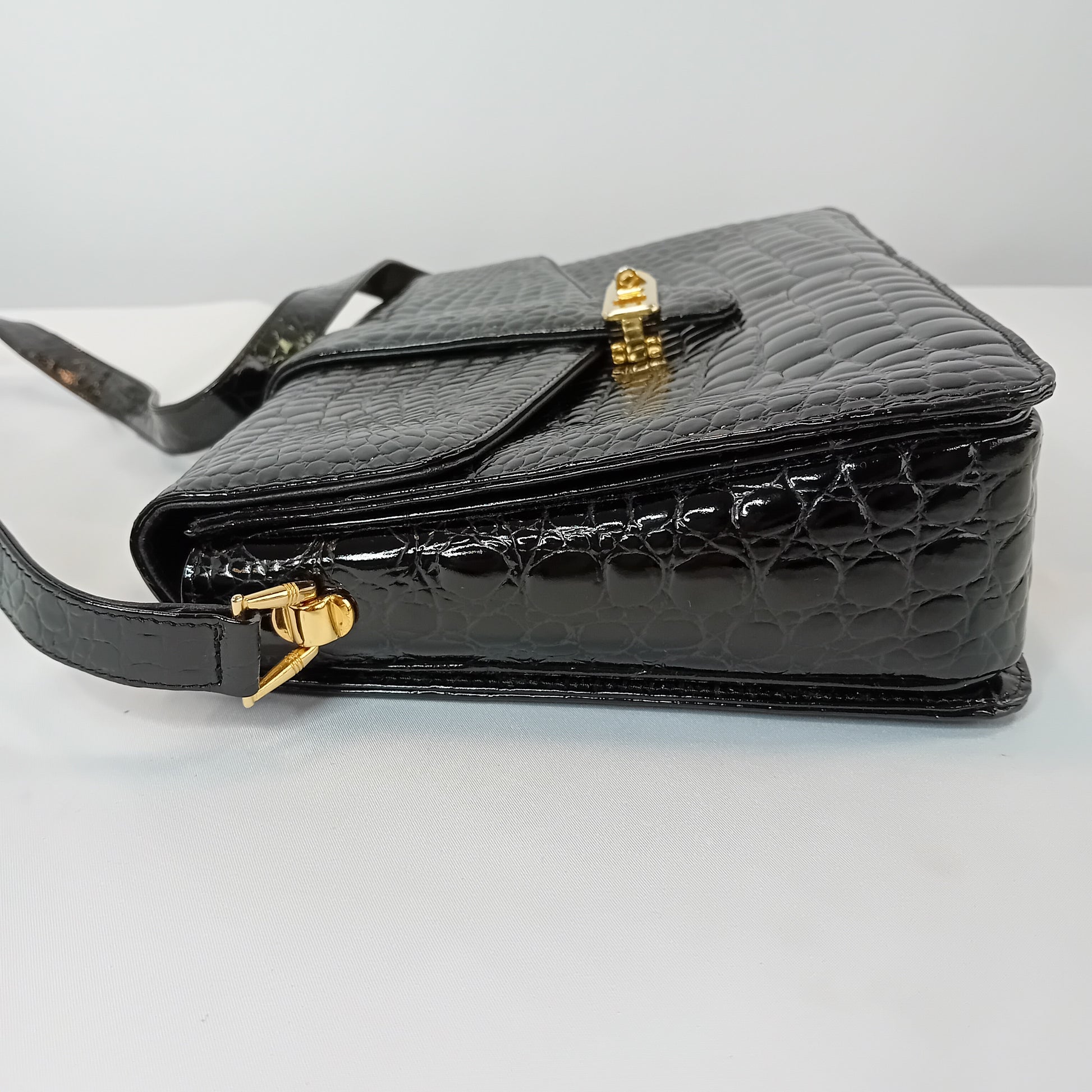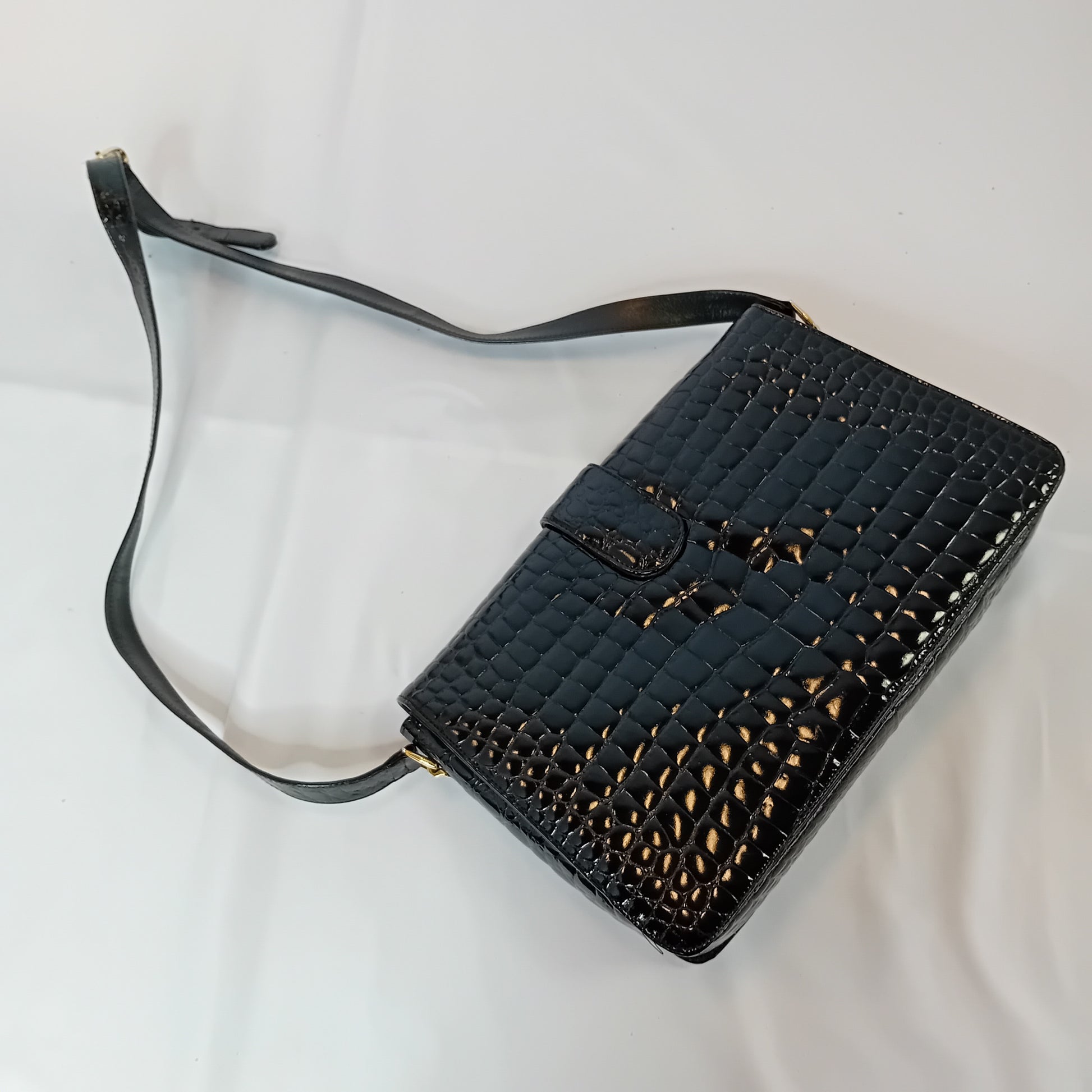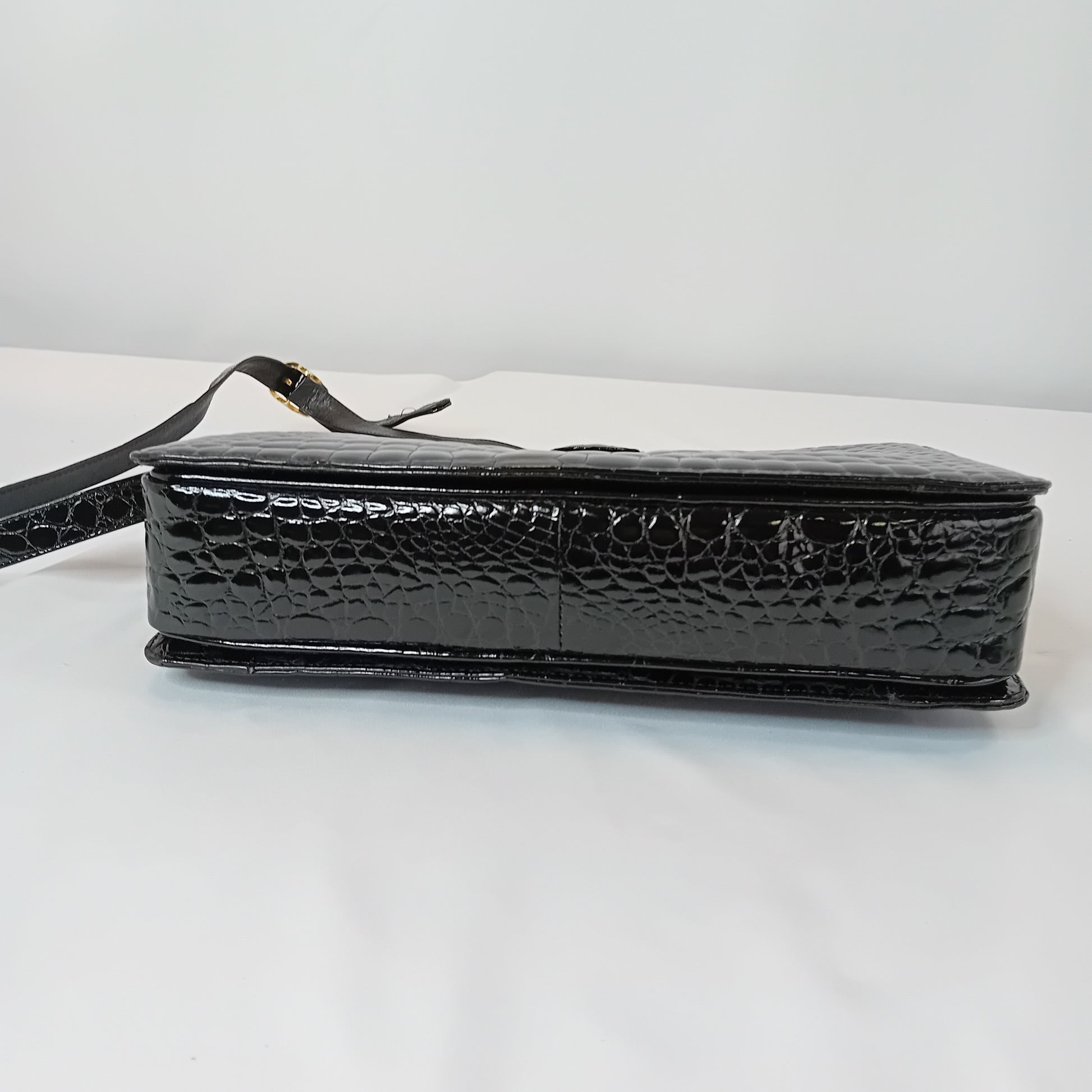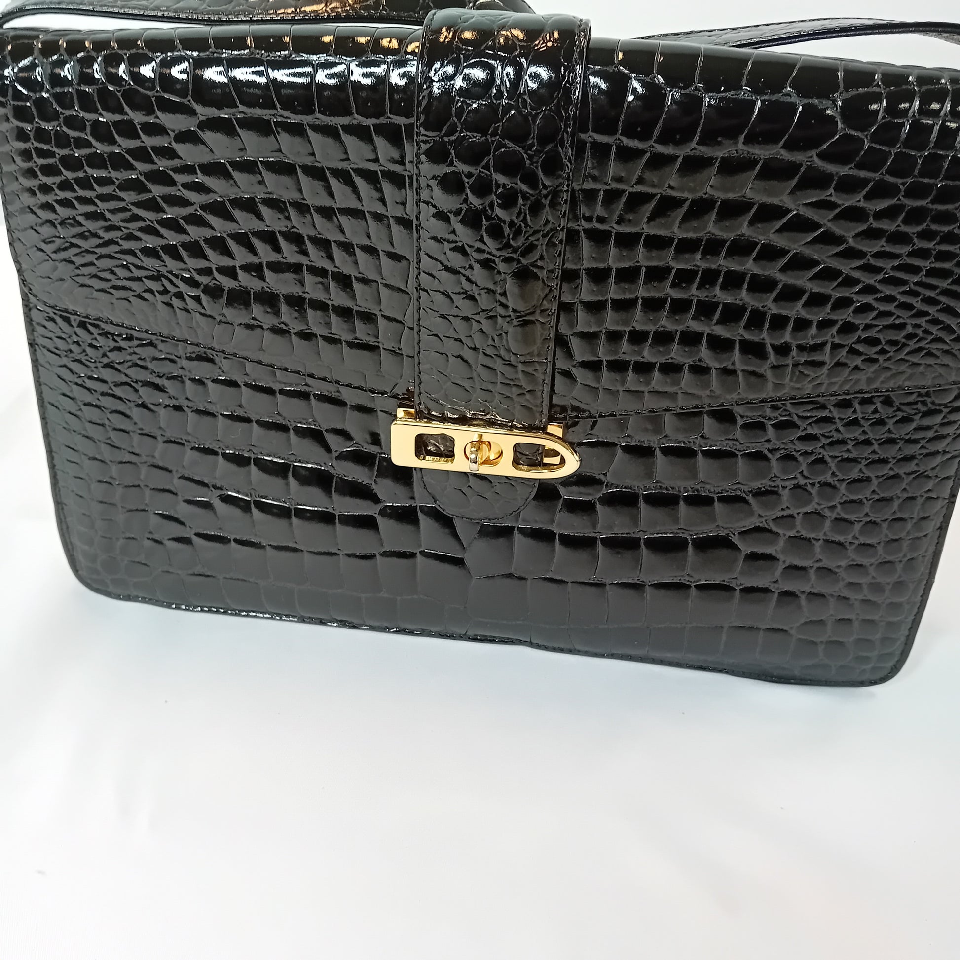 Borsa vintage in coccodrillo nero, a tracolla regolabile, con patta, chiusura manuale, interno a tre scomparti, con tre tasche di cui una con zip. Scarsamente amata, ottimamente conservata.