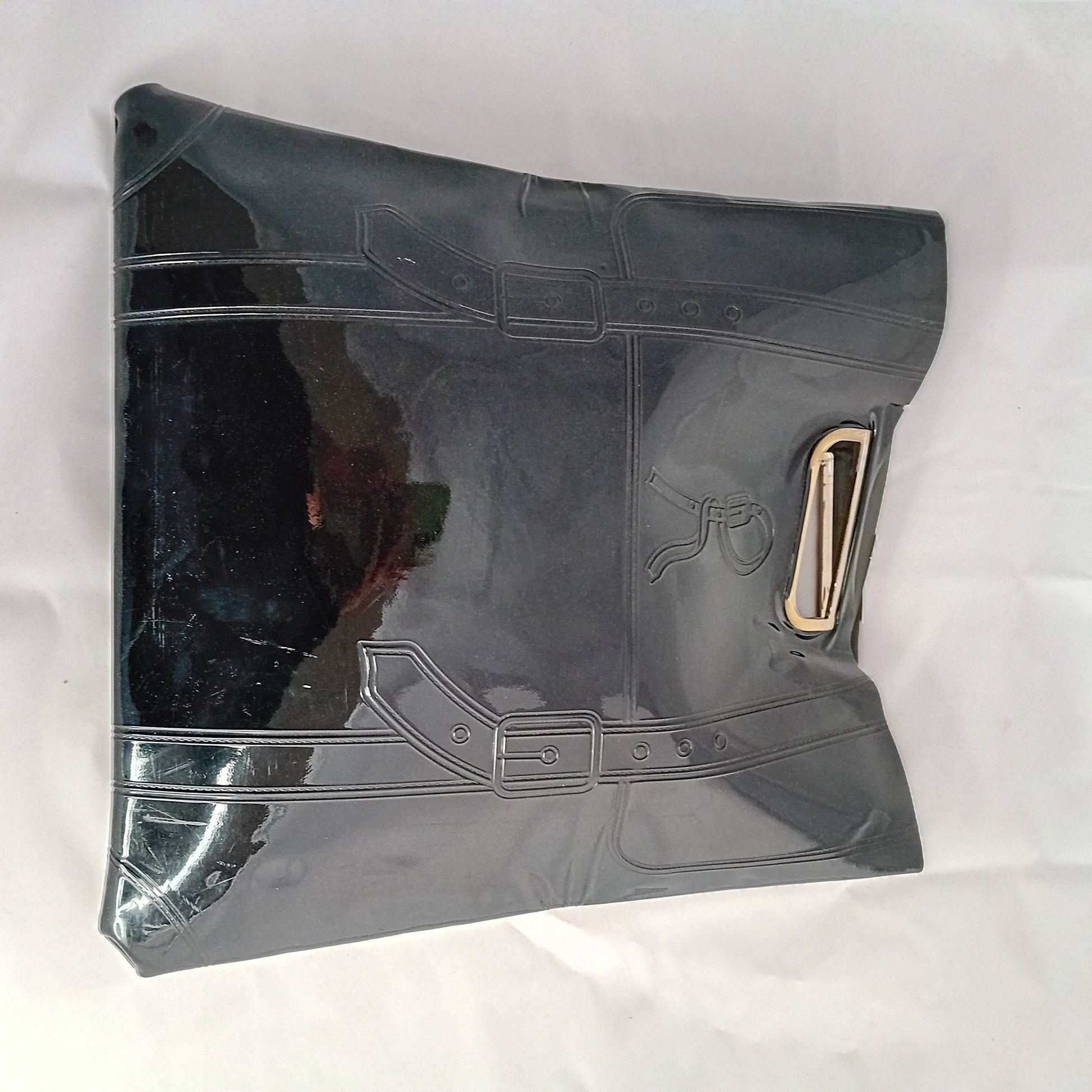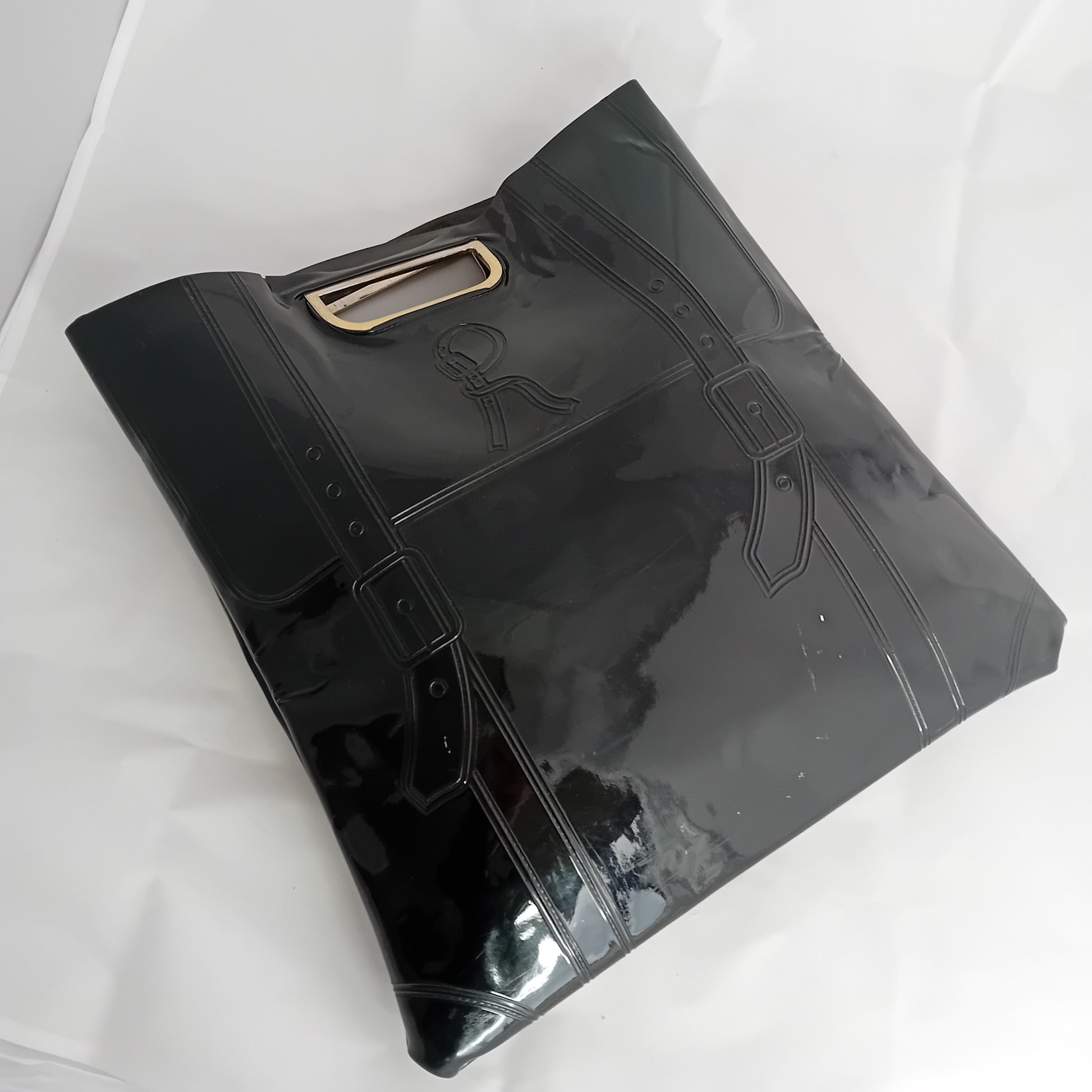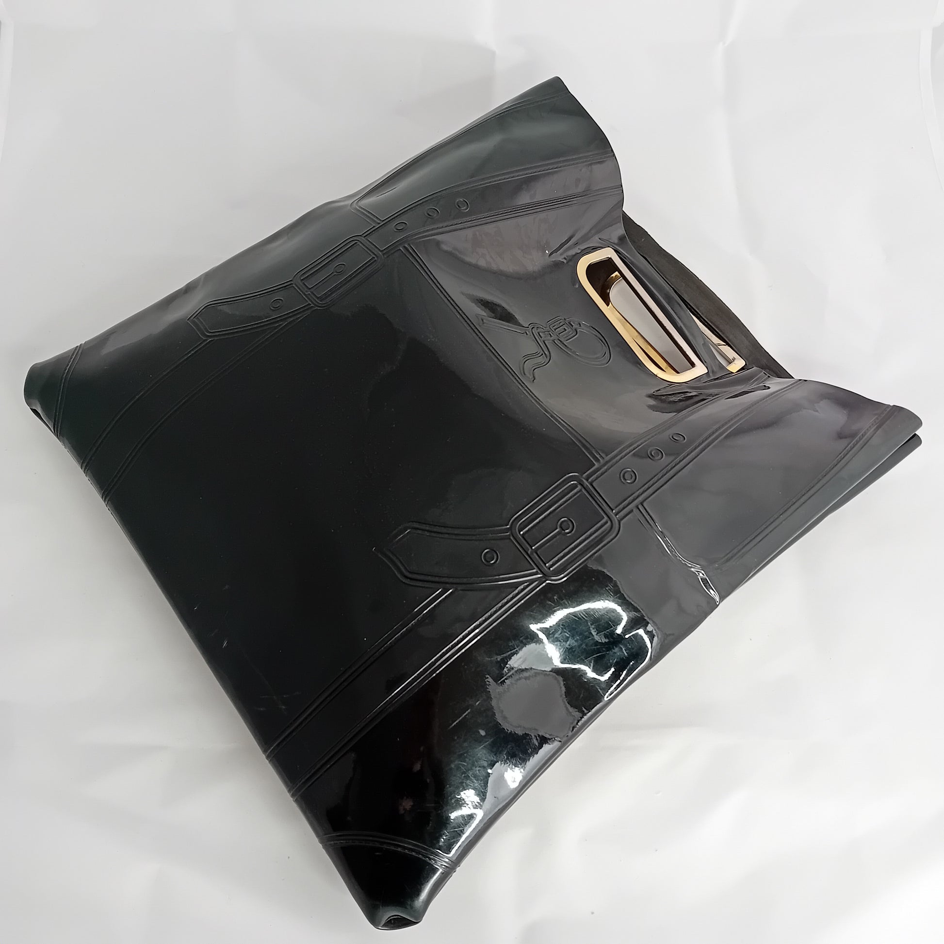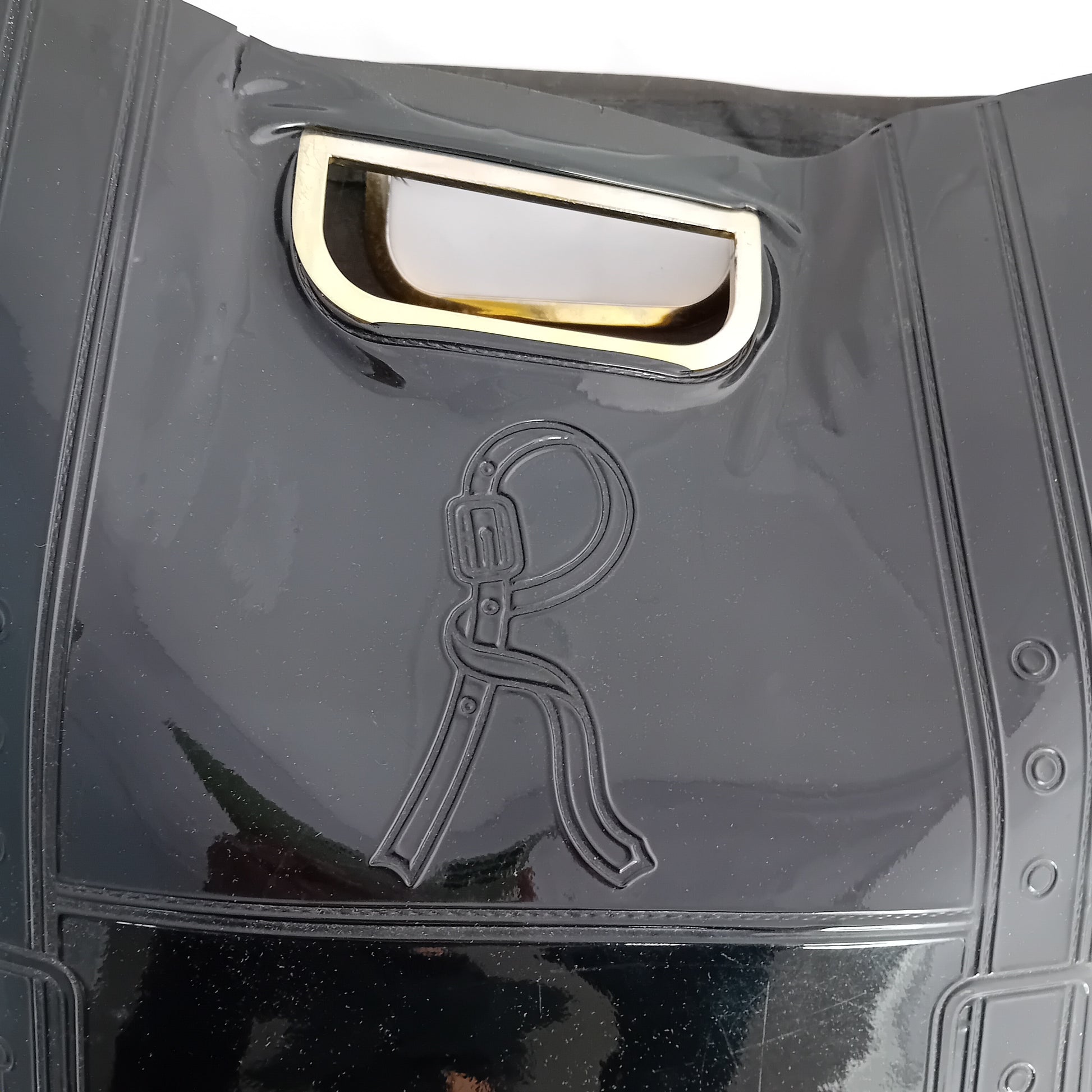 Borsa vintage ROBERTA DI CAMERINO, in vinile nero, da portare a mano, con impugnatura in metallo dorato, interno ad un unico scomparto. Buone, esternamente presenta segni di utilizzo sparsi. Si sta scollando il profilo interno superiore e leggermente anche attorno ai manici.