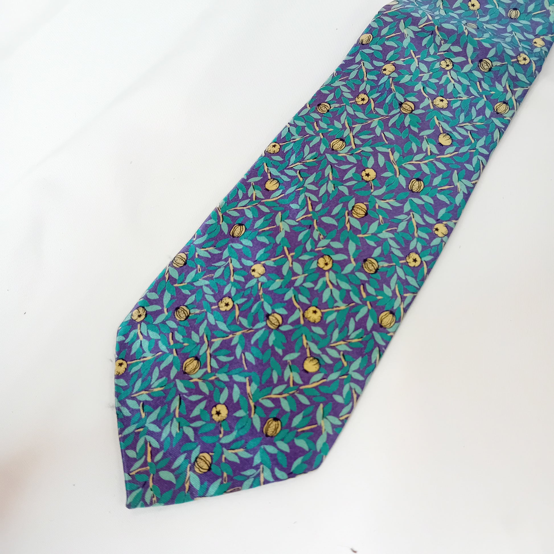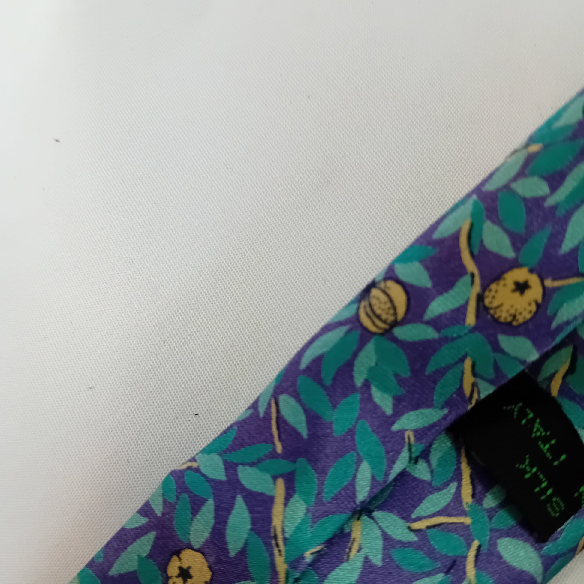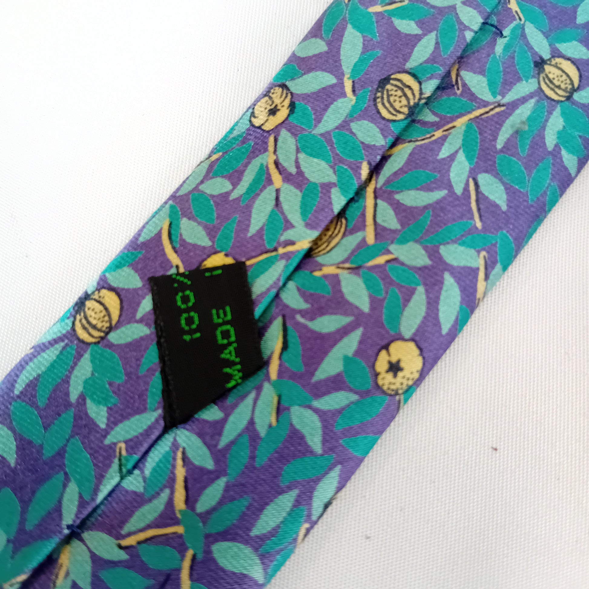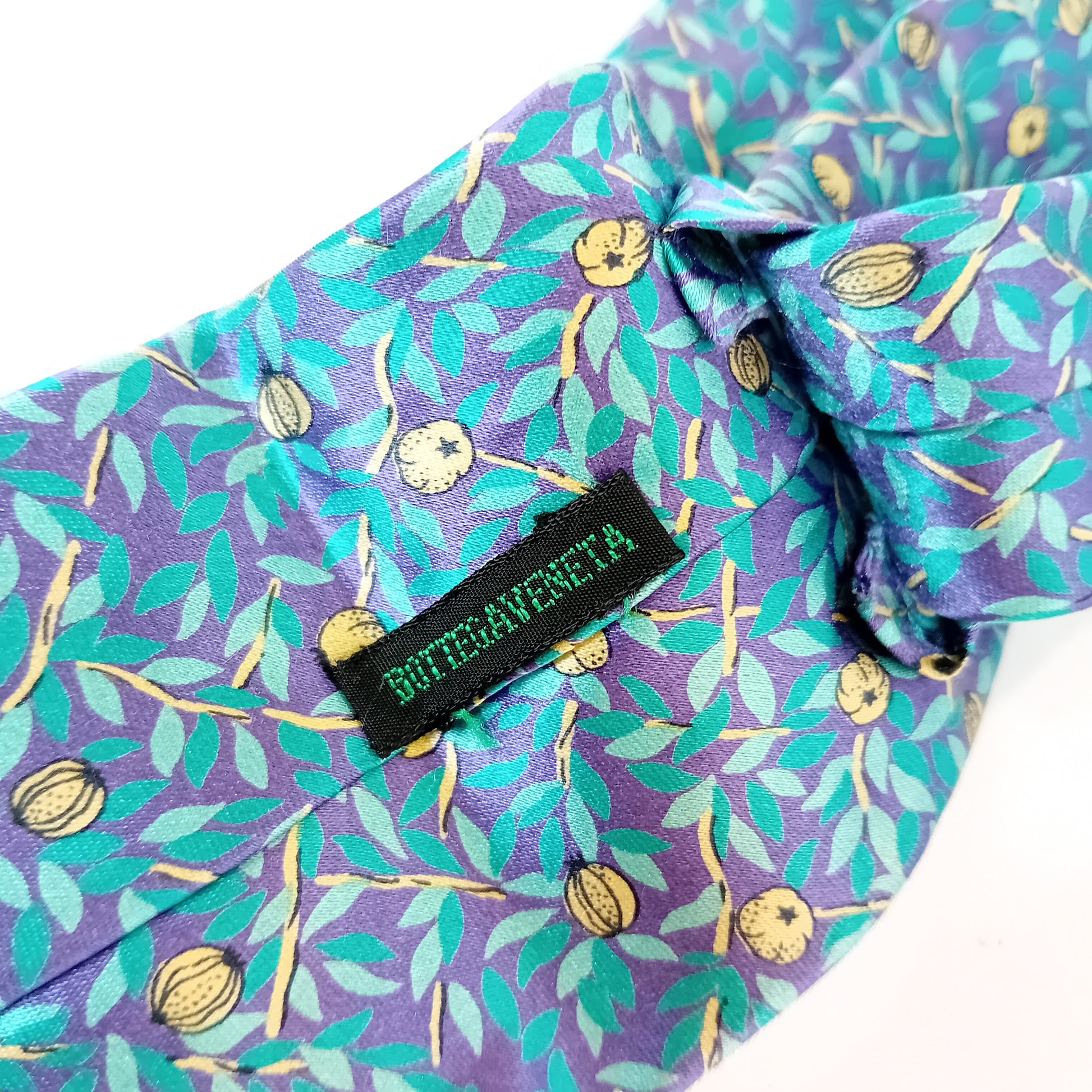 Cravatta vintage in seta BOTTEGA VENETA, con stampa a frutti e foglie su sfondo viola. Amata, qualche impercettibile filo tirato frontalmente e una scucitura nella parte interna posteriore. nel complesso molto ben conservata.