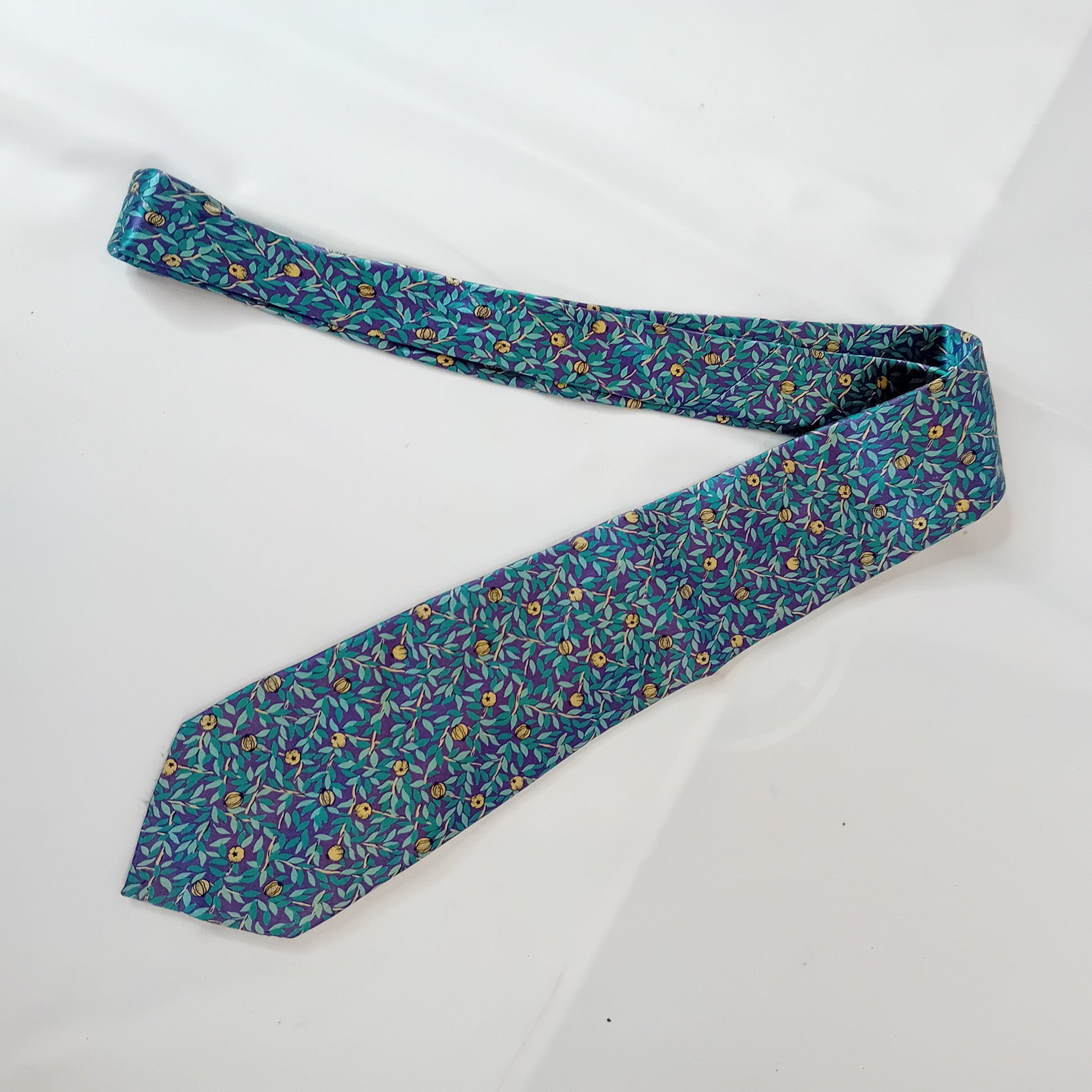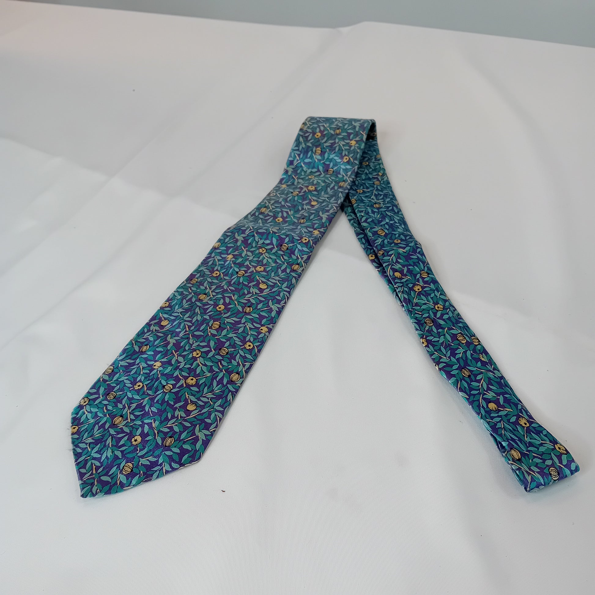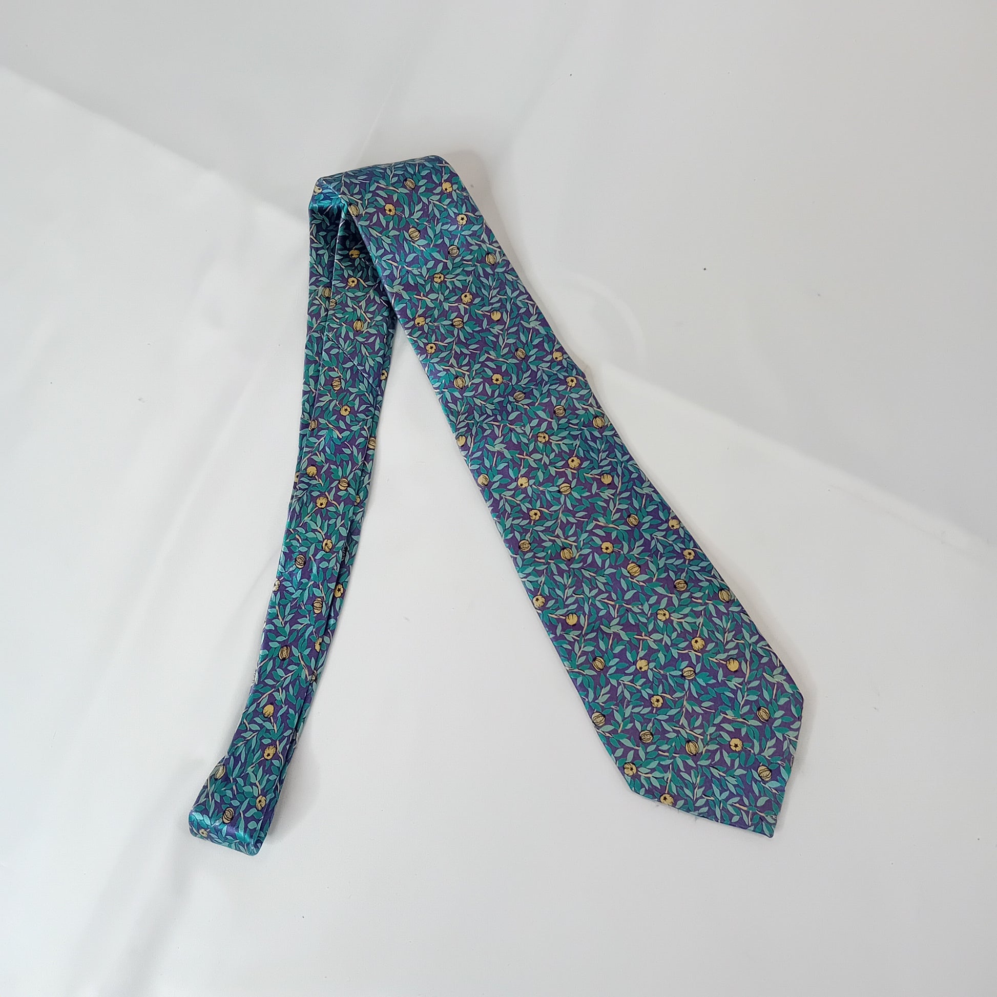 Cravatta vintage in seta BOTTEGA VENETA, con stampa a frutti e foglie su sfondo viola. Amata, qualche impercettibile filo tirato frontalmente e una scucitura nella parte interna posteriore. nel complesso molto ben conservata.