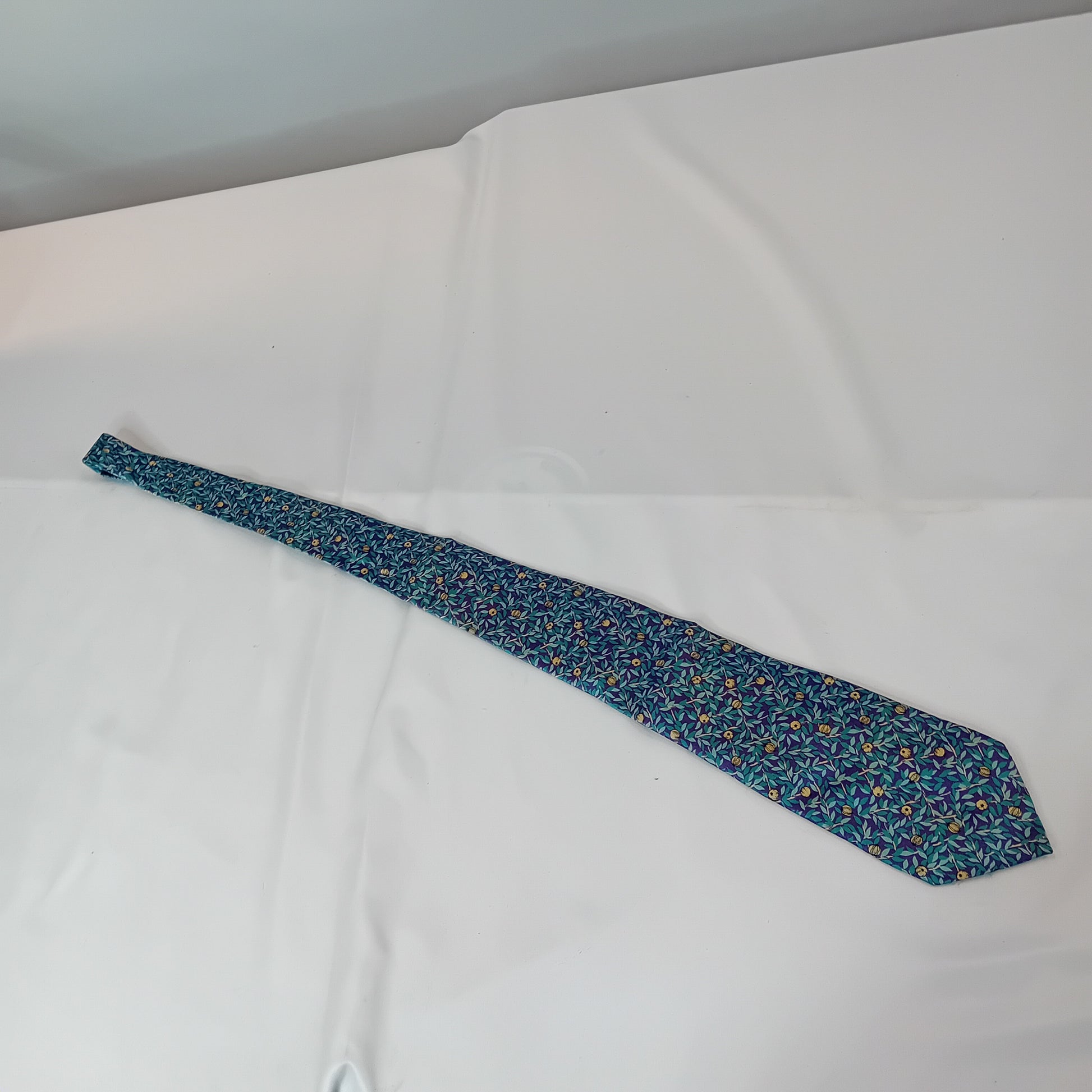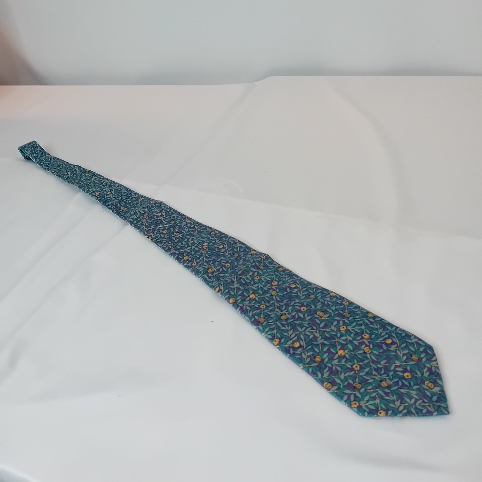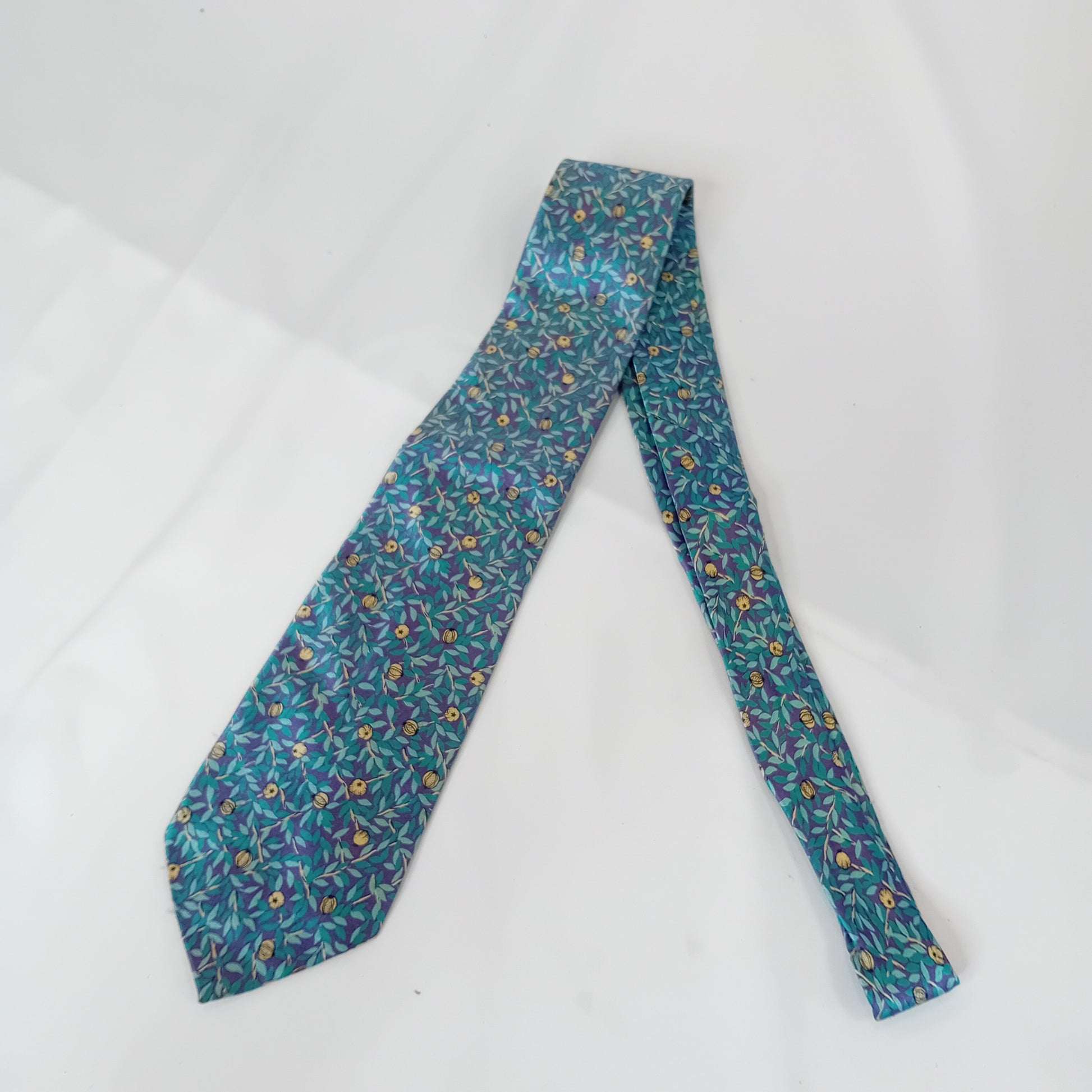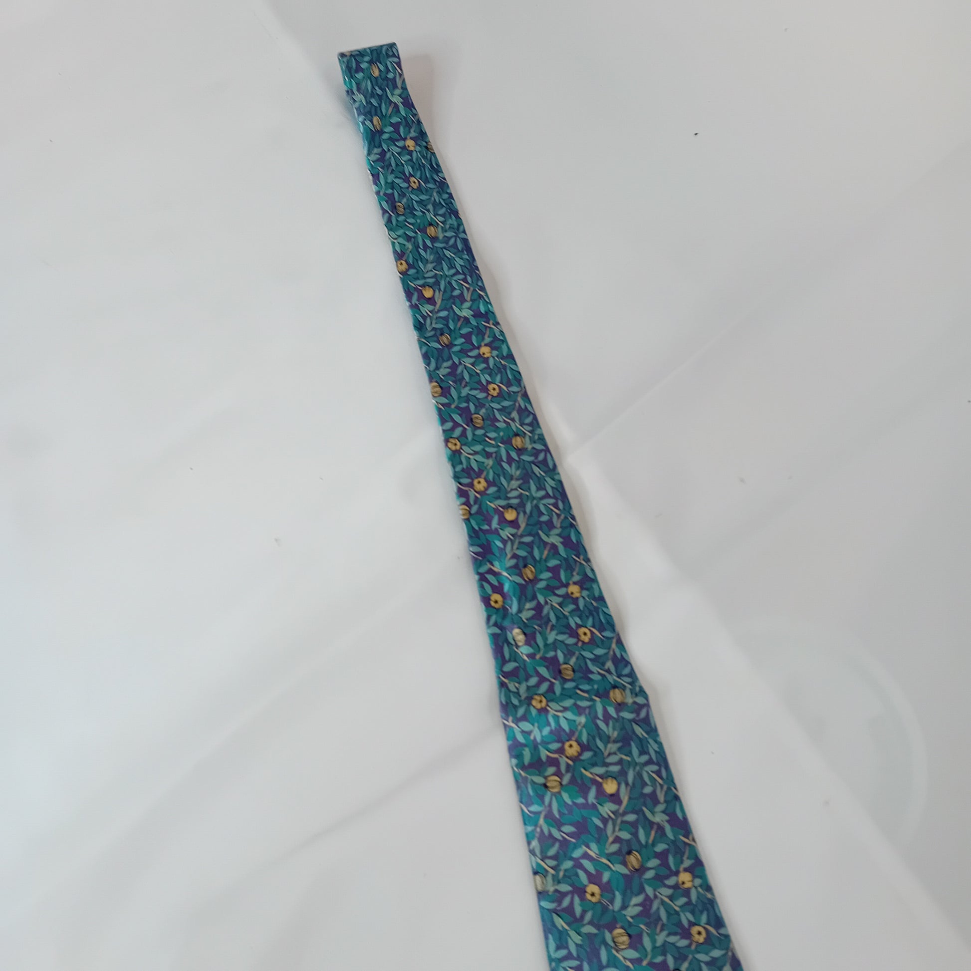 Cravatta vintage in seta BOTTEGA VENETA, con stampa a frutti e foglie su sfondo viola. Amata, qualche impercettibile filo tirato frontalmente e una scucitura nella parte interna posteriore. nel complesso molto ben conservata.