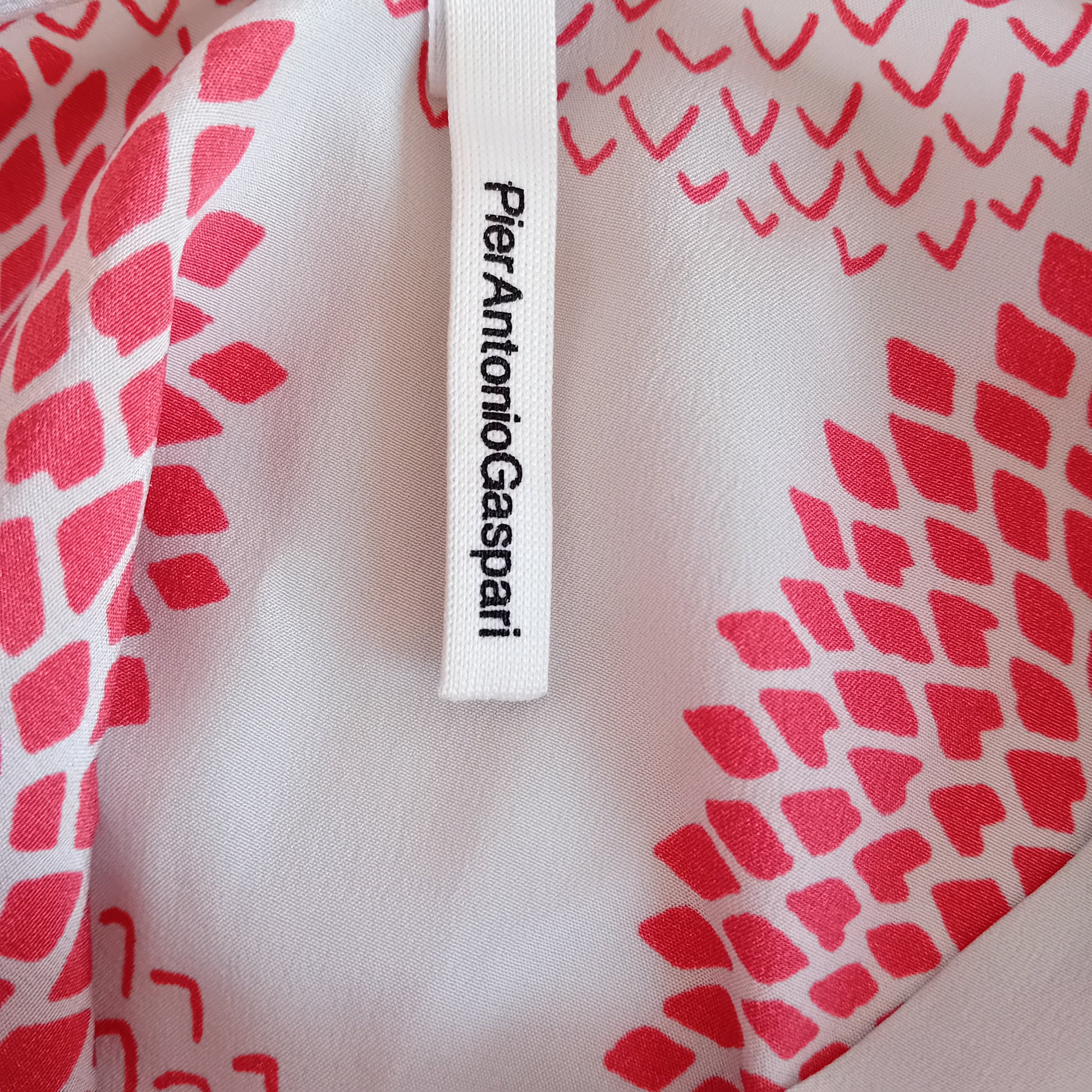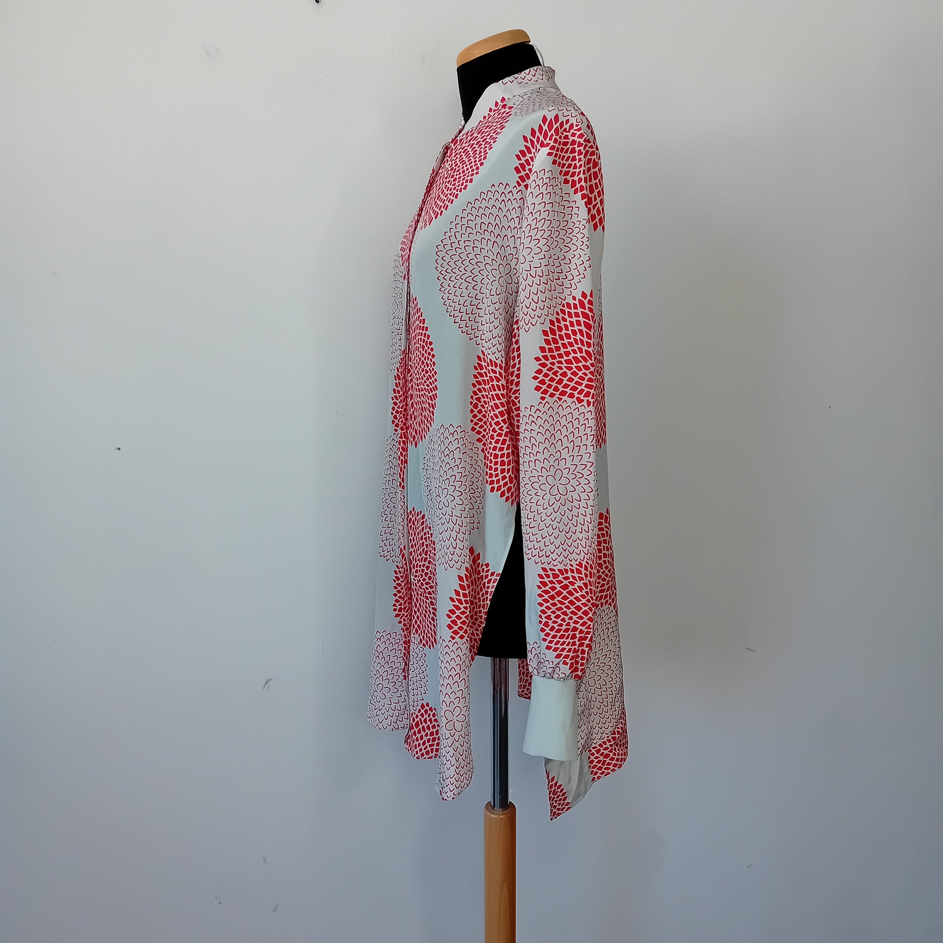 Camicia PIER ANTONIO GASPARI, in seta grigio perla stampata a tema floreale, maniche lunghe con polsino in maglina, collo alla koreana, bottoni nascosti e ampi spacchi laterali. Made in Italy. Amata, scarsamente utilizzata, ottimamente conservata.