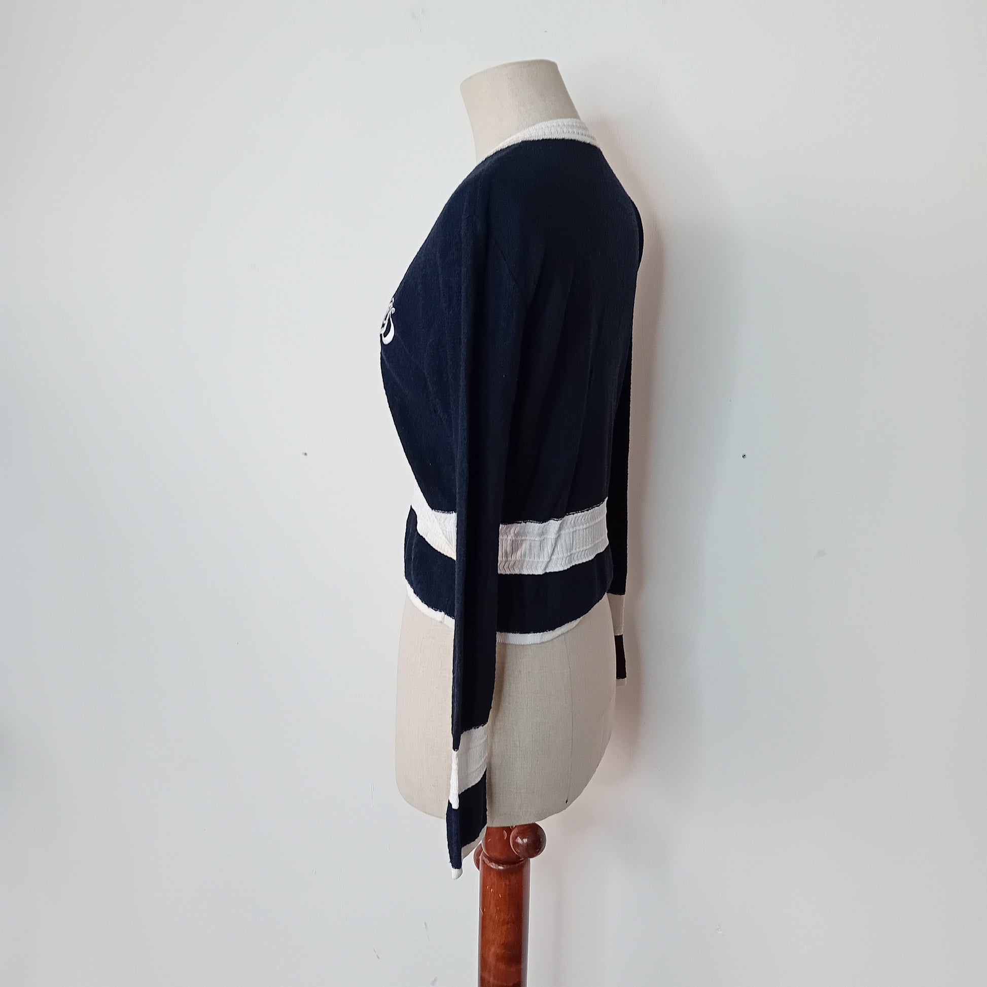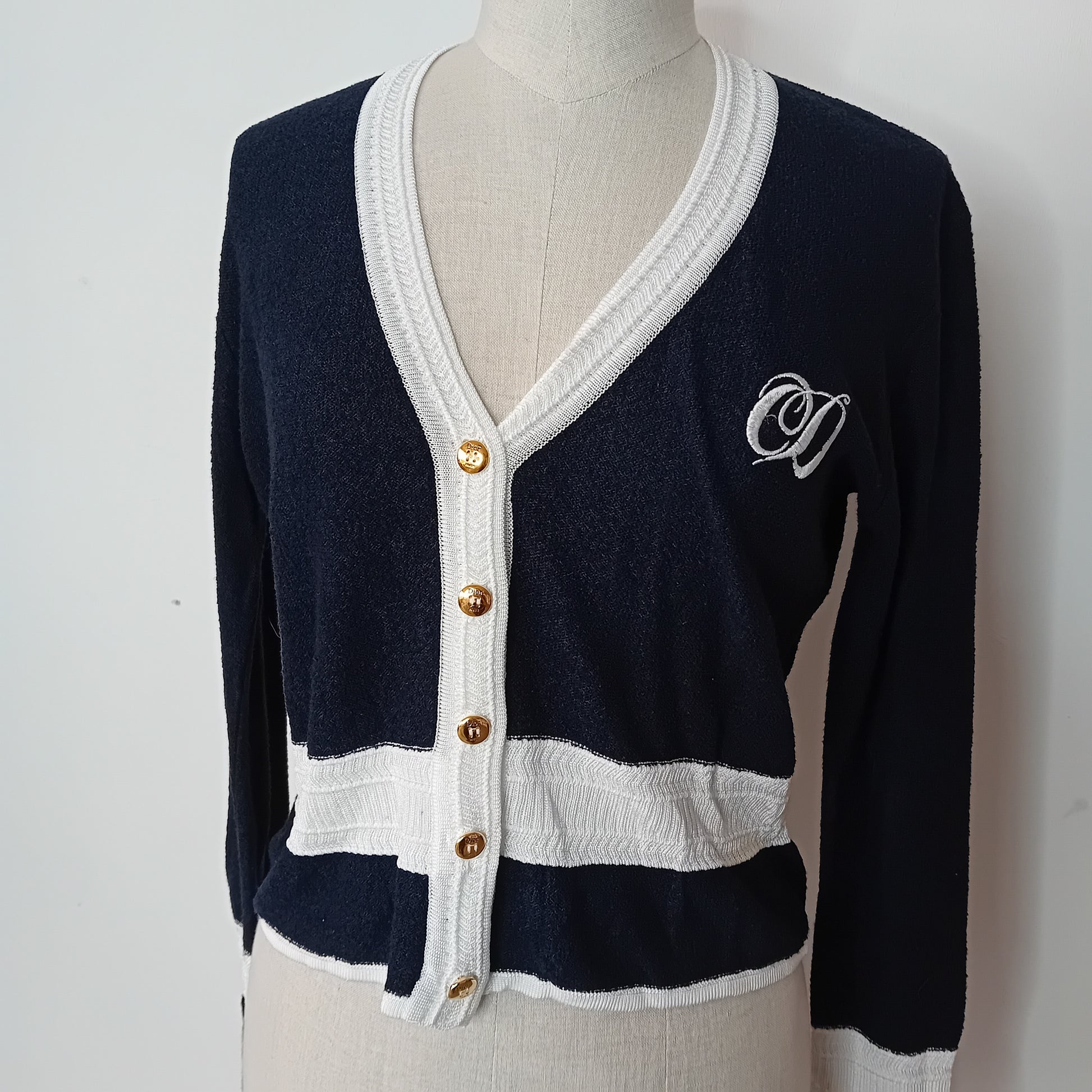 Cardigan vintage Christian DIOR, in maglina blu notte, con dettagli bianchi a contrasto, iniziali ricamate sul petto, bottoni dorati logati. Made in Italy. Amato, presenta numerose macchie lungo le parti bianche. Ben conservato.