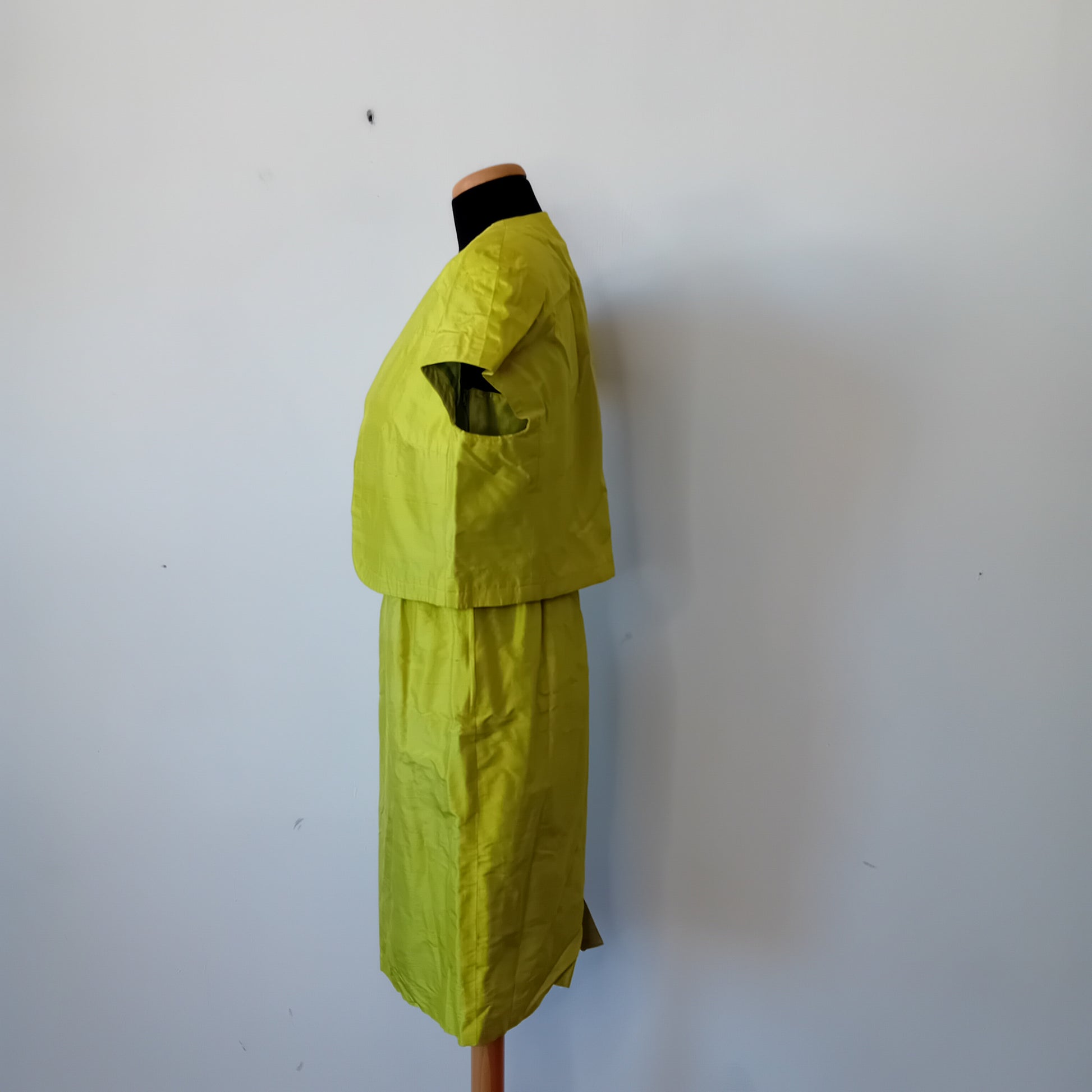 Completo vintage Mimmina, in shantung di seta verde lime, bolero a mezze maniche, con spalline rinforzate, abito a tubino, con spalline sottili, coppe pre formate, vita alta, spacco posteriore. Made in Italy. Amato, da rinfrescare, nel complesso ottimamente conservato.