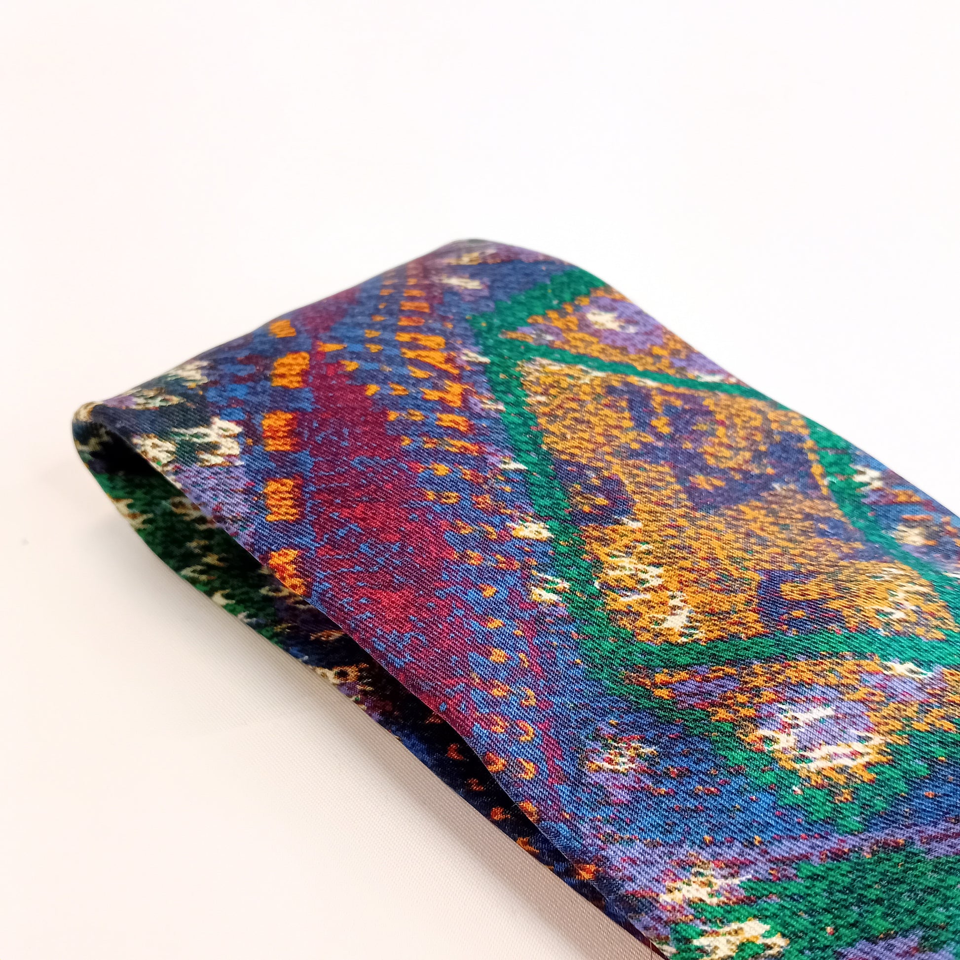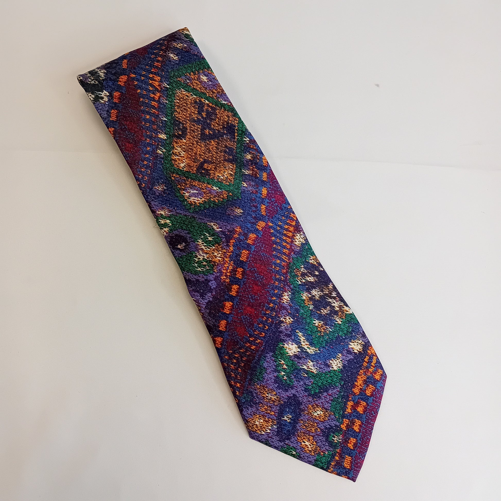 Cravatta vintage MISSONI, sui toni del viola, in fantasia effetto punto croce. Amata, ben conservata.