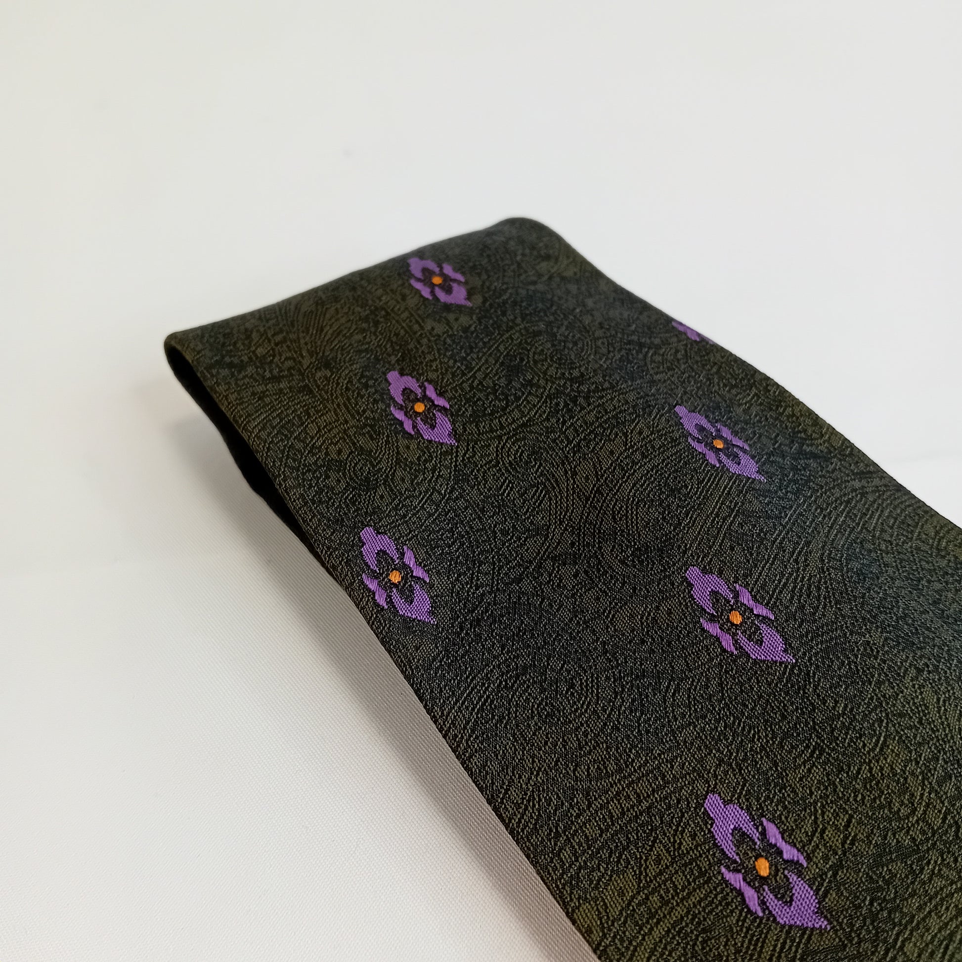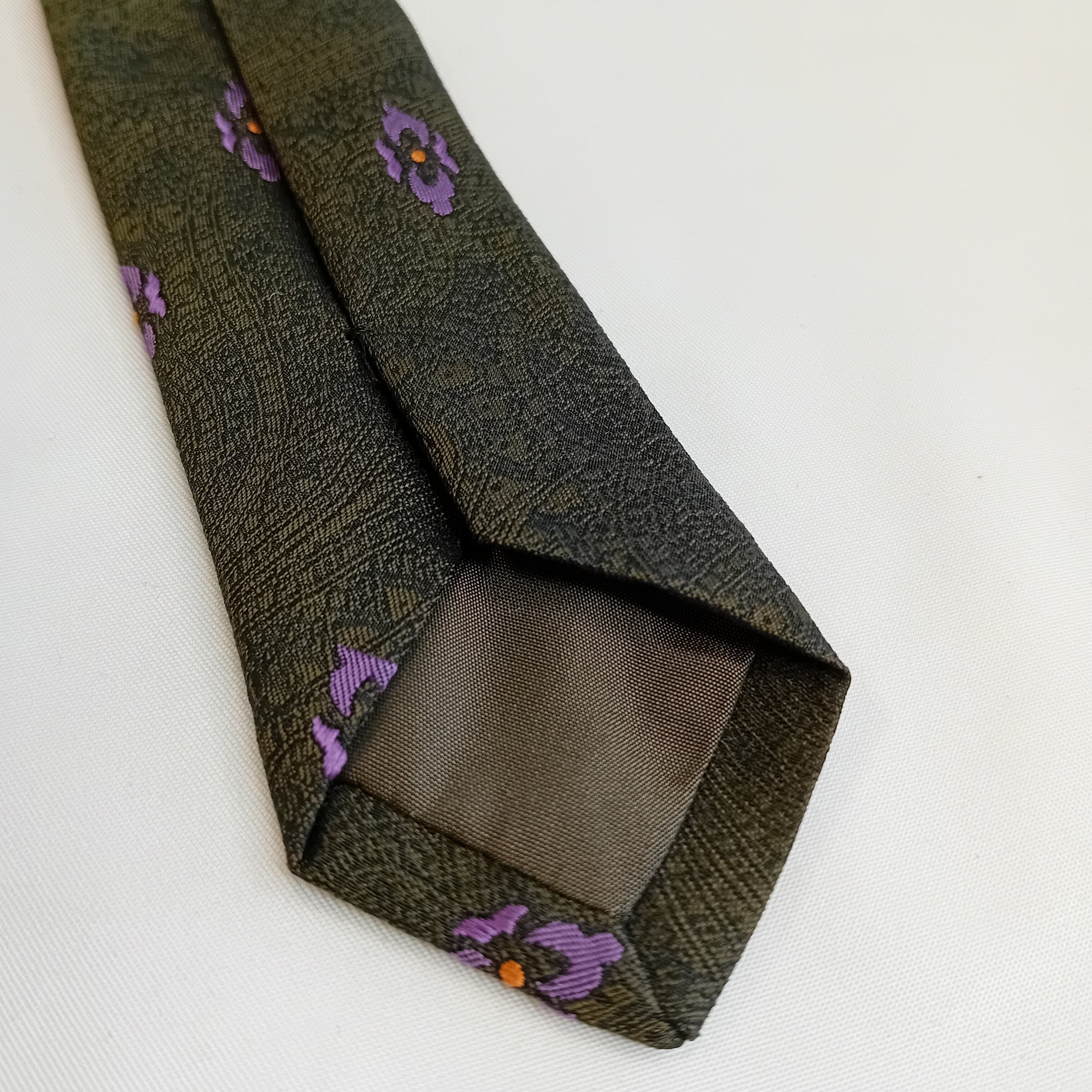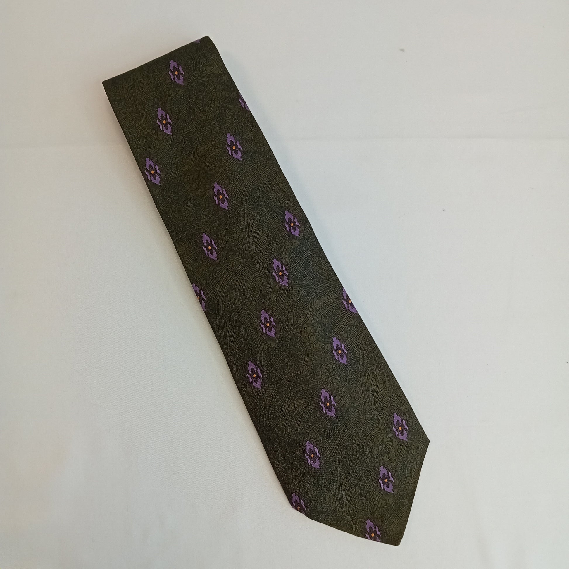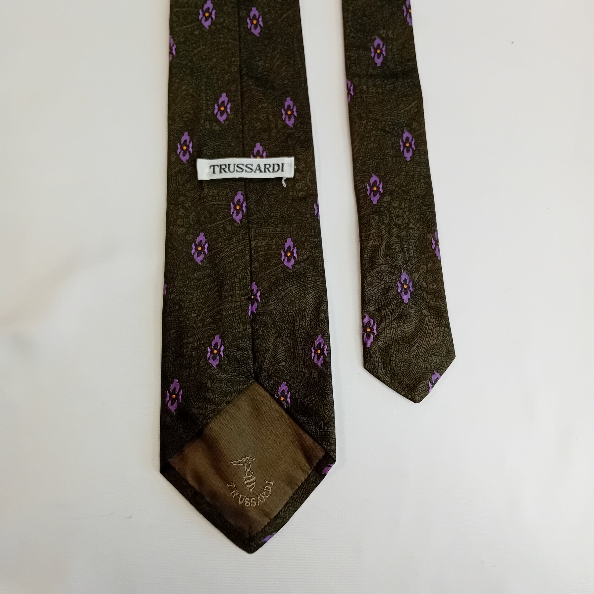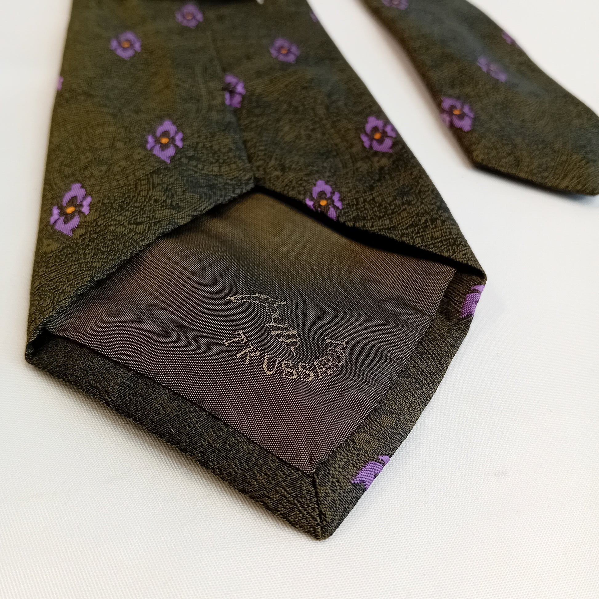 Cravatta vintage TRUSSARDI a stampa verde a jaquard paisely con piccoli fiori viola. Made in Italy. Amata, molto ben conservata.