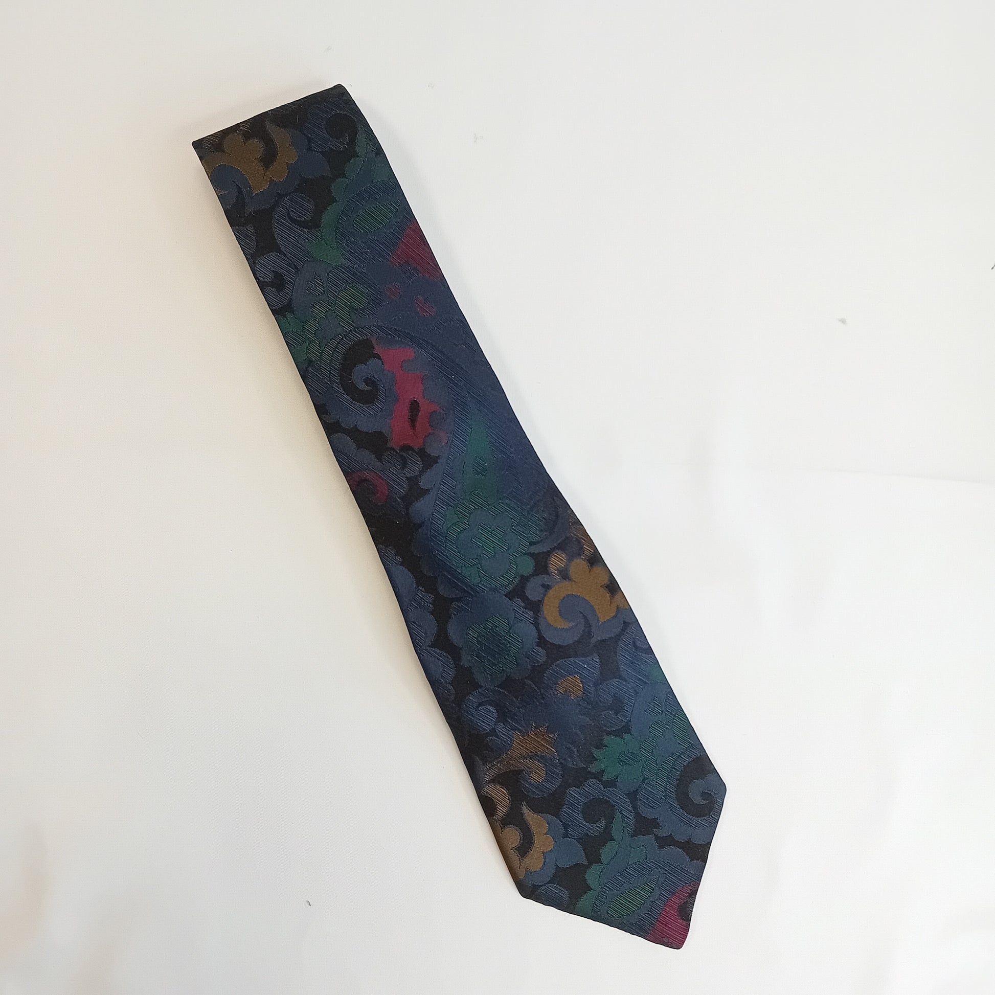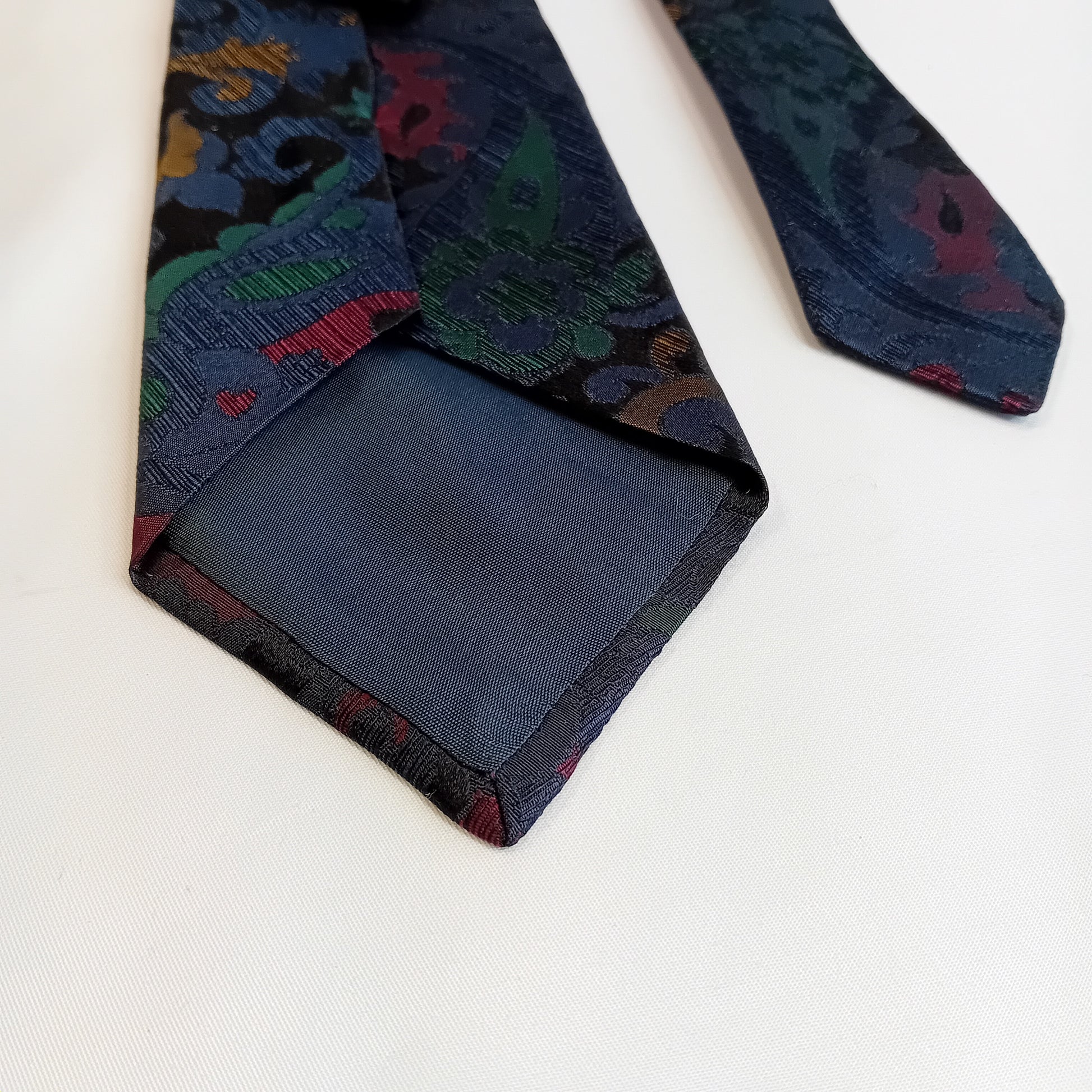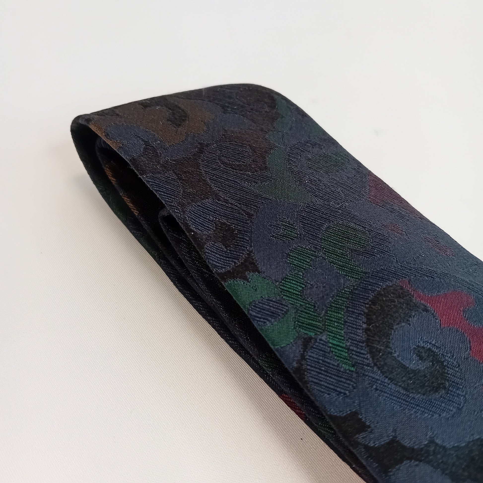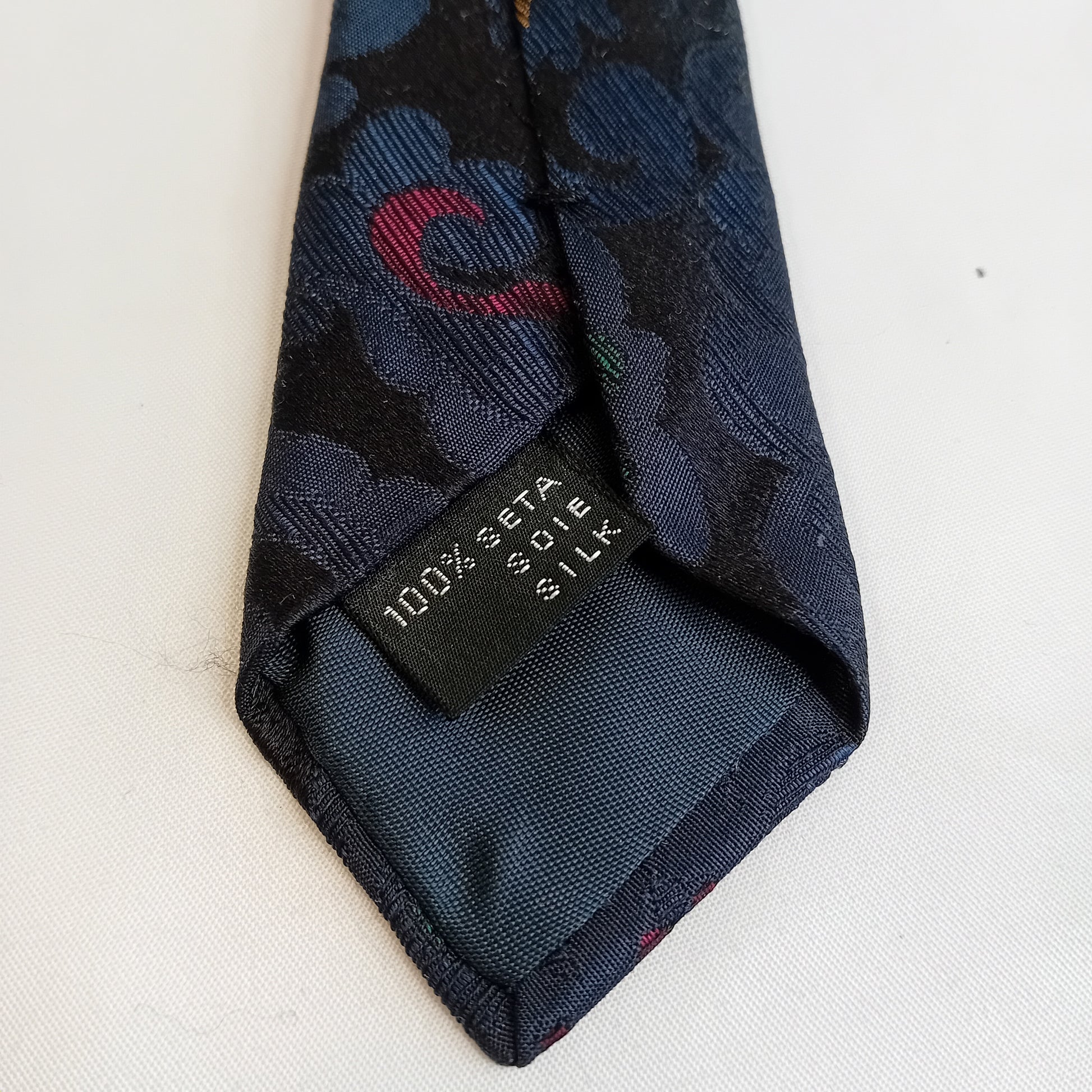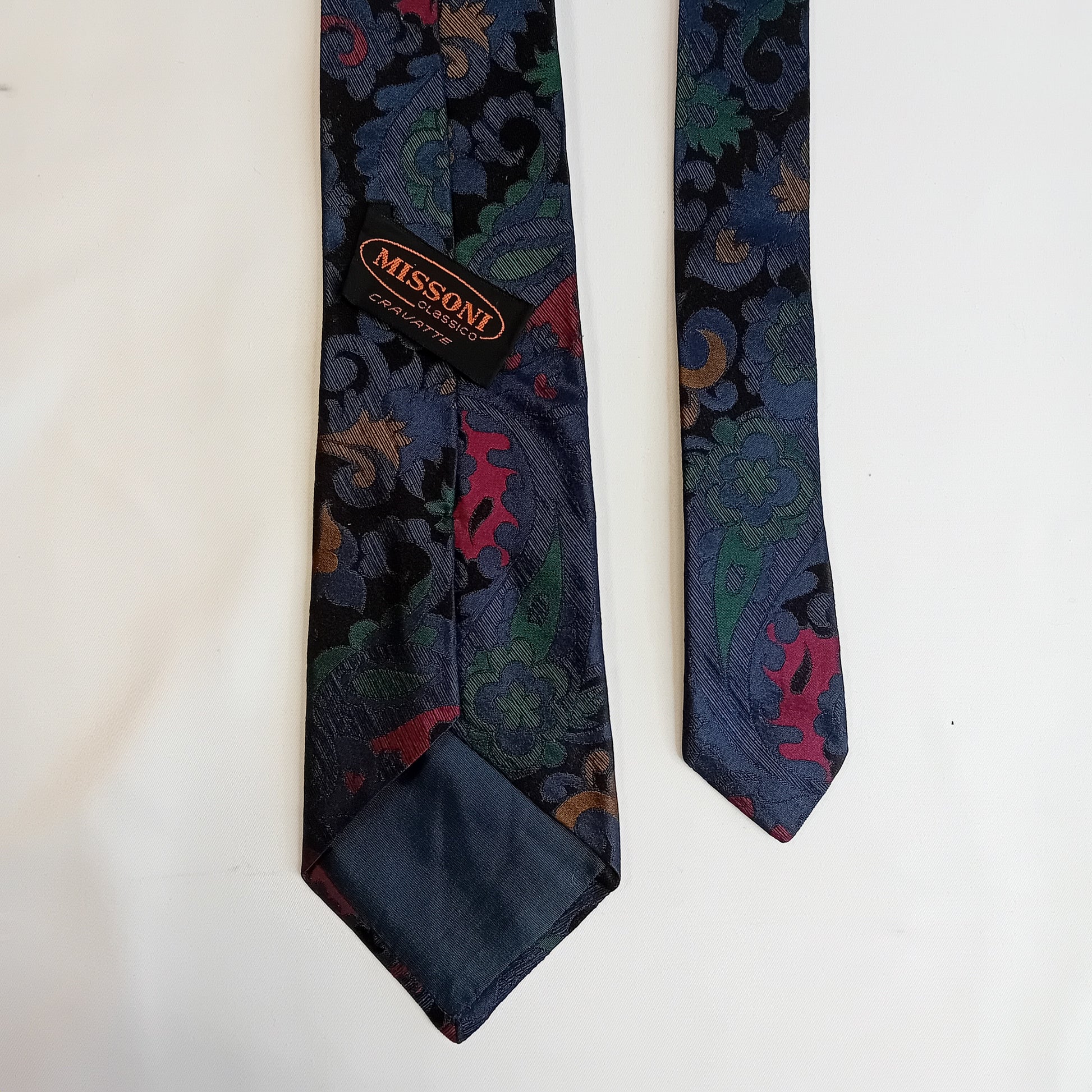 Cravatta vintage MISSONI, in jacquard a fantasia paisley sui toni scuri del nero e blu. Made in Italy. Amata, leggermente scucita l'etichetta della Maison, molto bene conservata.