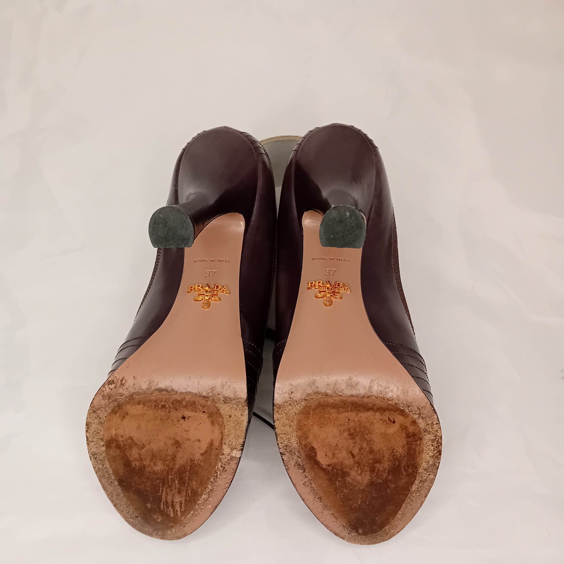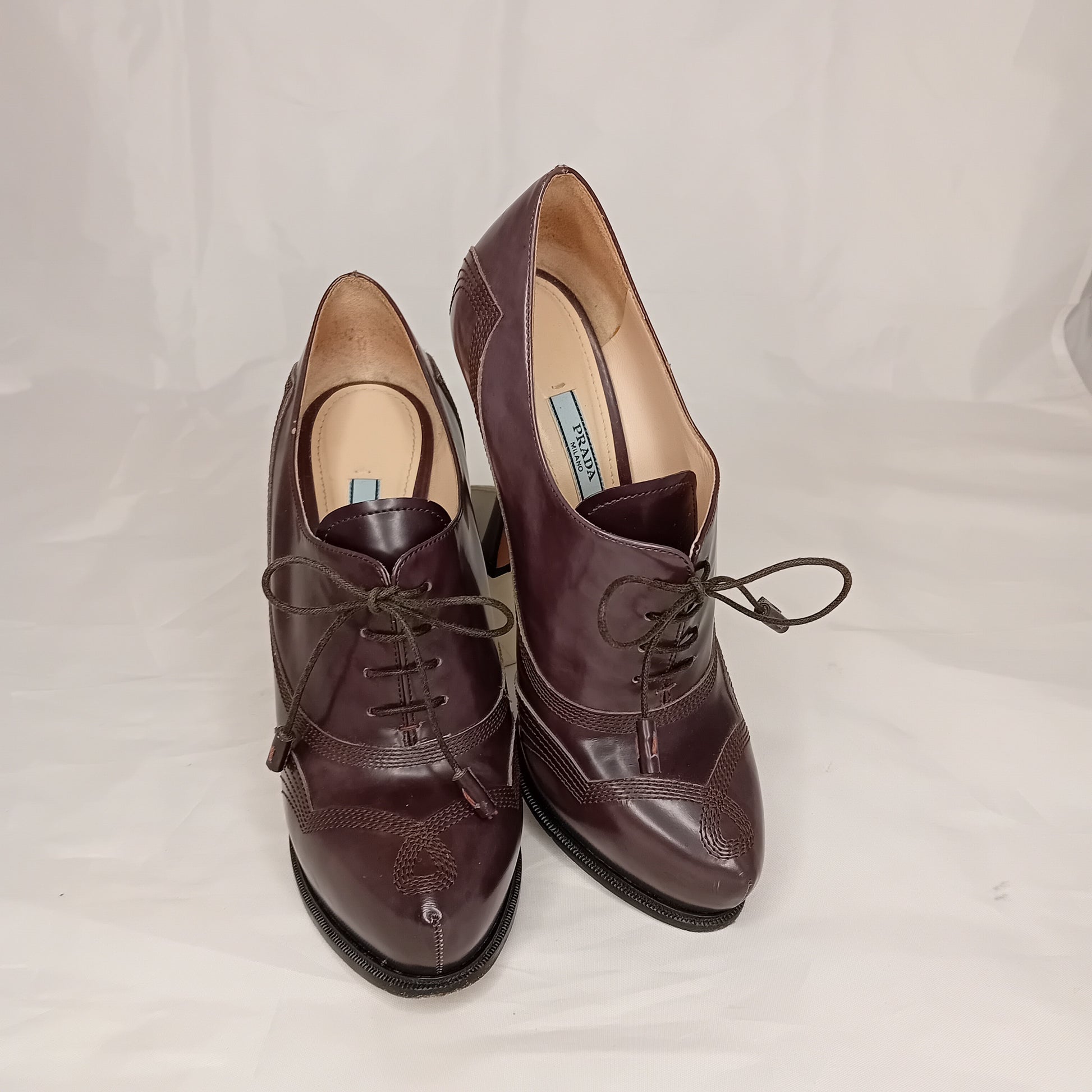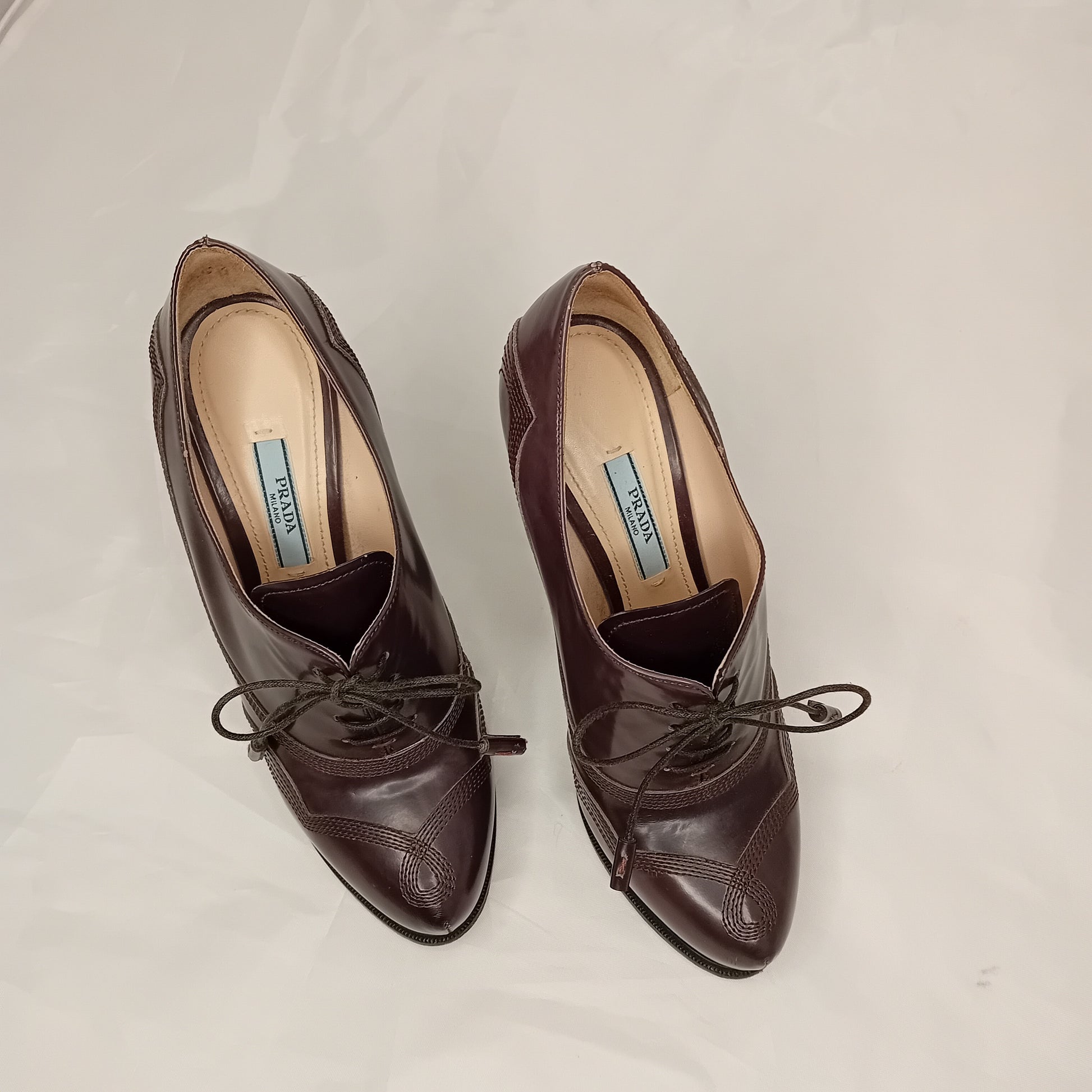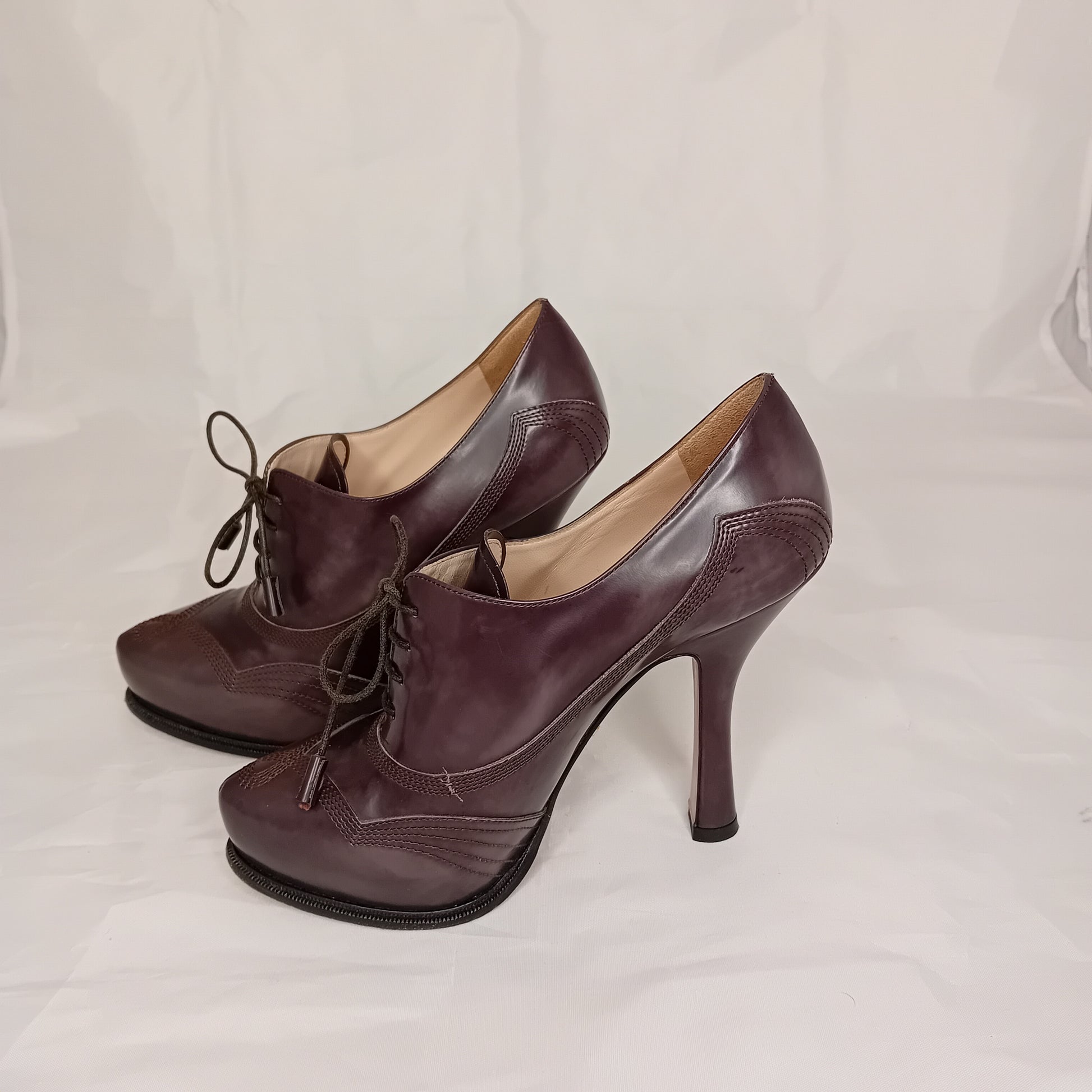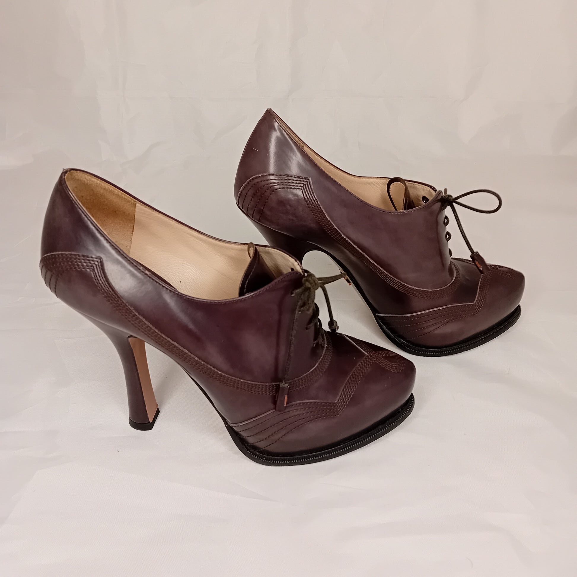 Francesine PRADA, in pelle liscia color talpa, tacco a stiletto da 12 cm, 4 fori, decorazione a impunture.