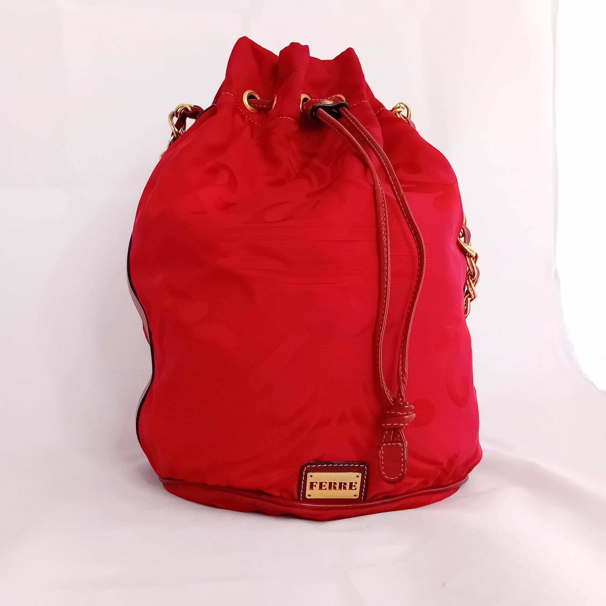 Borsa vintage FERRE, a secchiello, in jacquard rosso semaforo, con dettagli in pelle e manico a catena, interno ad un unico scomparto foderato con logo e tasca con zip. Codice prodotto 23388. Amata, presenta segni di utilizzo sparsi. Ben conservata.