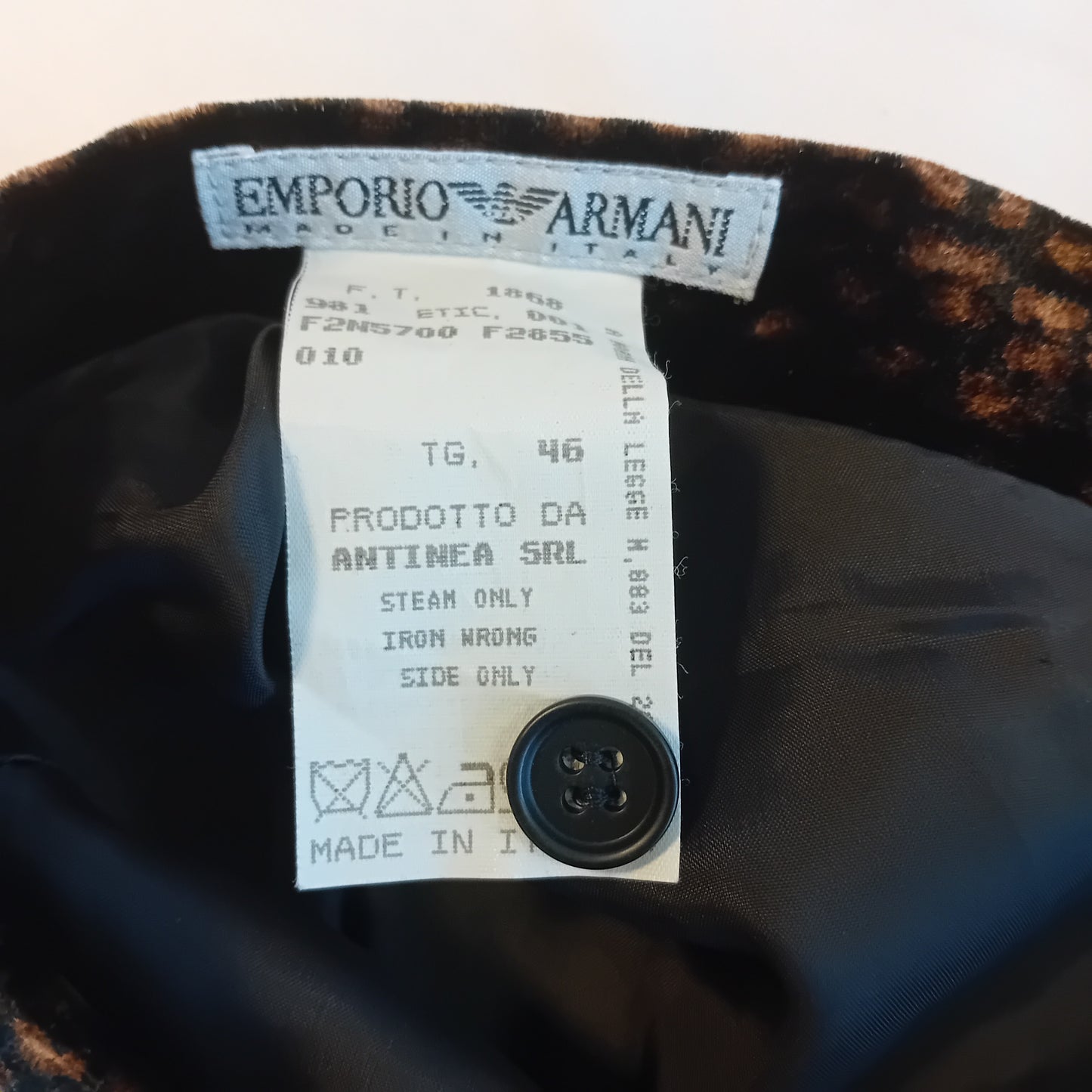 Gonna lunga EMPORIO ARMANI, vintage, in velluto marrone e nero a stampa animalier, scende morbida, interamente foderata. Made in Italy. Amata, molto ben conservata. L'orlo ha ceduto da un lato.