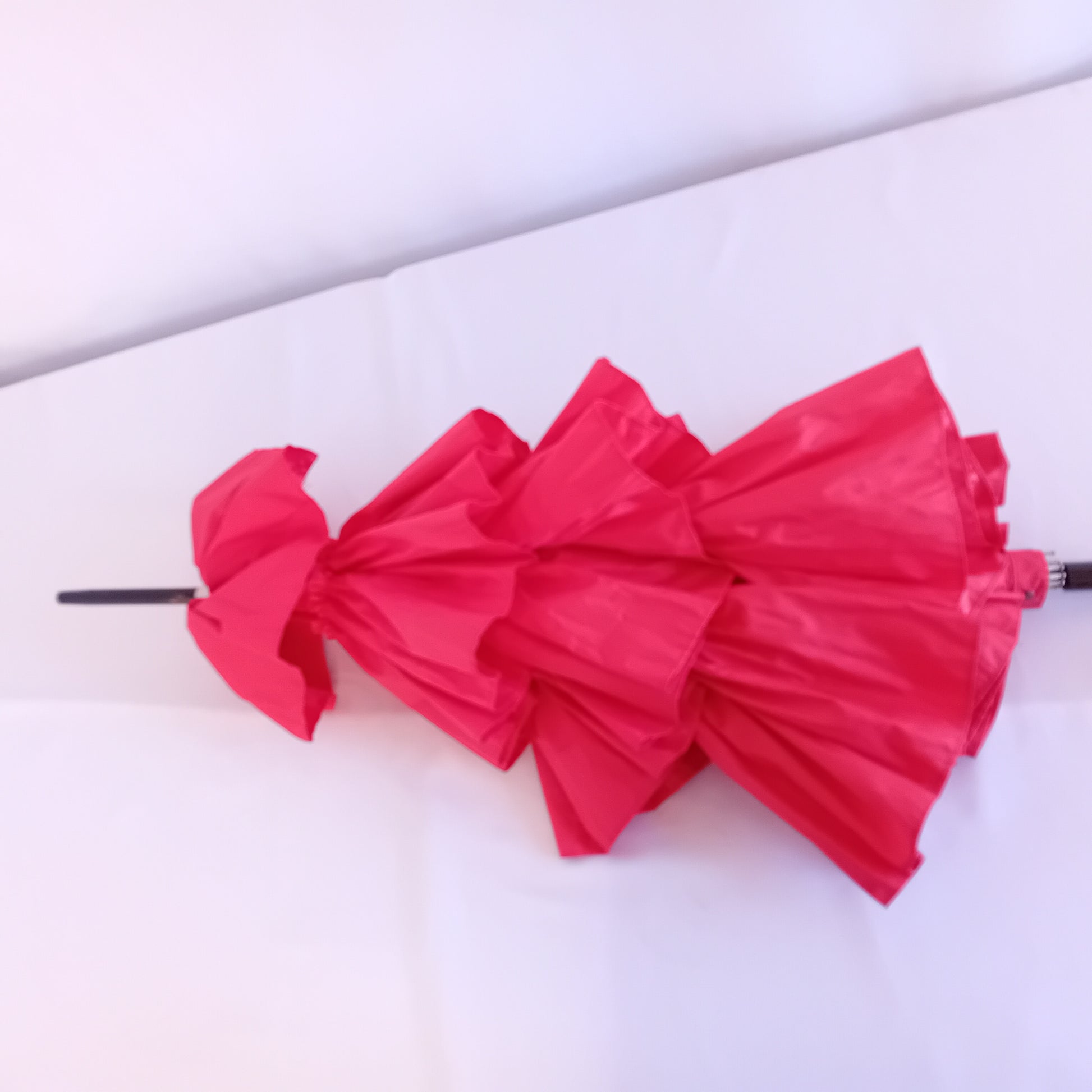 Ombrello GUY DE JEAN, modello Cancan Bis Rouge, fatto a mano in Francia, a ruches rosse, su telaio nero. Impermeabile e protezione UV. Scarsamente amato, ottimamente conservato. Presenta scarsi segni lungo la punta.