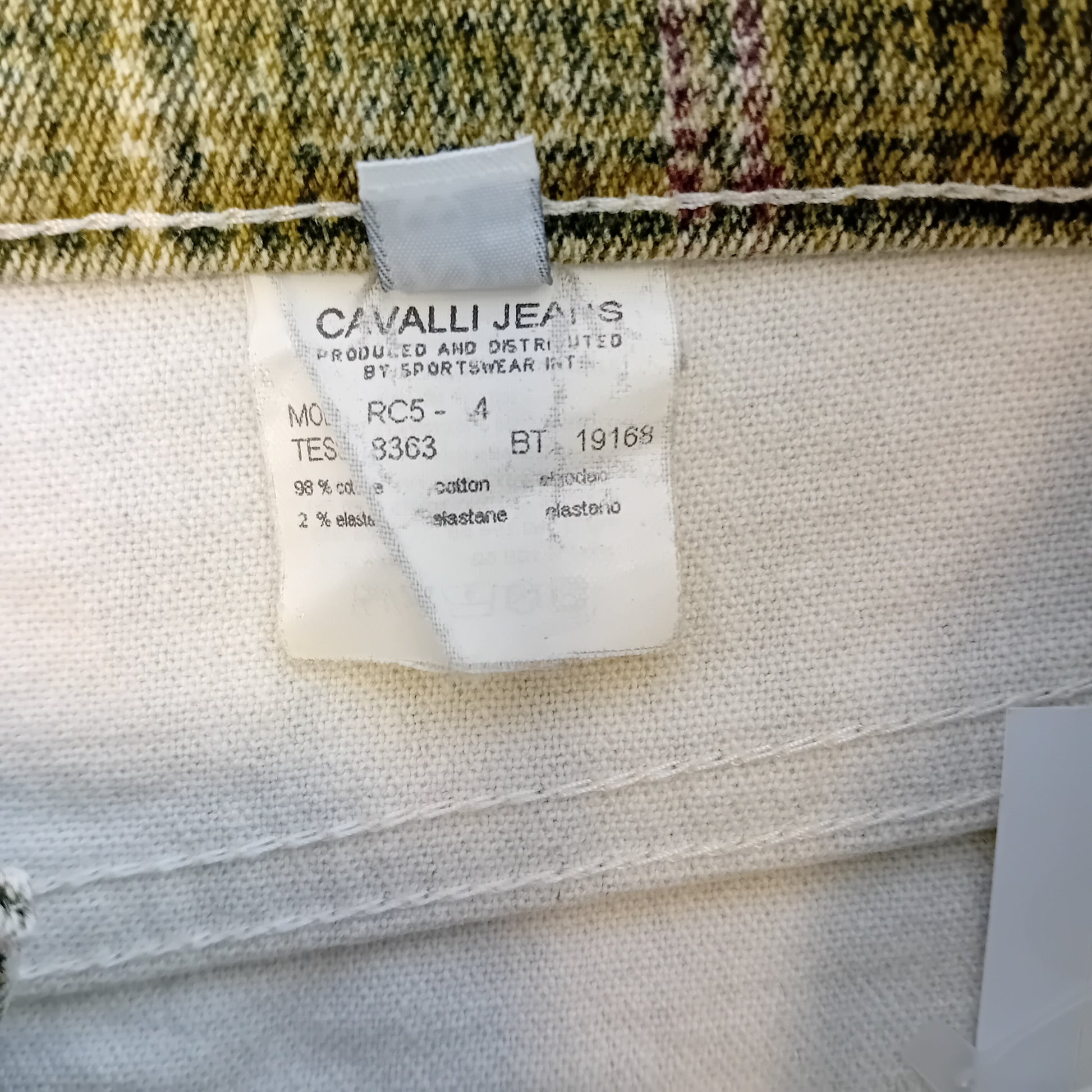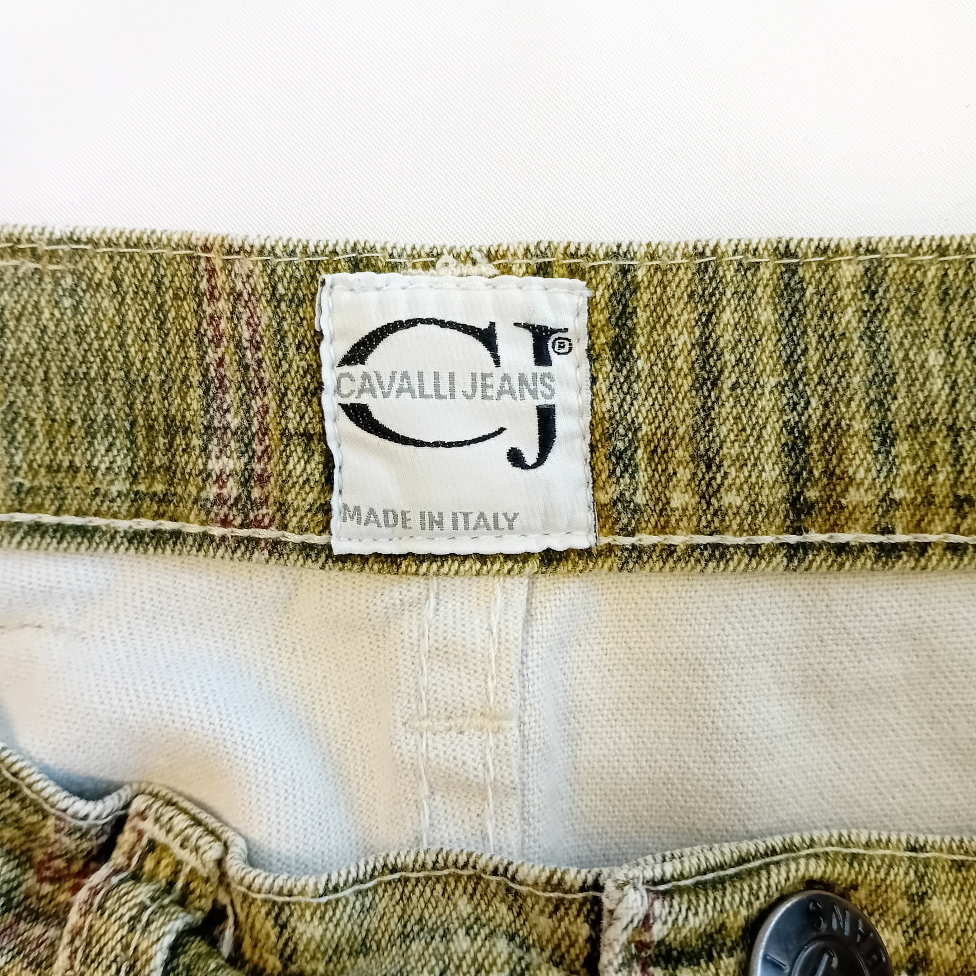 Denim CAVALLI JEANS, 5 tasche a vita alta, in cotone a stampa principe di Galles. Made in Italy. Amati, l'orlo è stato modificato manualmente, molto ben conservati.
