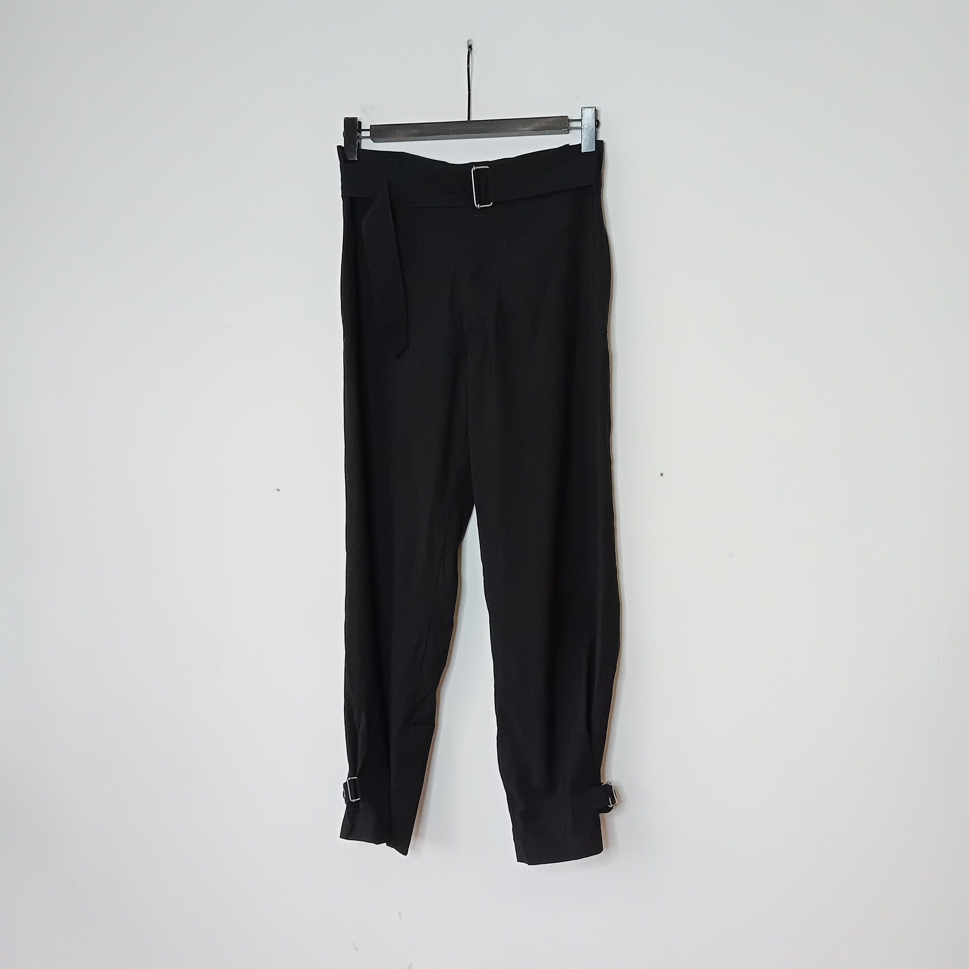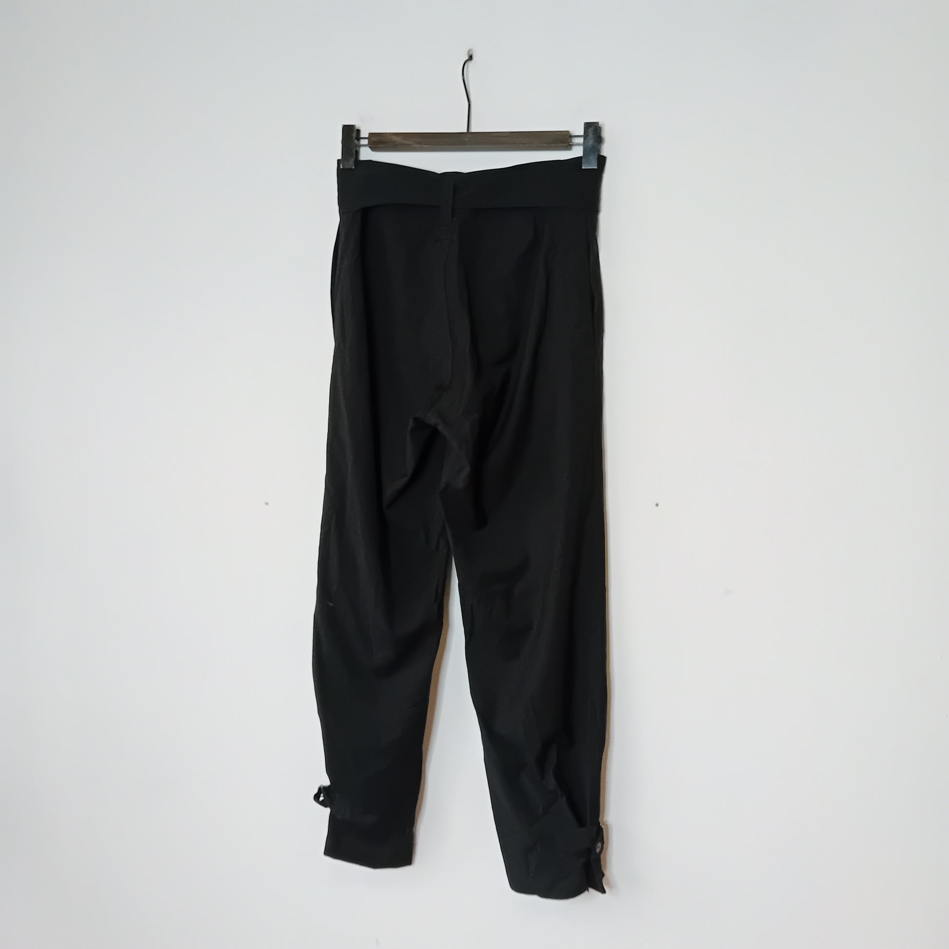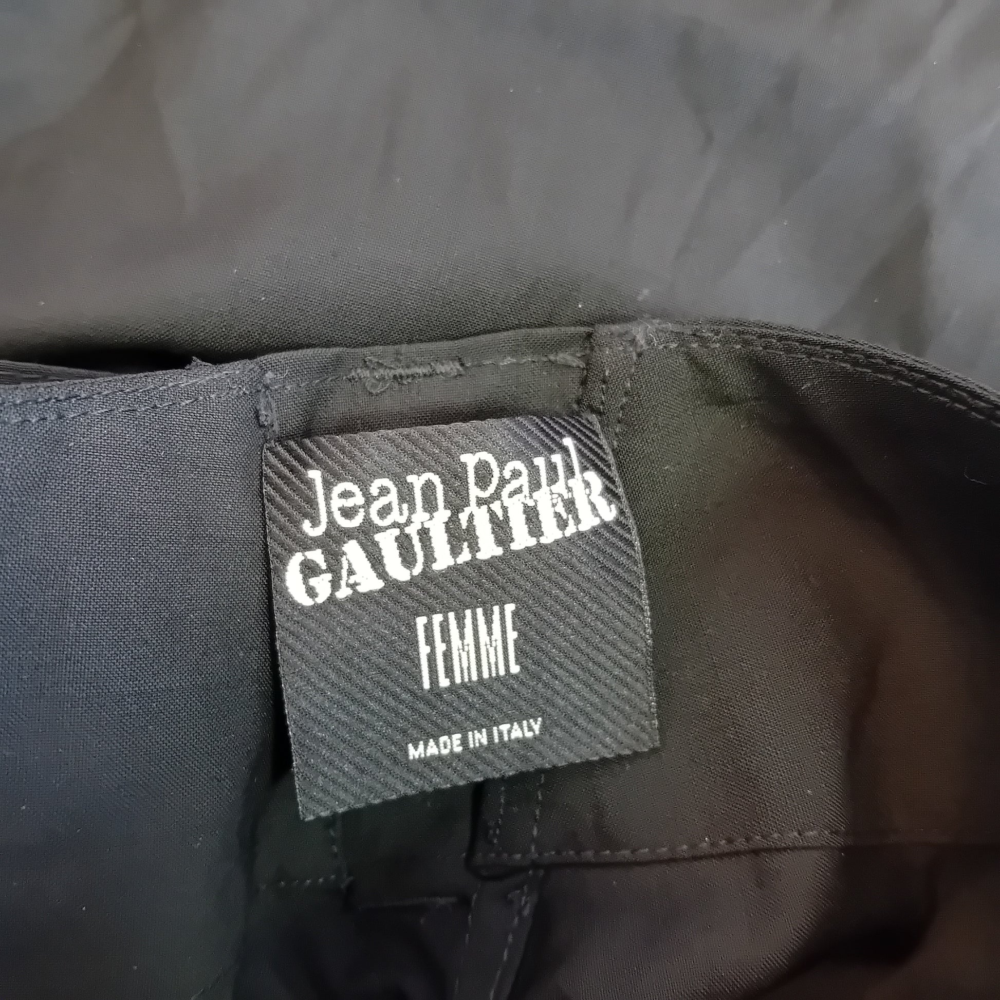 Pantalone JEAN PAUL GAULTIER Femme, prodotto Aeffe, in leggerissima lana nera, ampio cinturino in vita molto particolare, doppia tasca a toppa e doppia a filetto nascosta, scende dritto, con chiusura alla caviglia. Amato, ottimamente conservato.