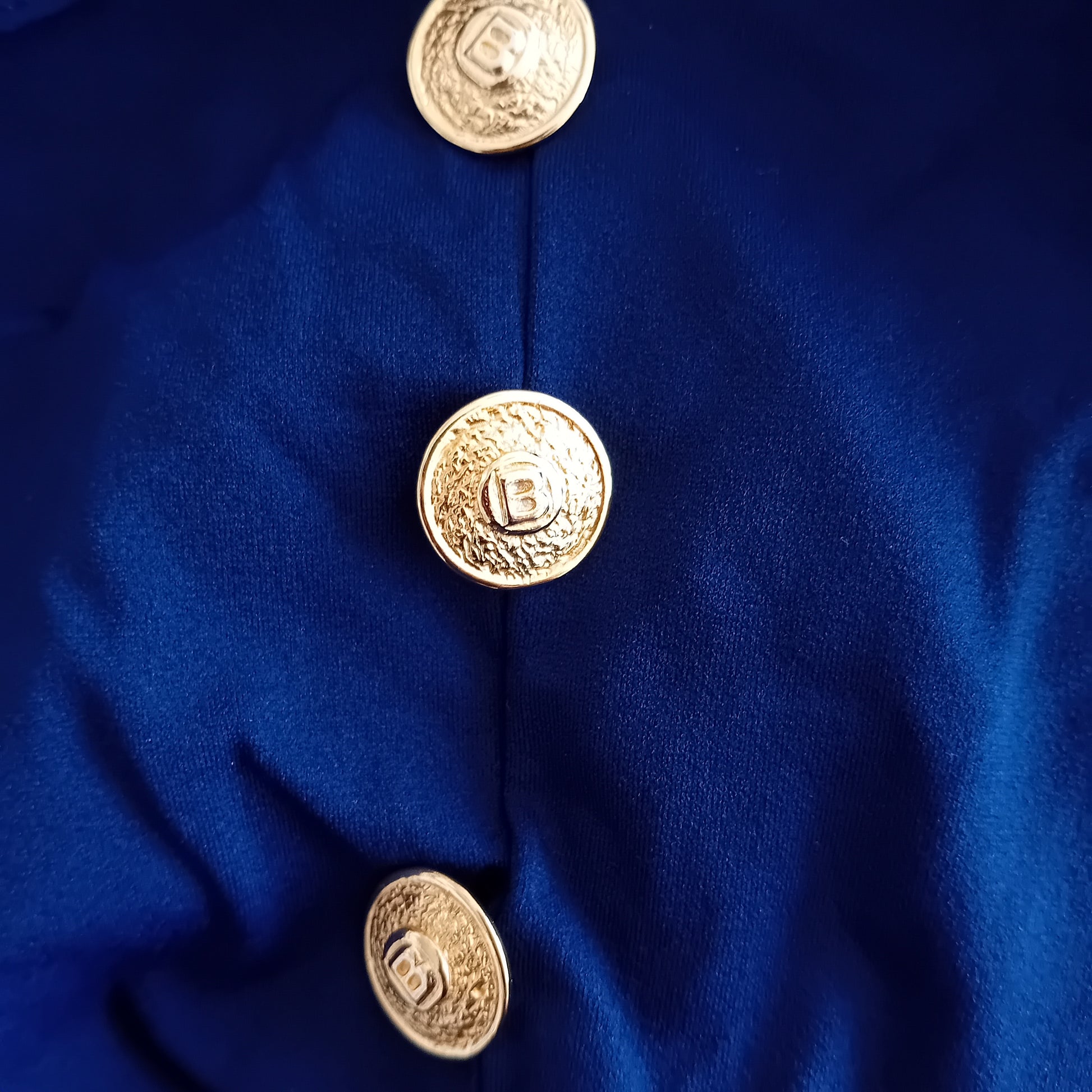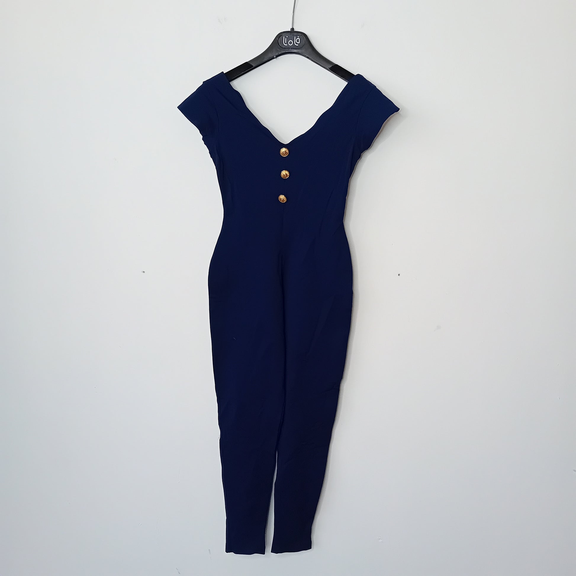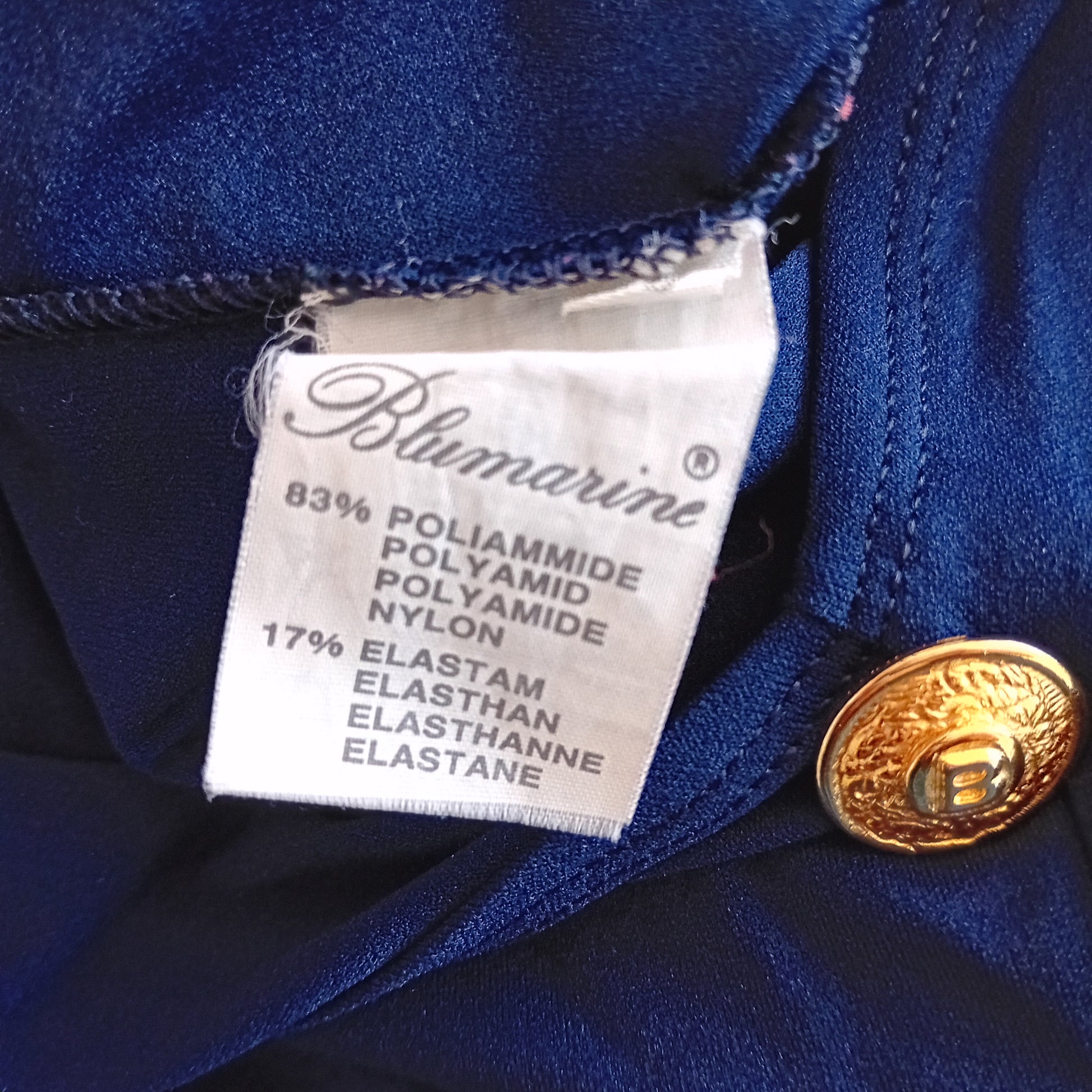 Jumpsuit vintage BLUMARINE FOLIES, blu notte, scollo a V davanti e dietro, aderente come una seconda pelle, con tre bottoni dorati applicati davanti. Made in Italy. Amata, è scucita in un punto lungo la gamba. Molto ben conservata.