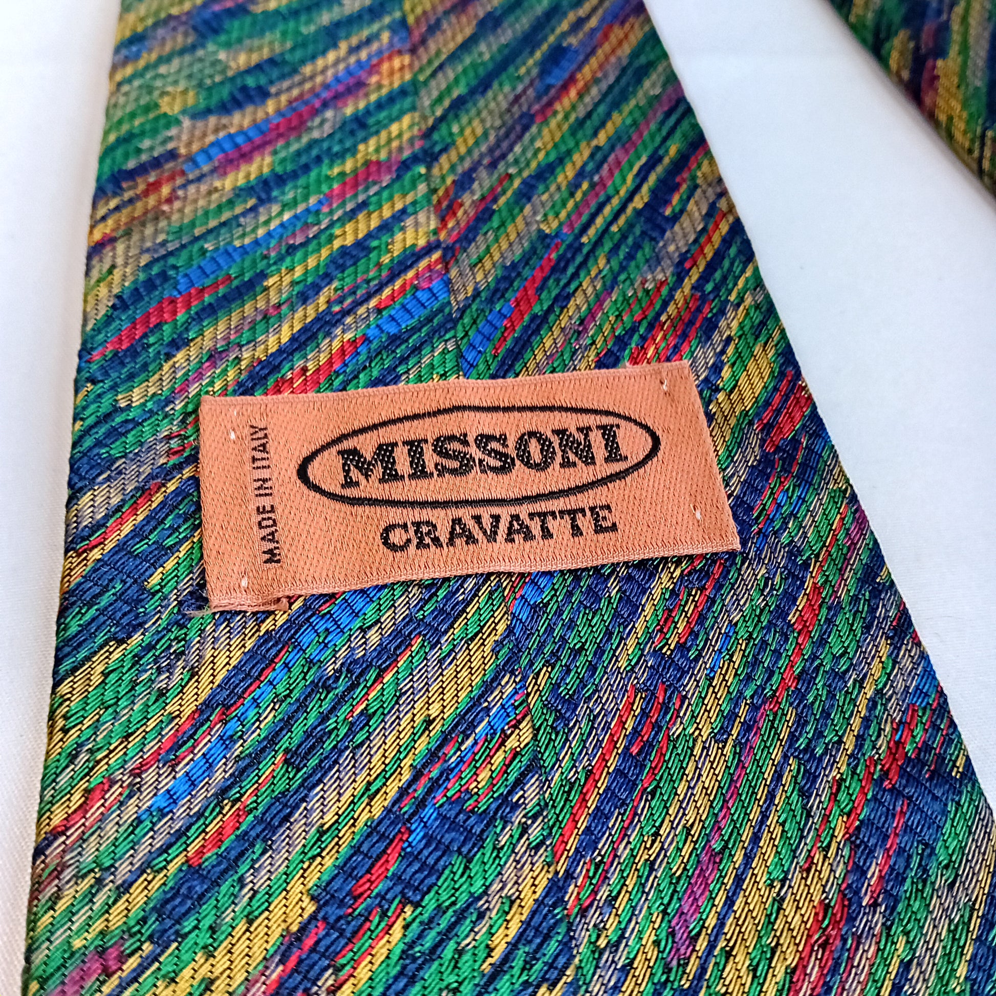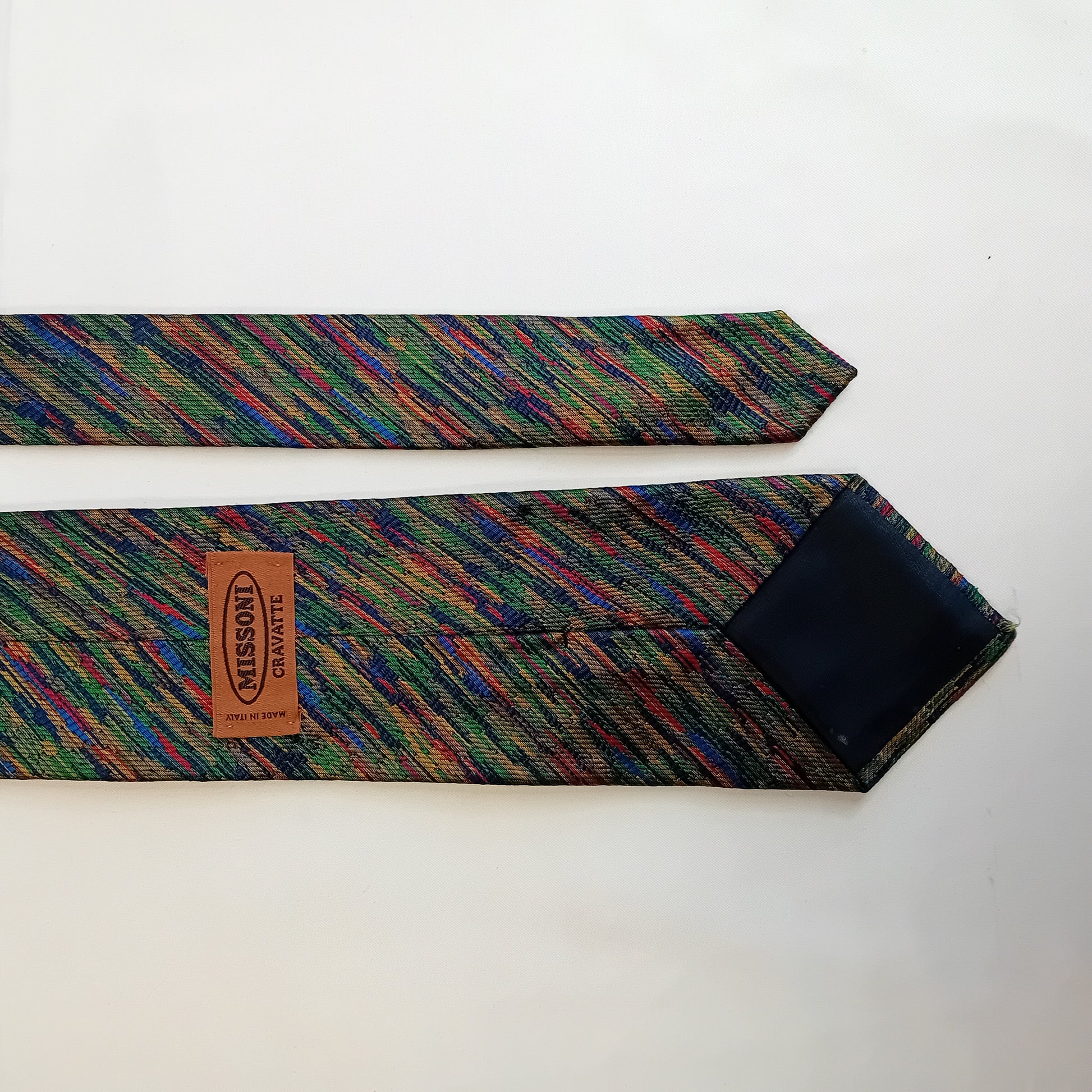 Cravatta vintage MISSONI, in seta ricamata fantasia a righe oblique. Amata, ha un filo tirato in punta dietro e una piccola macchia. ben conservata.