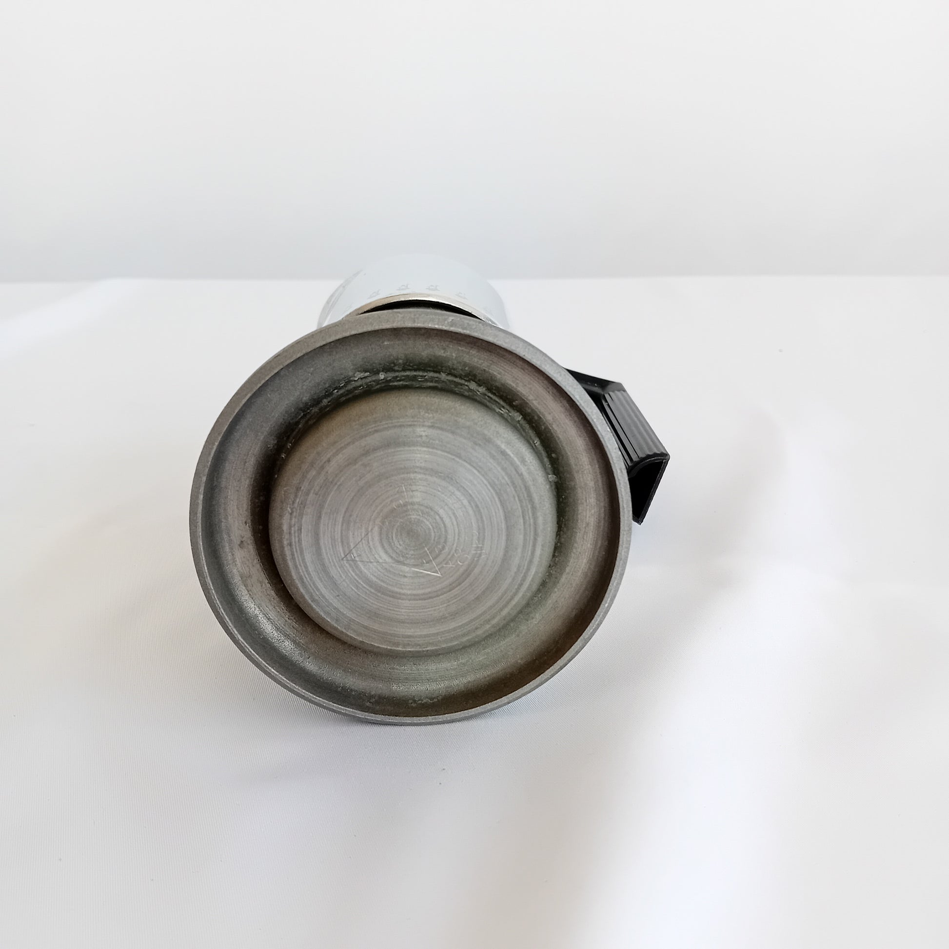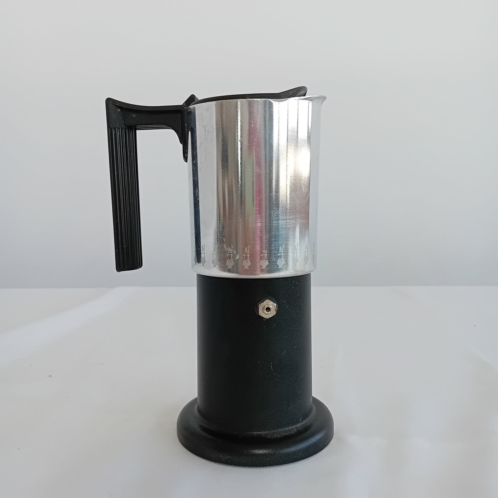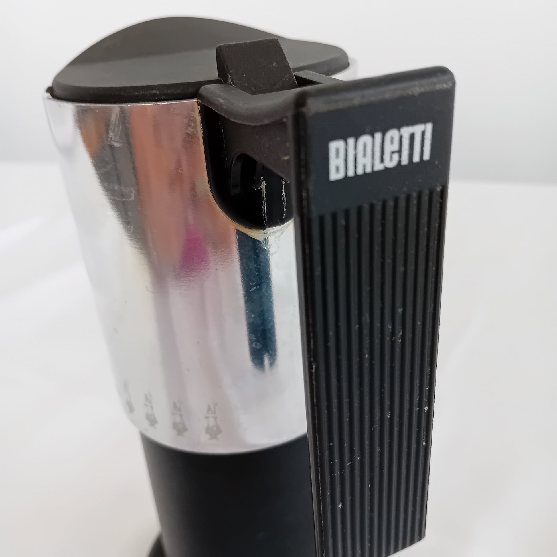 Caffettiera Bialetti autentica probabilmente degli anni '80, sul fondo il marchiata "A. Bialetti - Crusinallo - Made in Italy" e marchio BIALETTI sul manico. Parte inferiore in nero satinato, la parte superiore è di acciaio, il manico ed il coperchio sono di plastica nera. Fa caffè per 4 tazzine. Usata ma ben conservata, senza parti rotte o bruciate.
