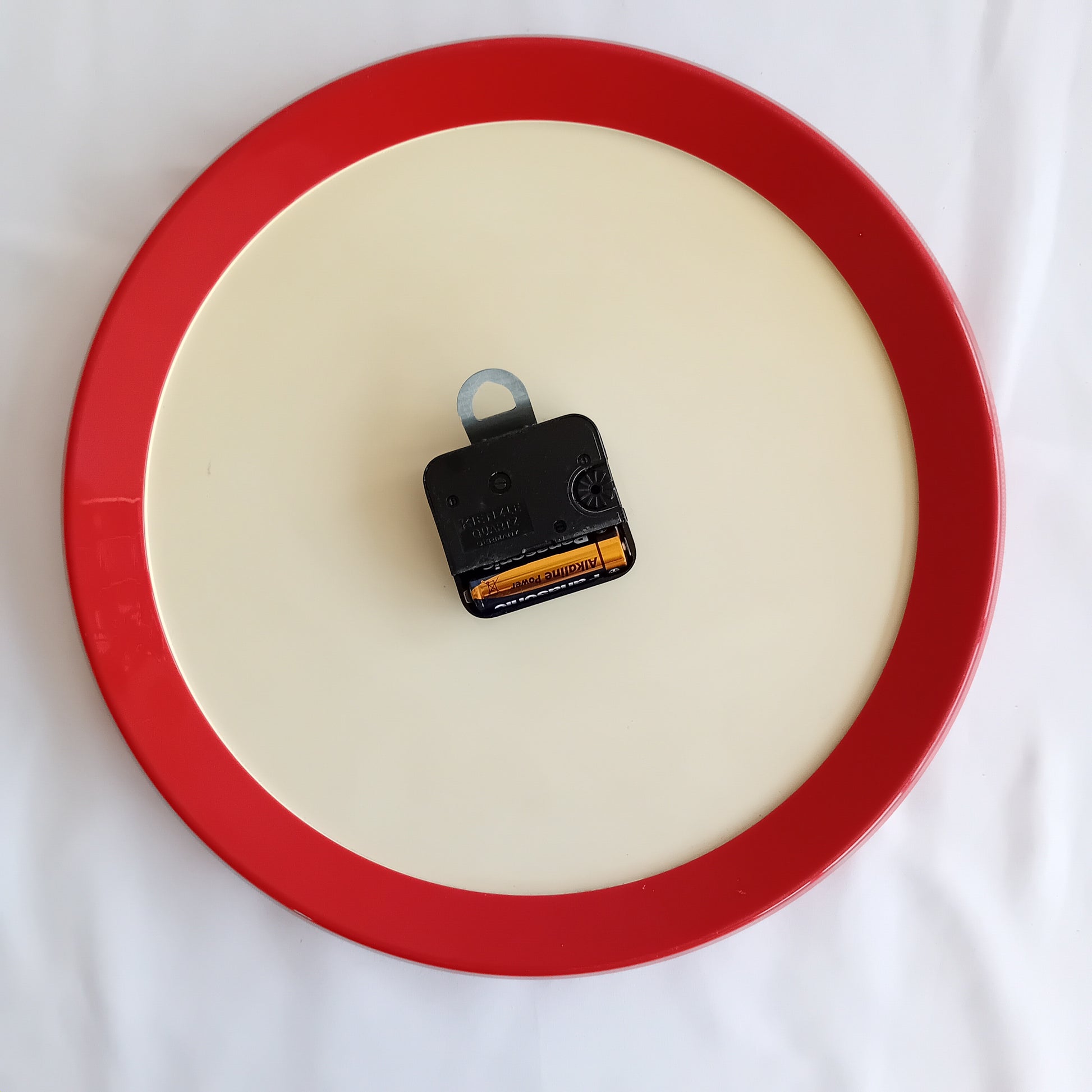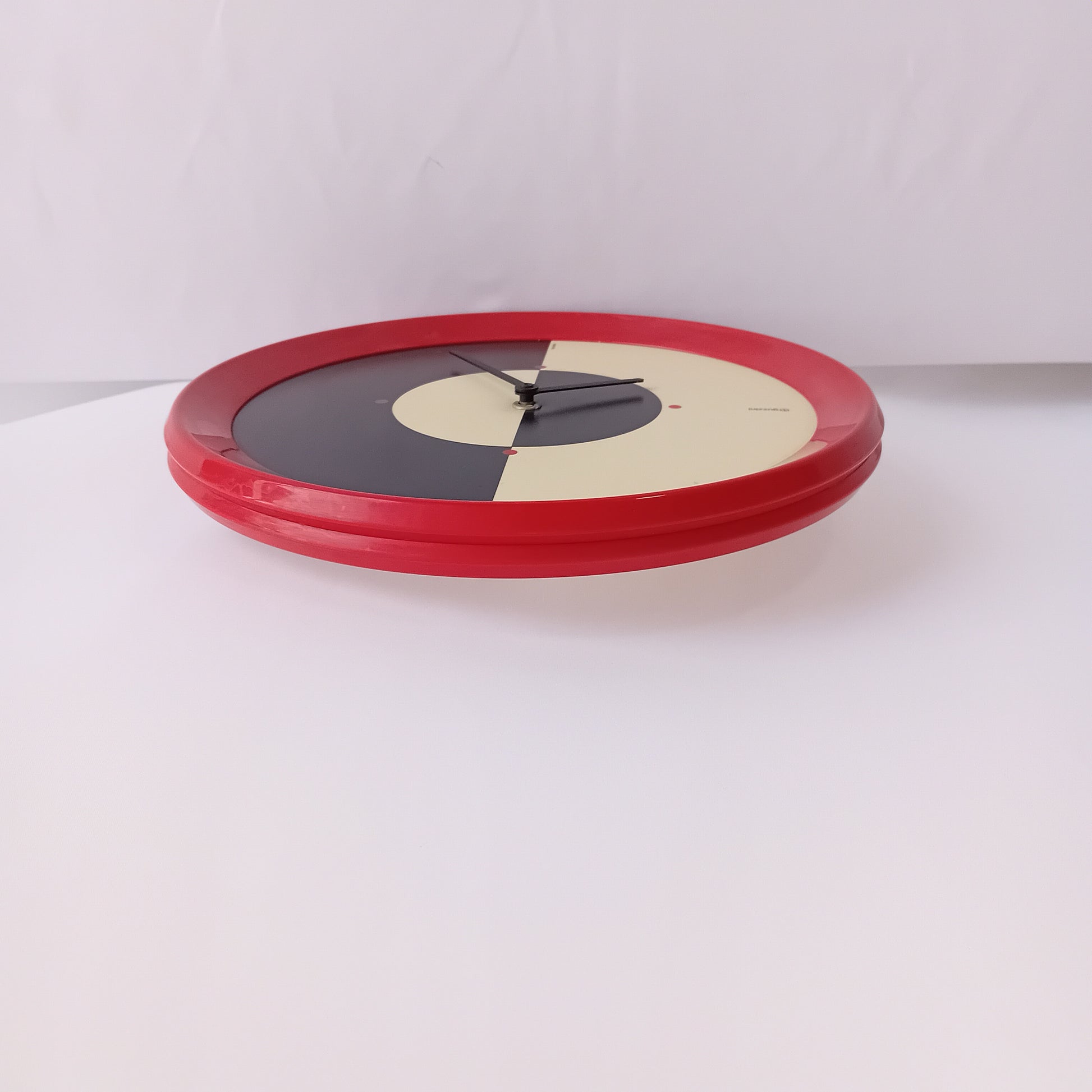 Orologio da parete postmoderno in stile Memphis degli anni '80. Disegnato da Bruno Gecchelin, realizzato da Guzzini, Italia. L'alloggiamento è realizzato in plastica rossa, il quadrante dell'orologio in bianco e nero con grafica geometrica. Dei punti rossi contrassegnano le ore 3/6/9/12. Funzionante e in ottime condizioni. Probabilmente le lancette sono state cambiate e queste non sono le originali. Manca quella dei secondi.