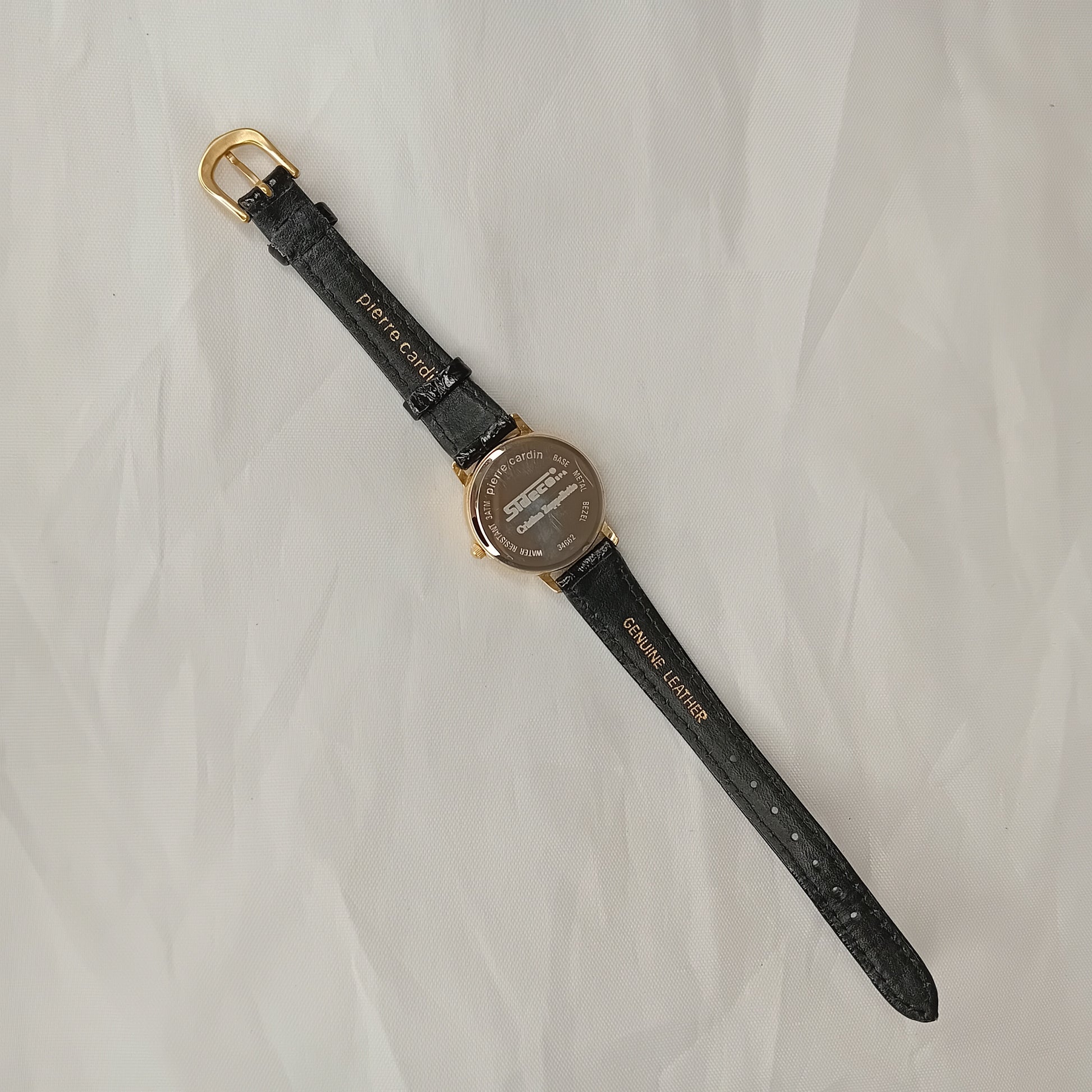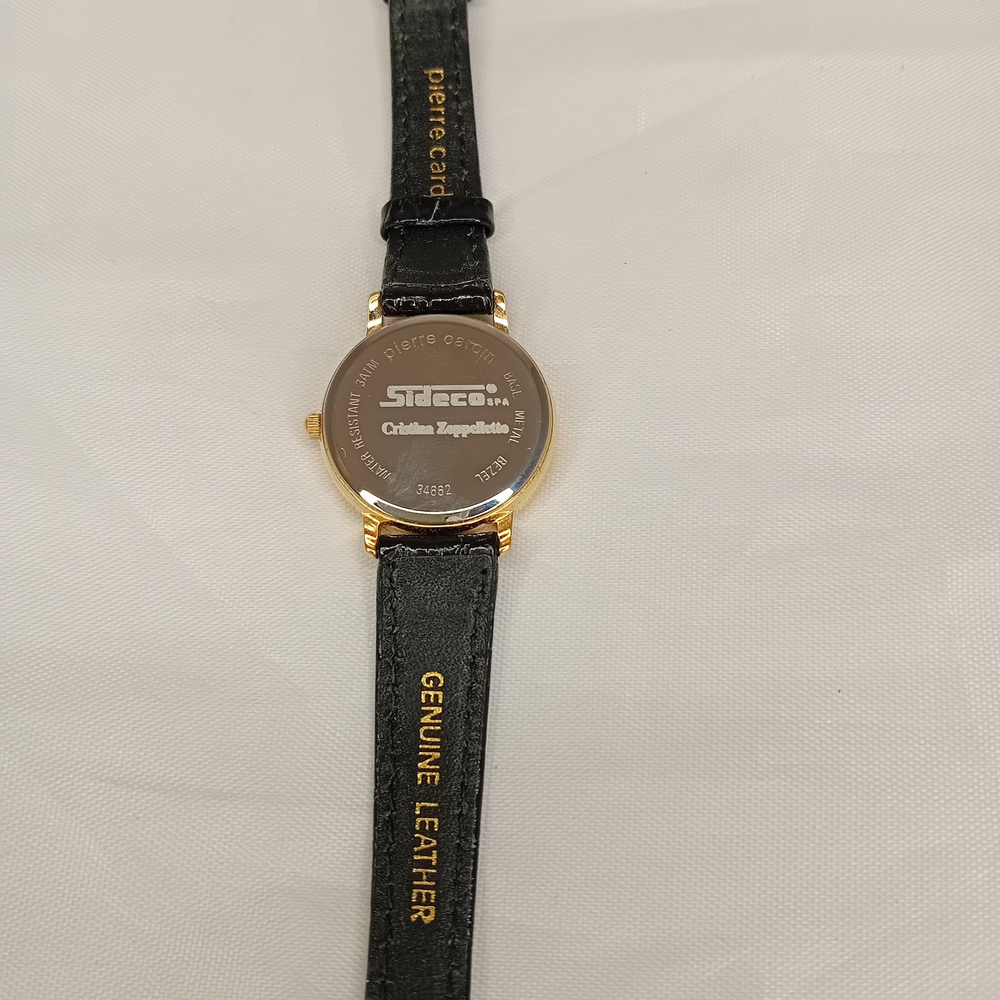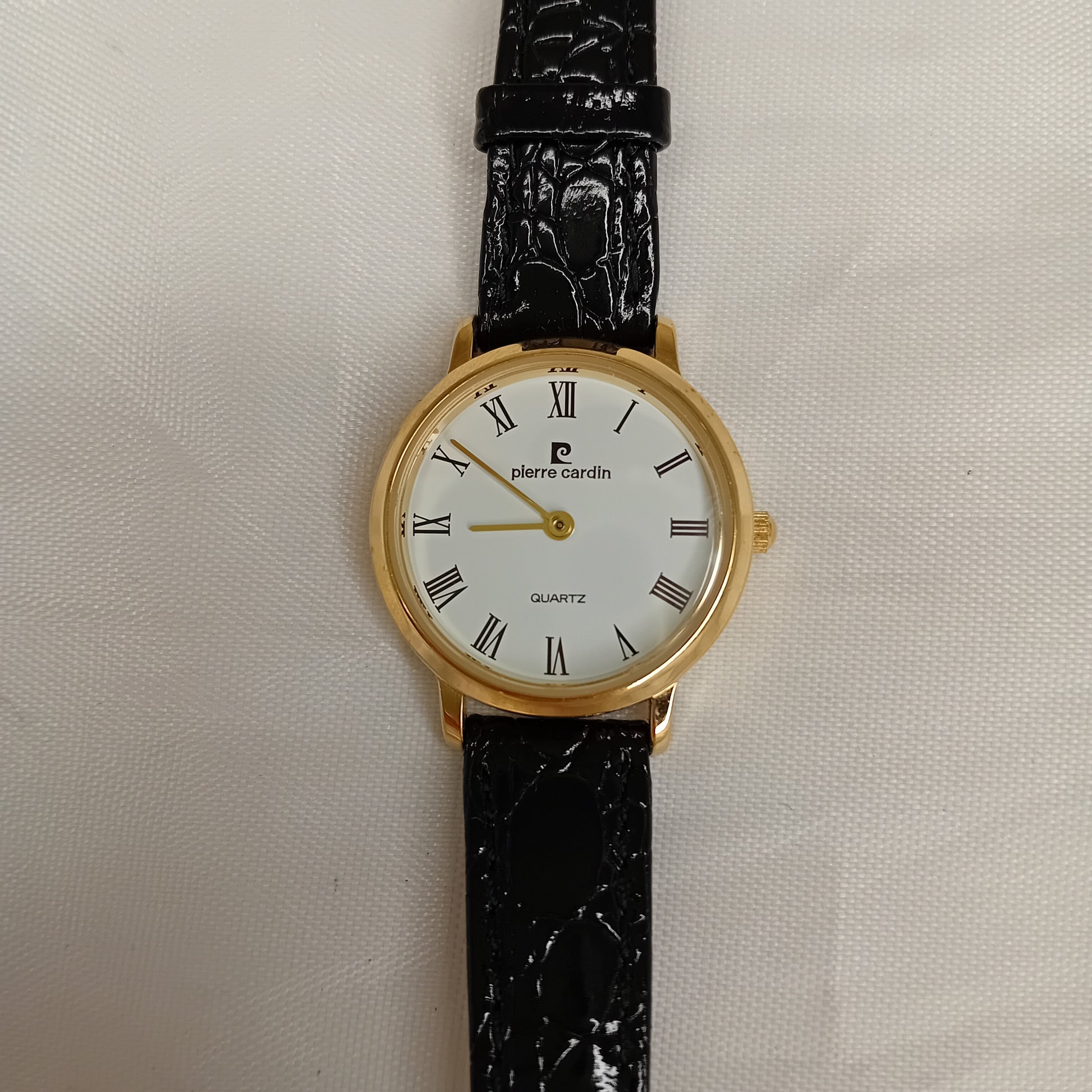 Orologio vintage Pierre Cardin. Matricola numero 34662. Quadrante in metallo dorato, numeri romani, lancette color oro, cinturino in pelle nera originale, resistente all'acqua fino a 3 ATM. Venduto con il suo cofanetto originale. Batteria da sostituire.