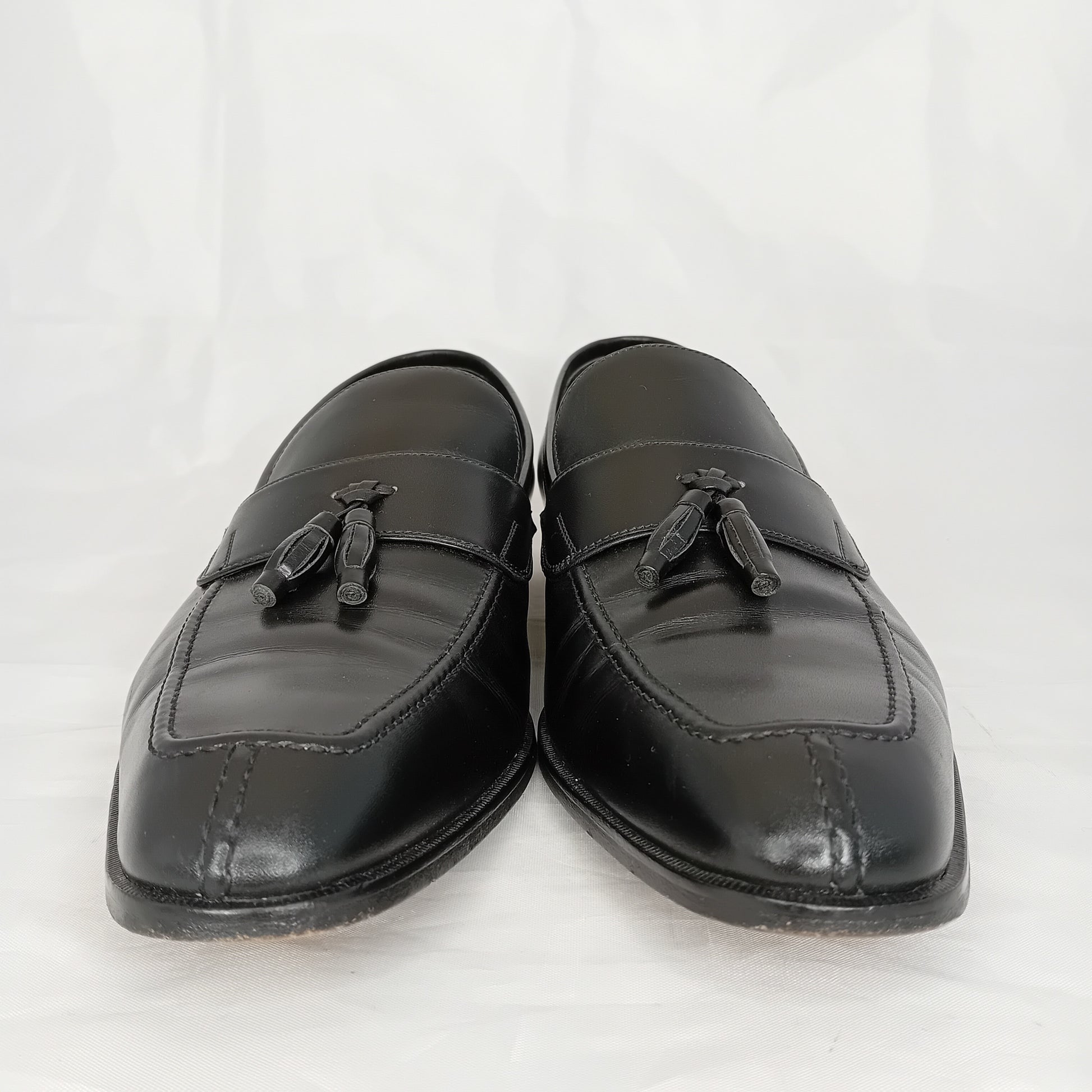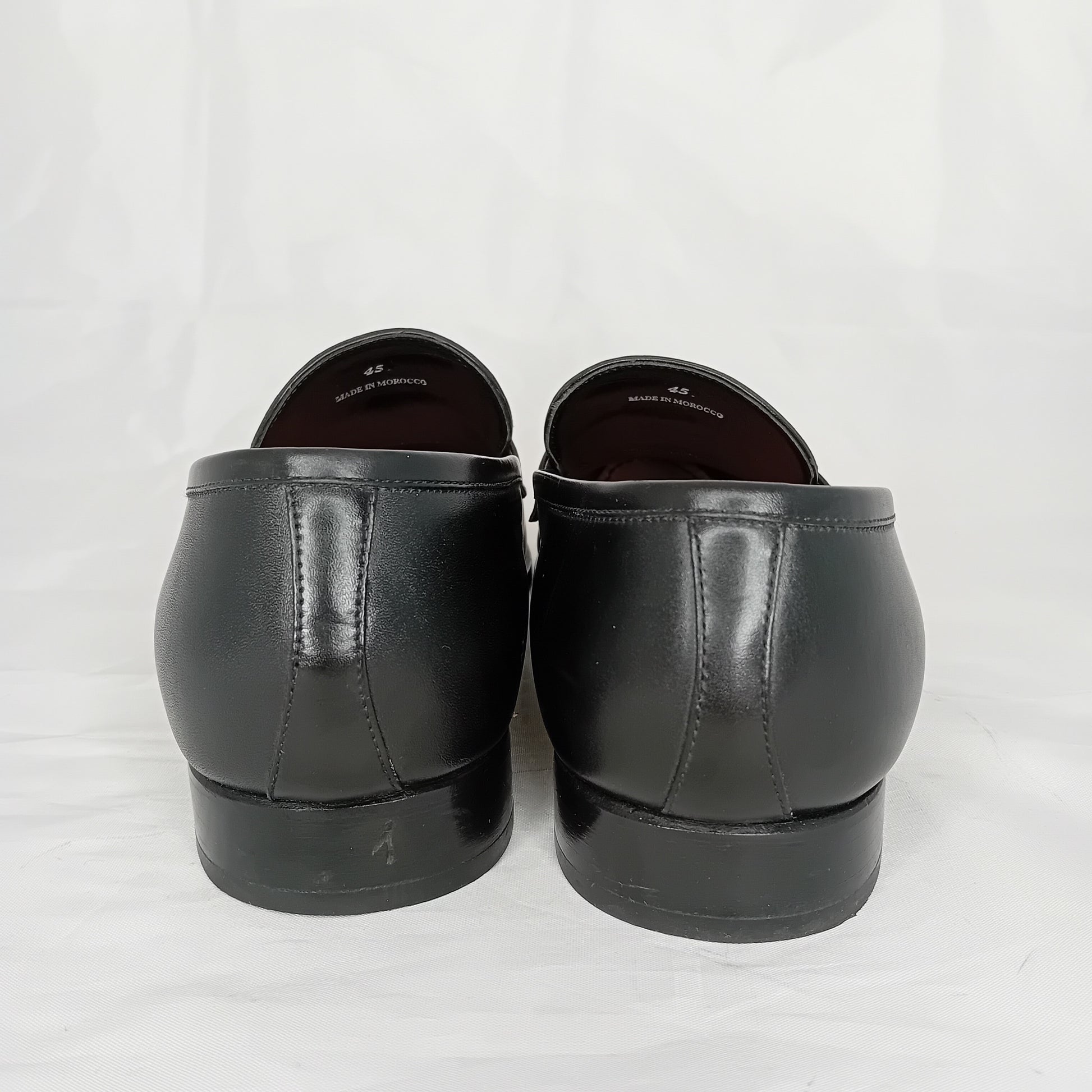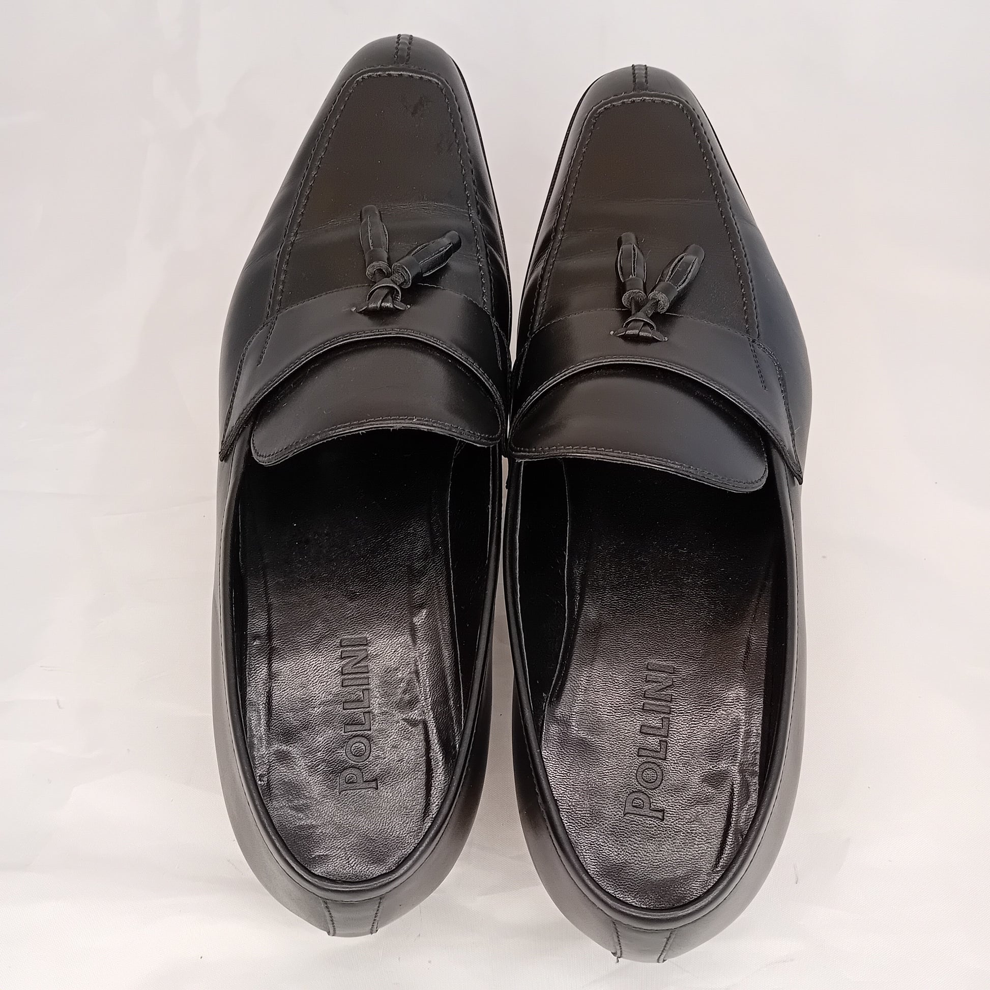 Loafers POLLINI in pelle nera liscia, a punta, con nappe. Scarsamente amate, presentano un segno lungo il tacco, ottimamente conservate.