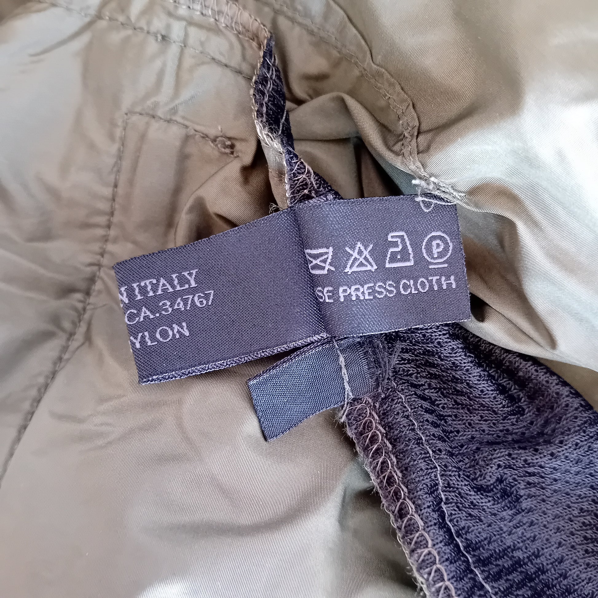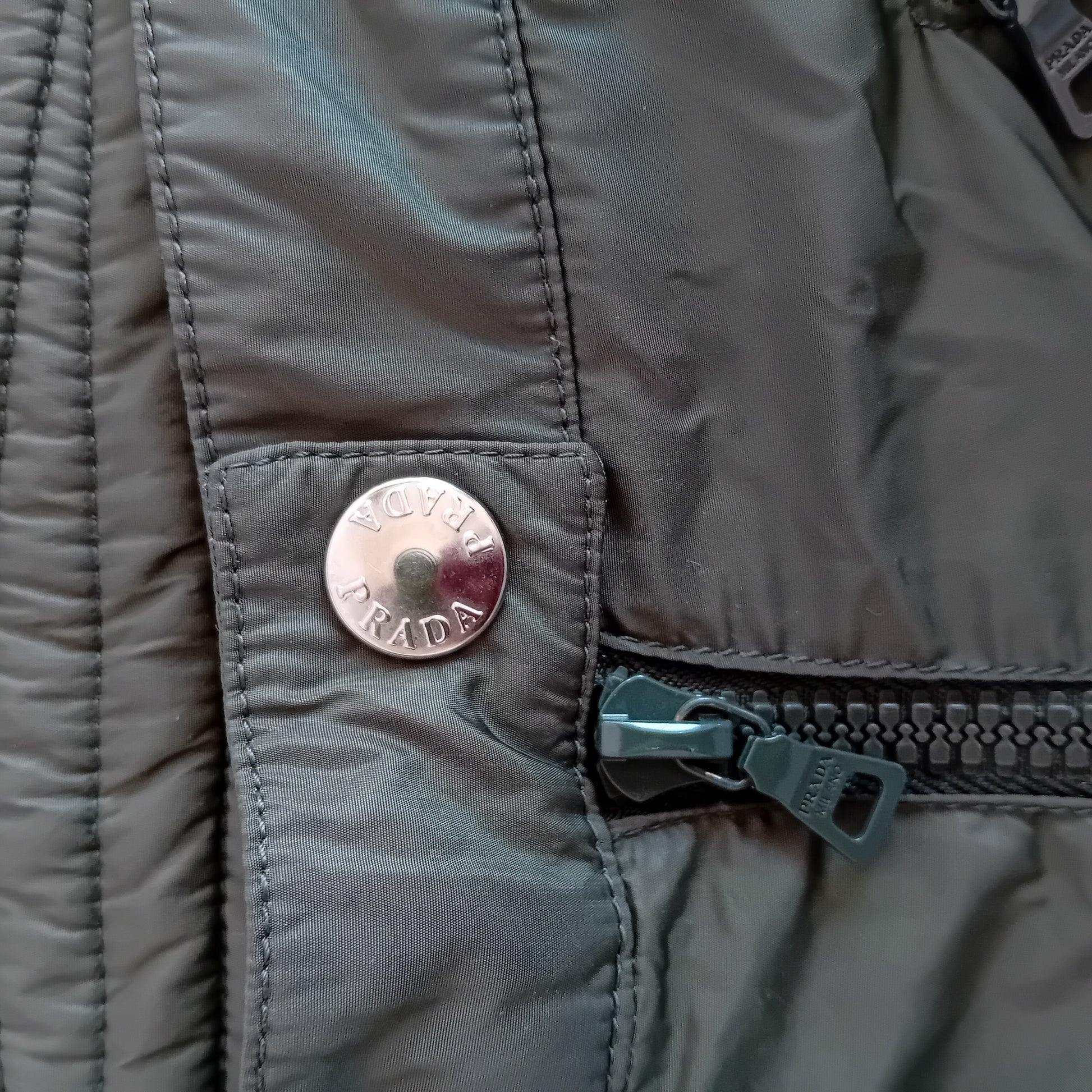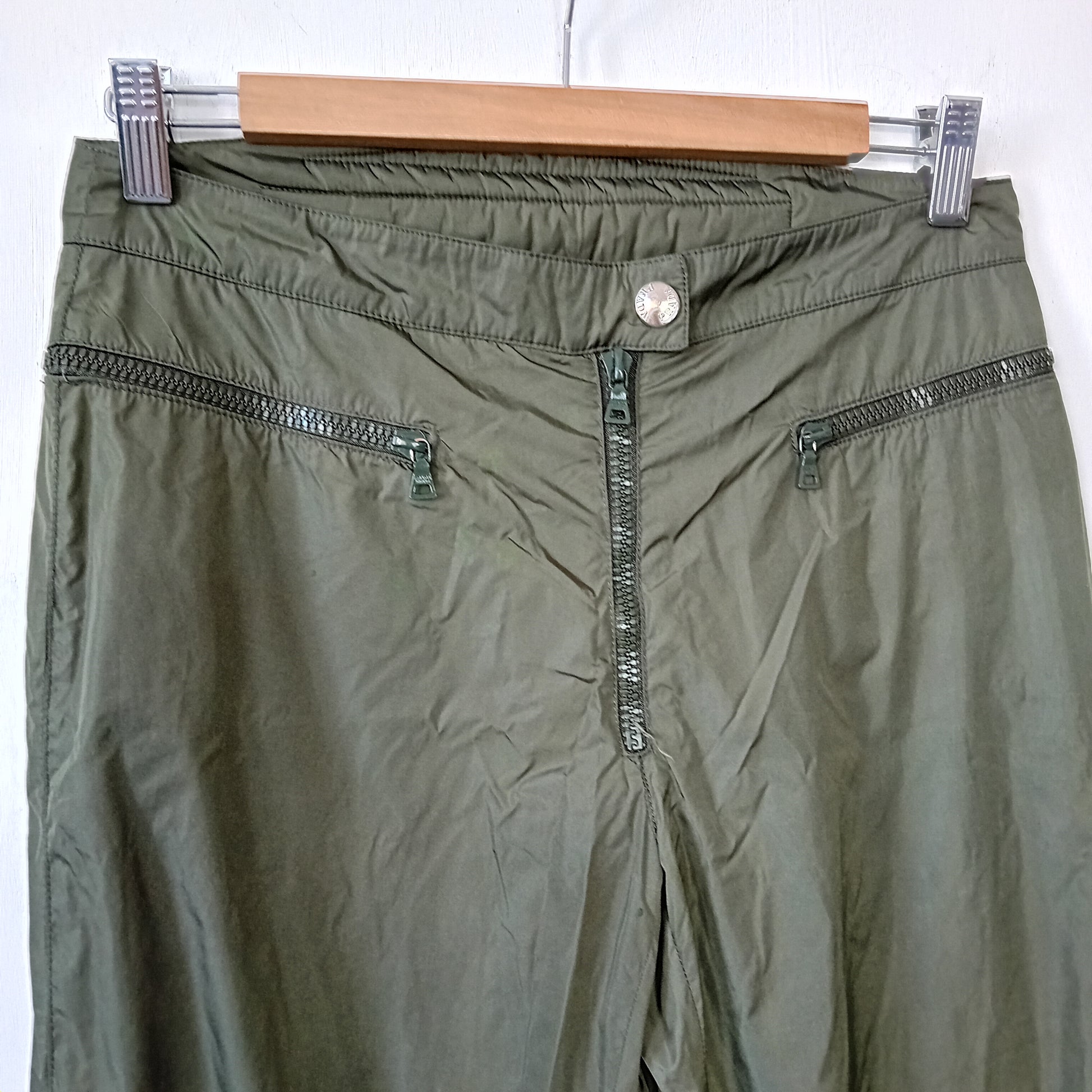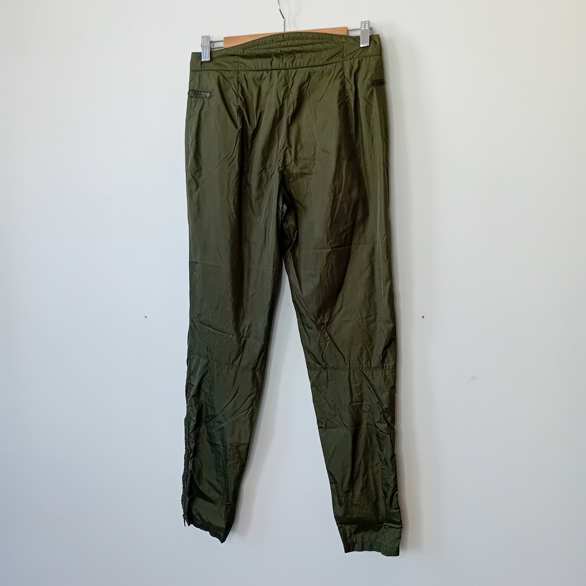 Pantalone red line PRADA, in tessuto sintetico verde oliva, a vita bassa, tasche a vista con zip, come lungo le caviglie, imbottitura lungo il ginocchio. Amato, mostra macchie e macchie da lavaggio sparse. Ben conservato.