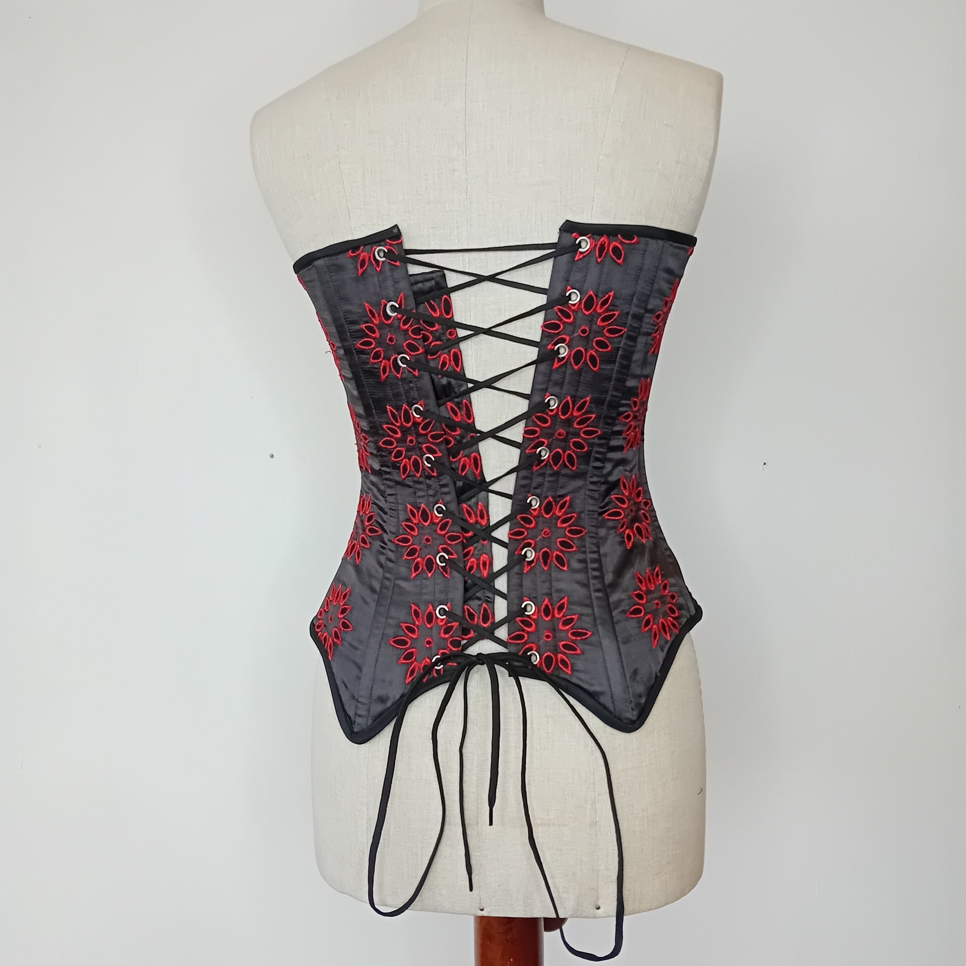 Corsetto SACRIFICE, in poliestere nero con ricami floreali rossi, interno in cotone. Ottimamente conservato, mostra segni di scotch all'interno, conservato in un luogo umido. Come nuovo.