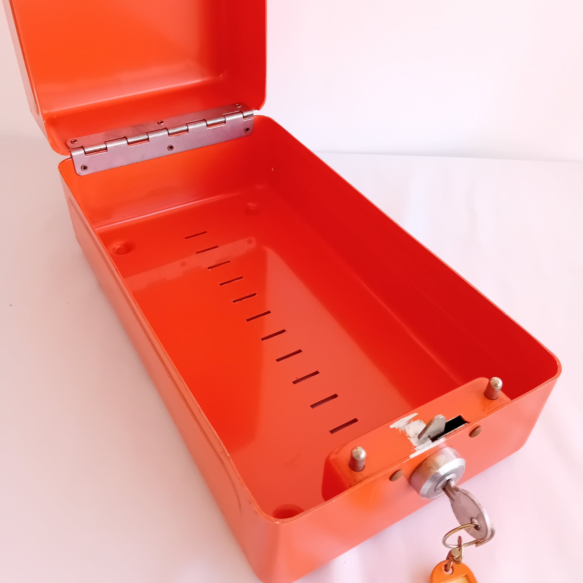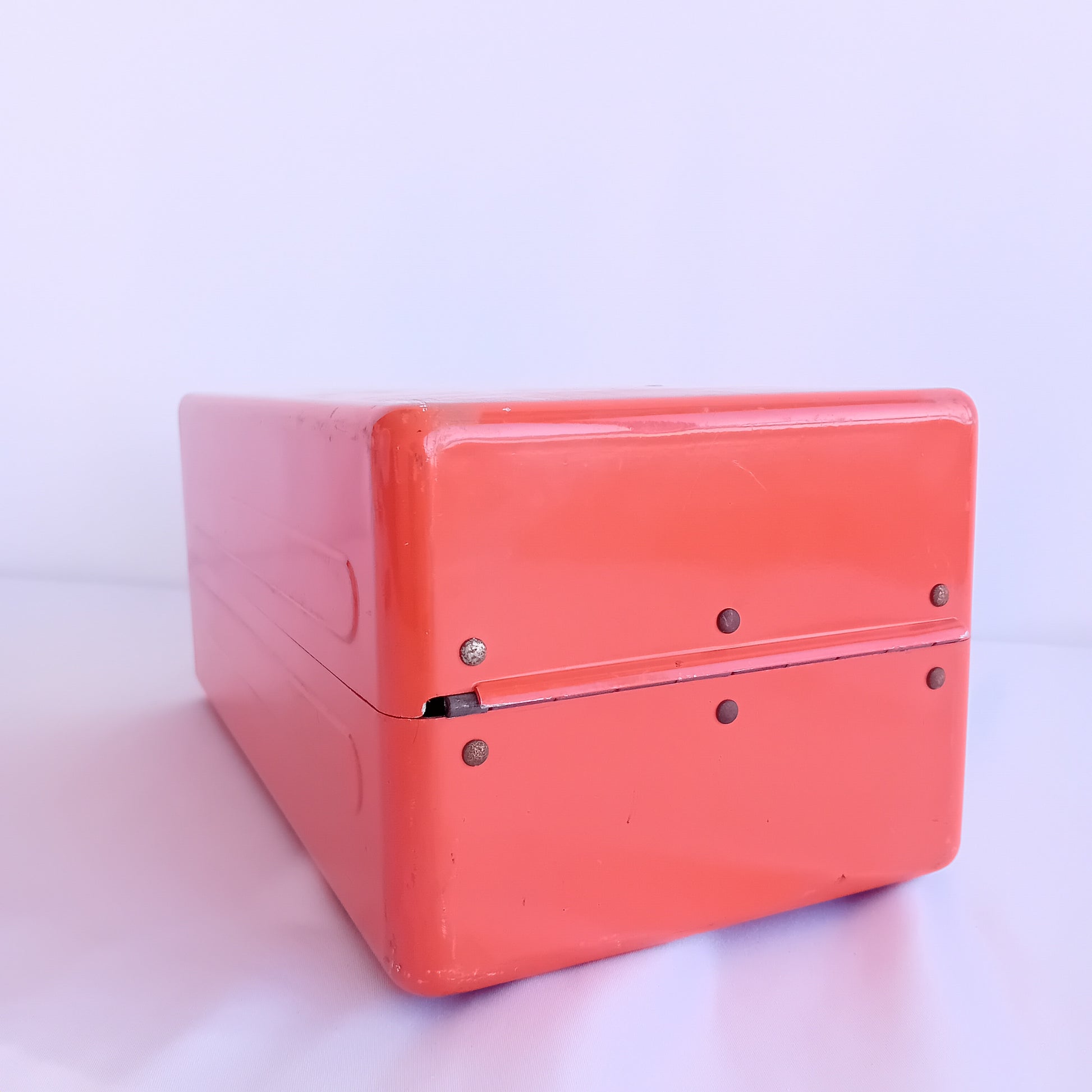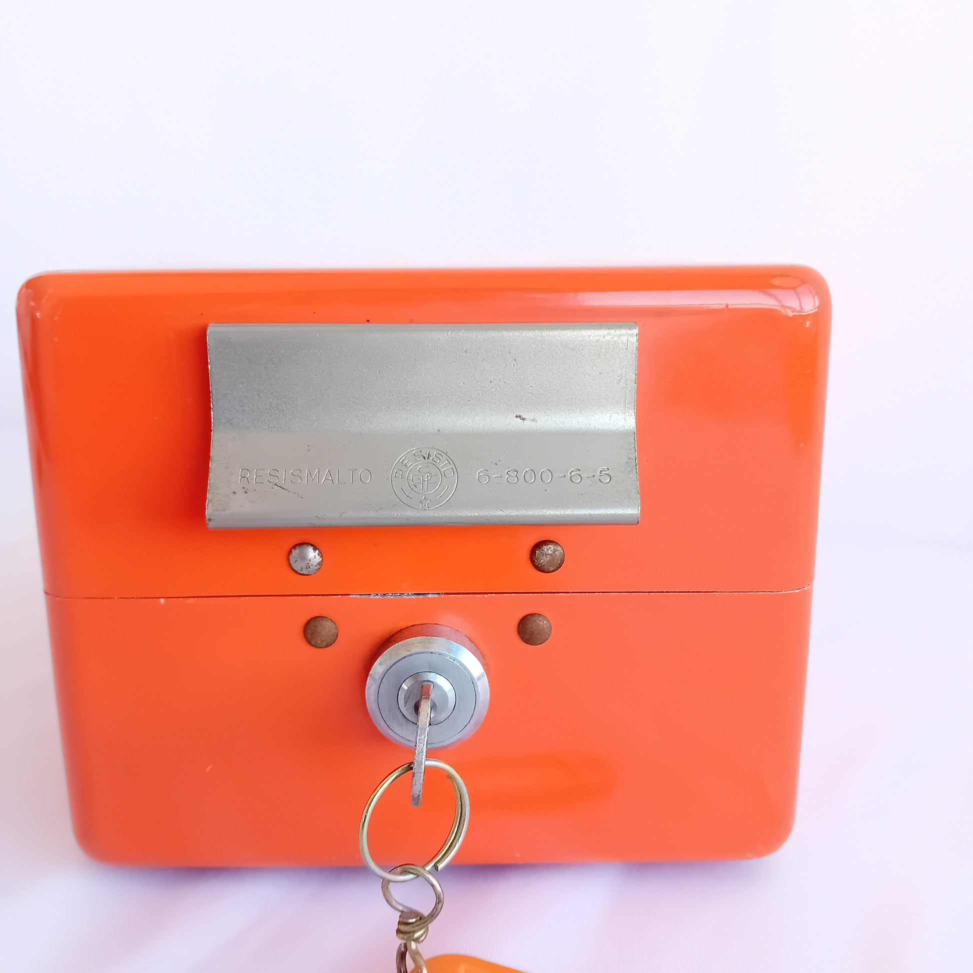 Schedario vintage anni '70, color arancio, Resisto SPF Resismalto. Chiusura a serratura con chiave in dotazione. NON dotato di divisori interni. Si presenta in buono stato come da foto, con qualche segno dovuto all'utilizzo.