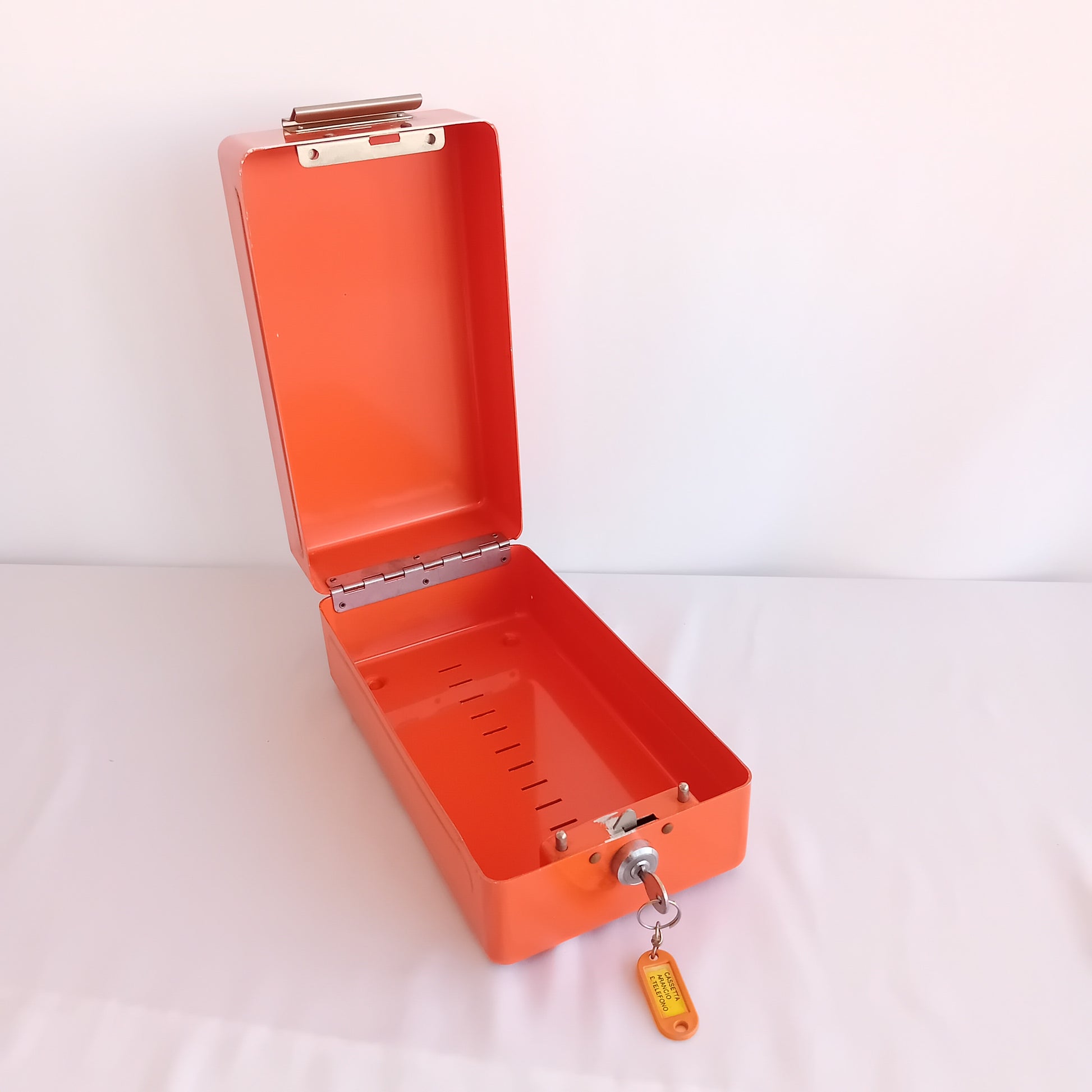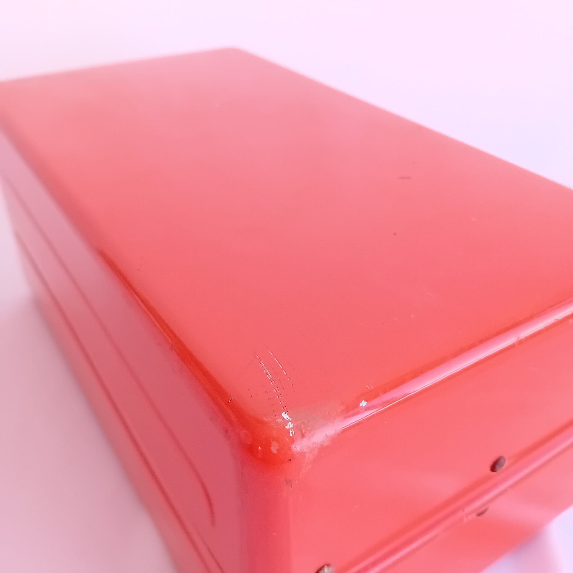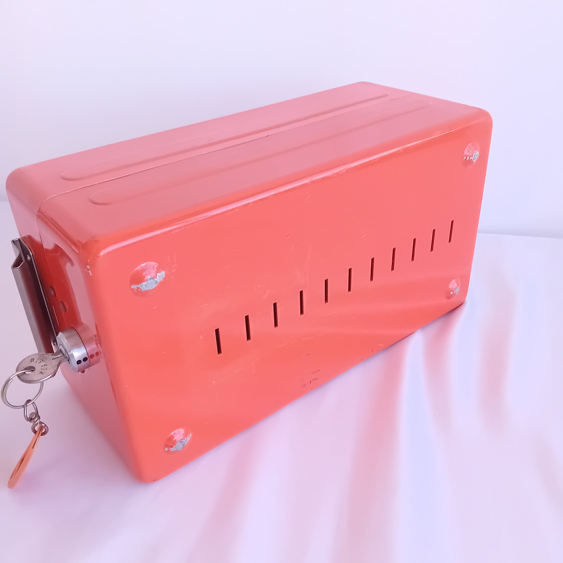 Schedario vintage anni '70, color arancio, Resisto SPF Resismalto. Chiusura a serratura con chiave in dotazione. NON dotato di divisori interni. Si presenta in buono stato come da foto, con qualche segno dovuto all'utilizzo.