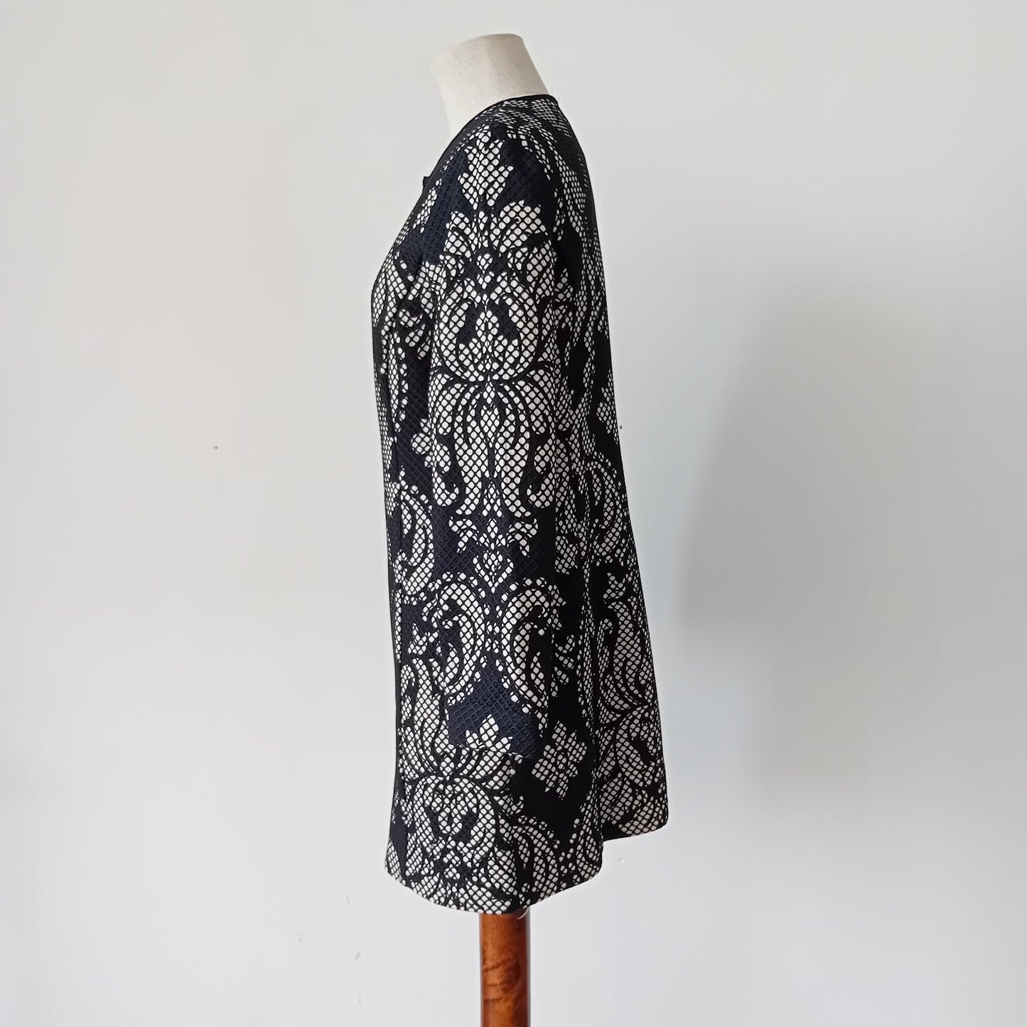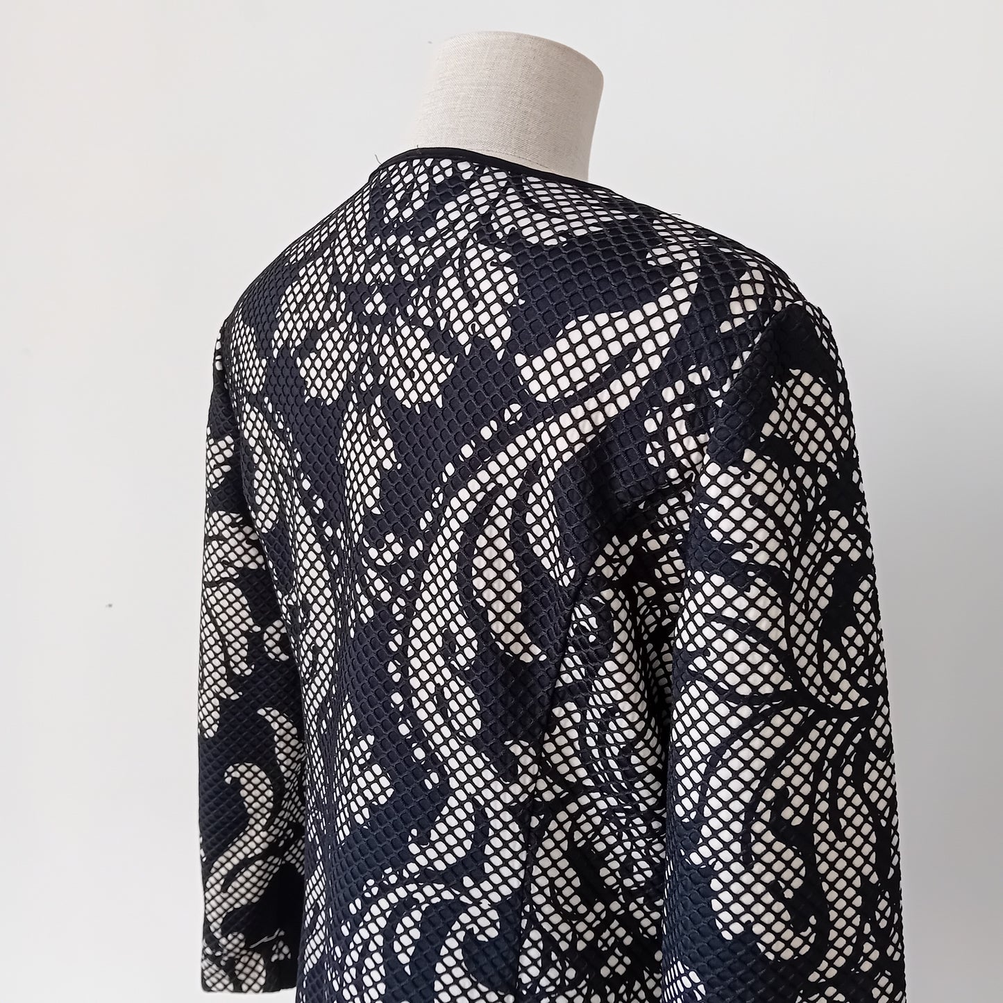 Spolverino FRANK LYMAN Design, a stampa floreale bianco e nero, ricoperto in rete nera, no revers, maniche lunghe con risvolto, chiusura frontale con zip doppia a vista, doppie riprese frontali e posteriori. No tasche. Ottimamente conservato, apparentemente scarsamente utilizzato.