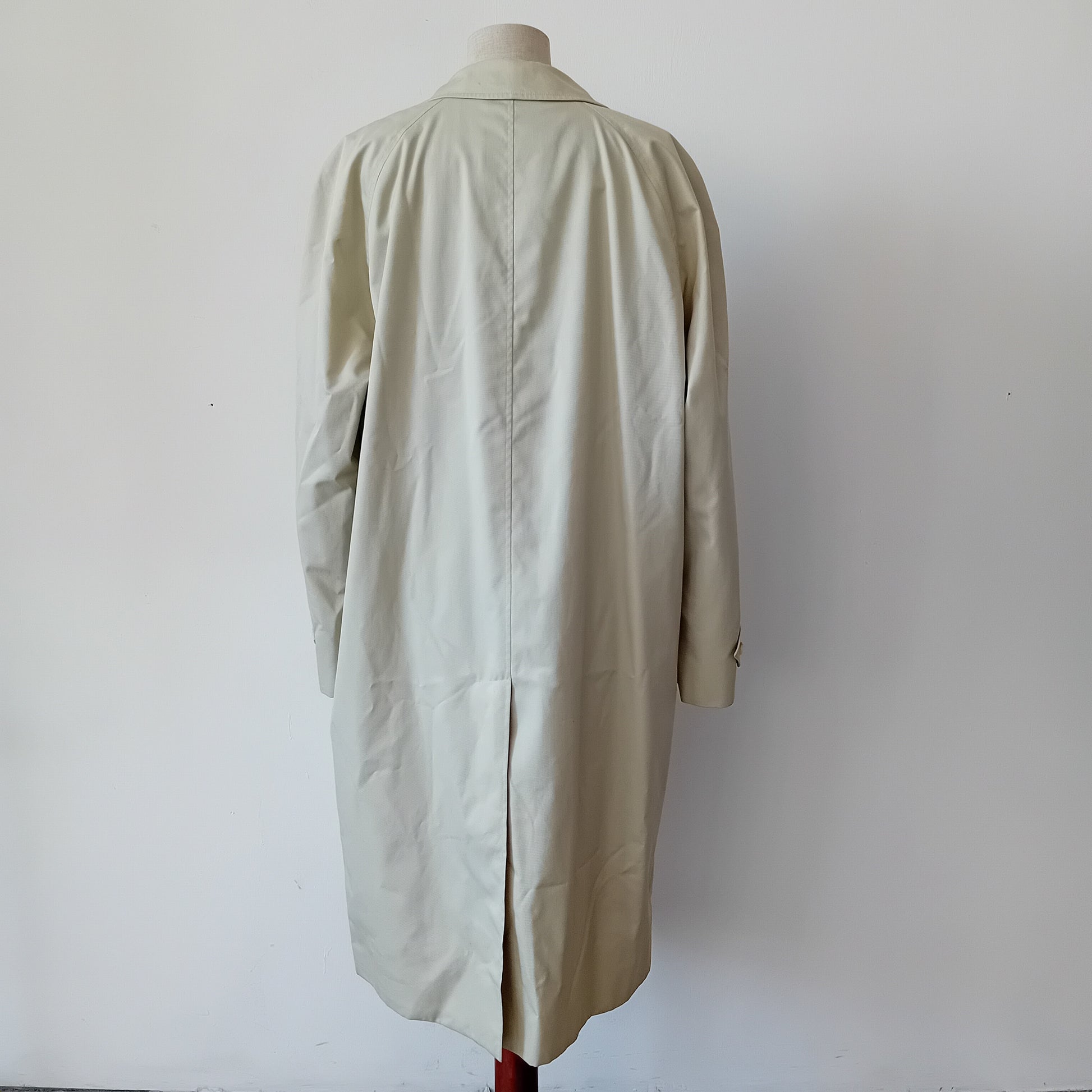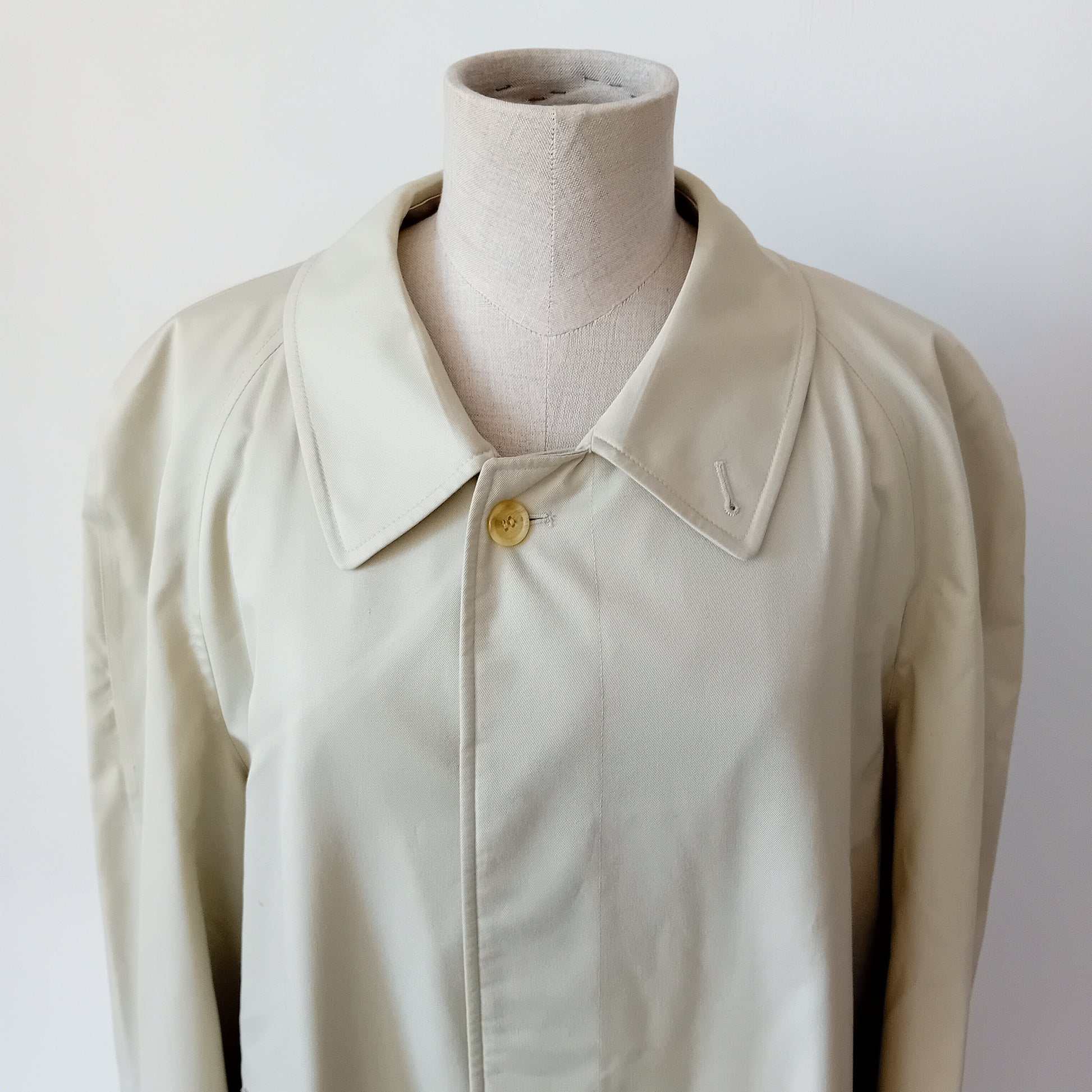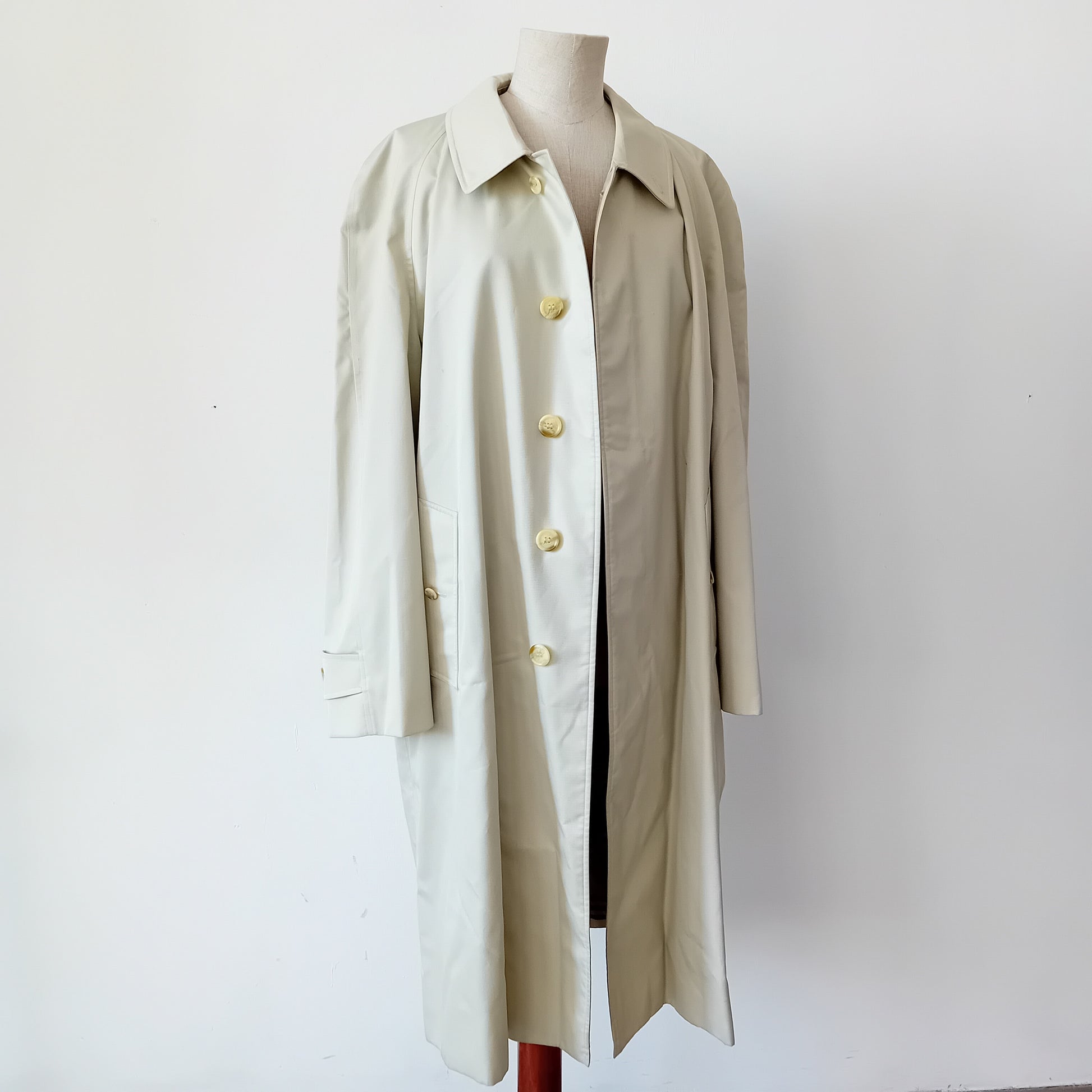 Trench vintage BURBERRYS', nel suo classico beige, spalline appena accennato il rinforzo interno, manica raglan, bottoni nascosti e tasche condivise dentro-fuori, ampio spacco posteriore. Il capo è stato molto amato: presenta piccole macchie sparse e pallini all'interno della fodera. Da lavare, nella sua struttura è ben conservato.