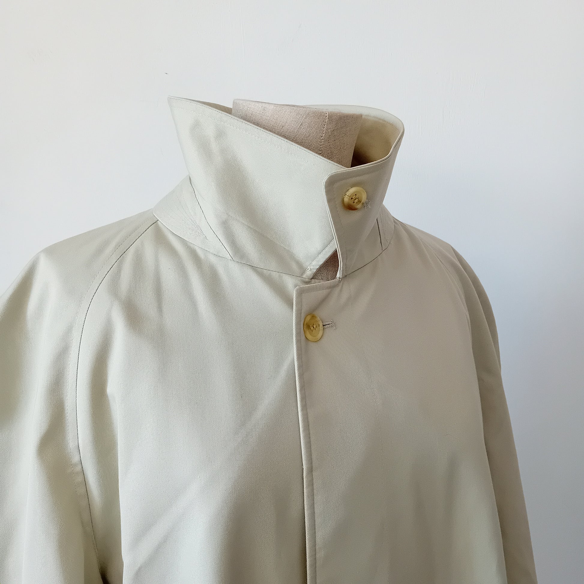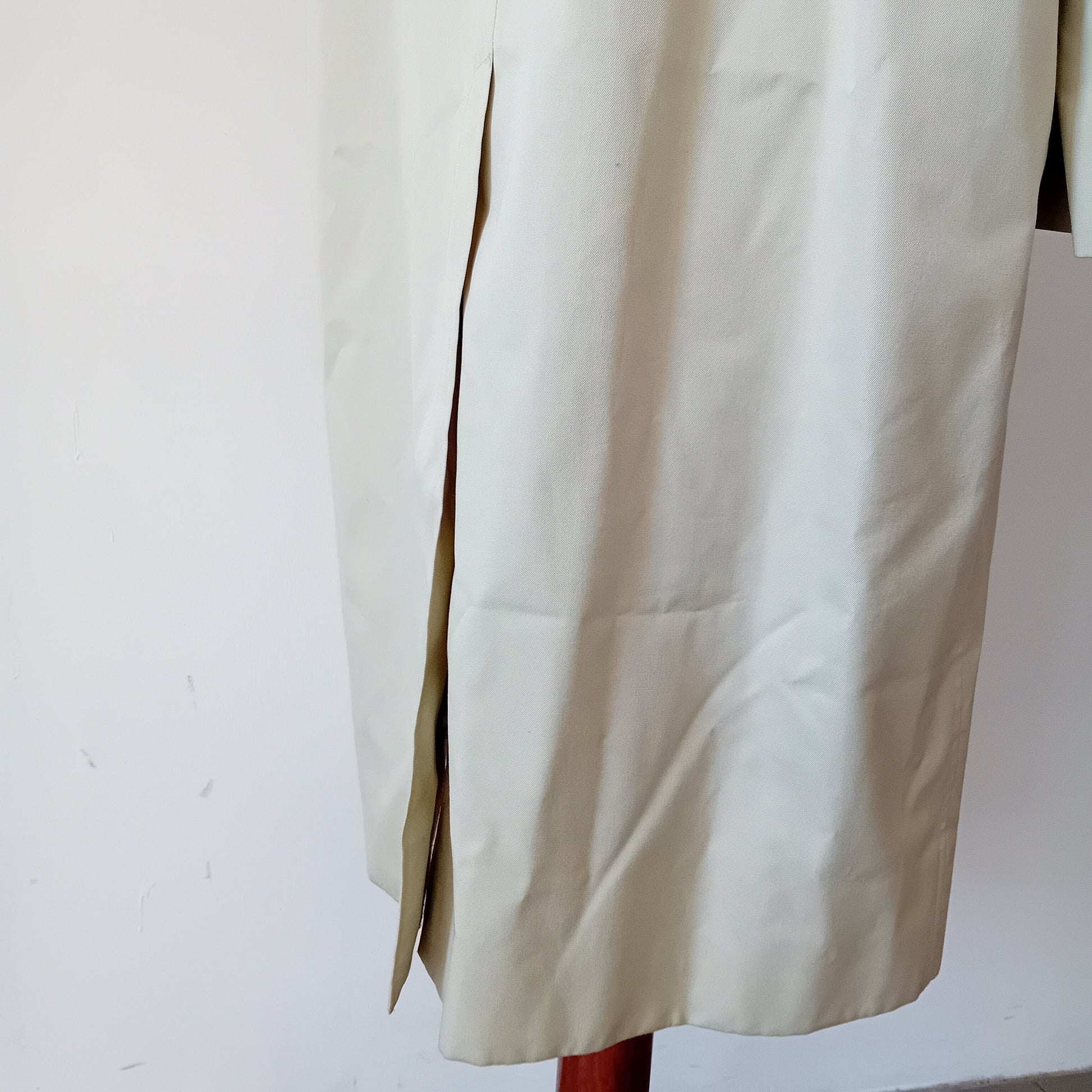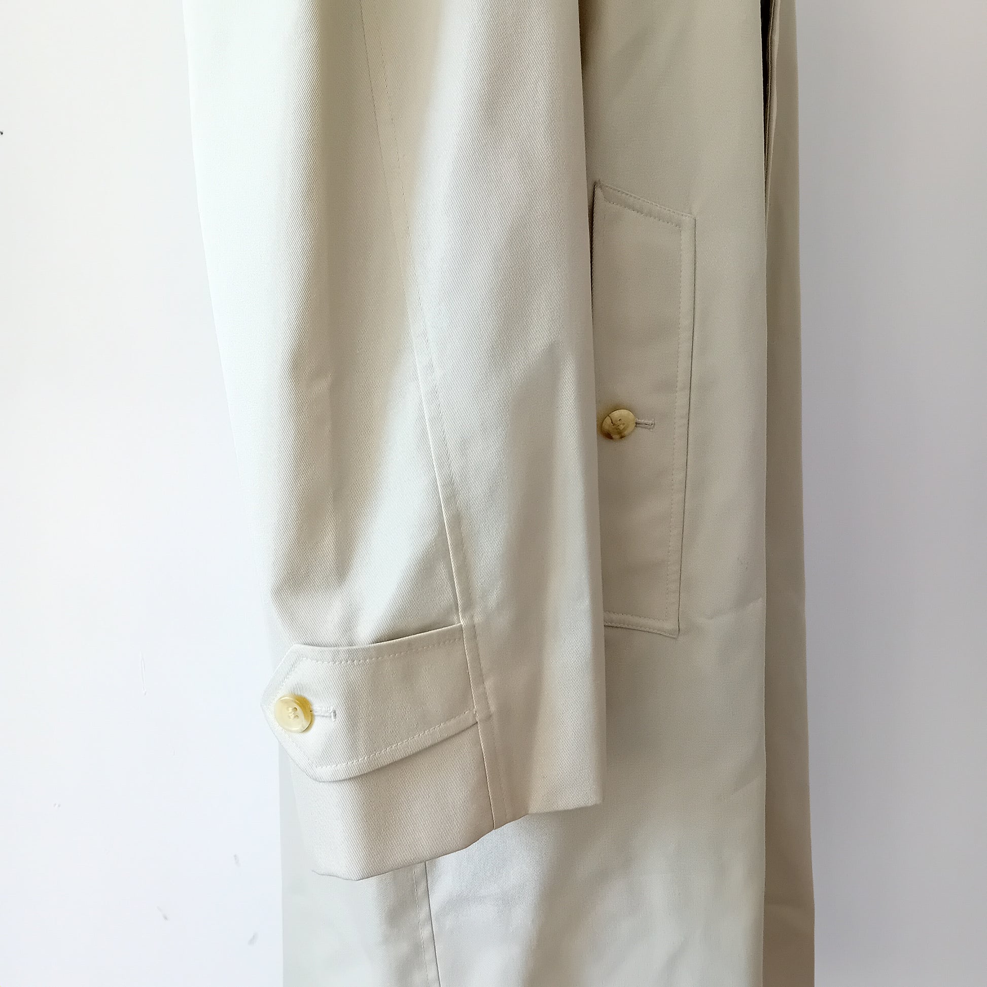 Trench vintage BURBERRYS', nel suo classico beige, spalline appena accennato il rinforzo interno, manica raglan, bottoni nascosti e tasche condivise dentro-fuori, ampio spacco posteriore. Il capo è stato molto amato: presenta piccole macchie sparse e pallini all'interno della fodera. Da lavare, nella sua struttura è ben conservato.