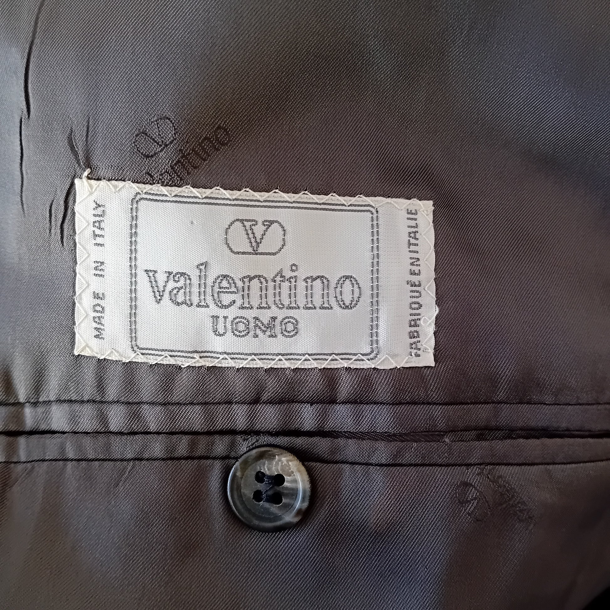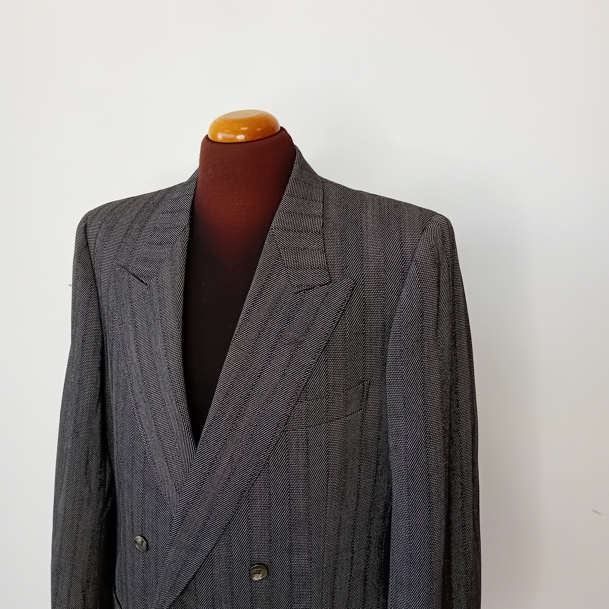 Blazer vintage VALENTINO GARAVANI, grigio a righe miste, doppio petto, spalline rinforzate, revers classico, tre tasche interne e tre esterne, interamente foderato. Amato, presenta segni di utilizzo sparsi (macchie, piccoli buchi, fodera ingiallita); rimossa l'etichetta della composizione e taglia. Ben conservato.