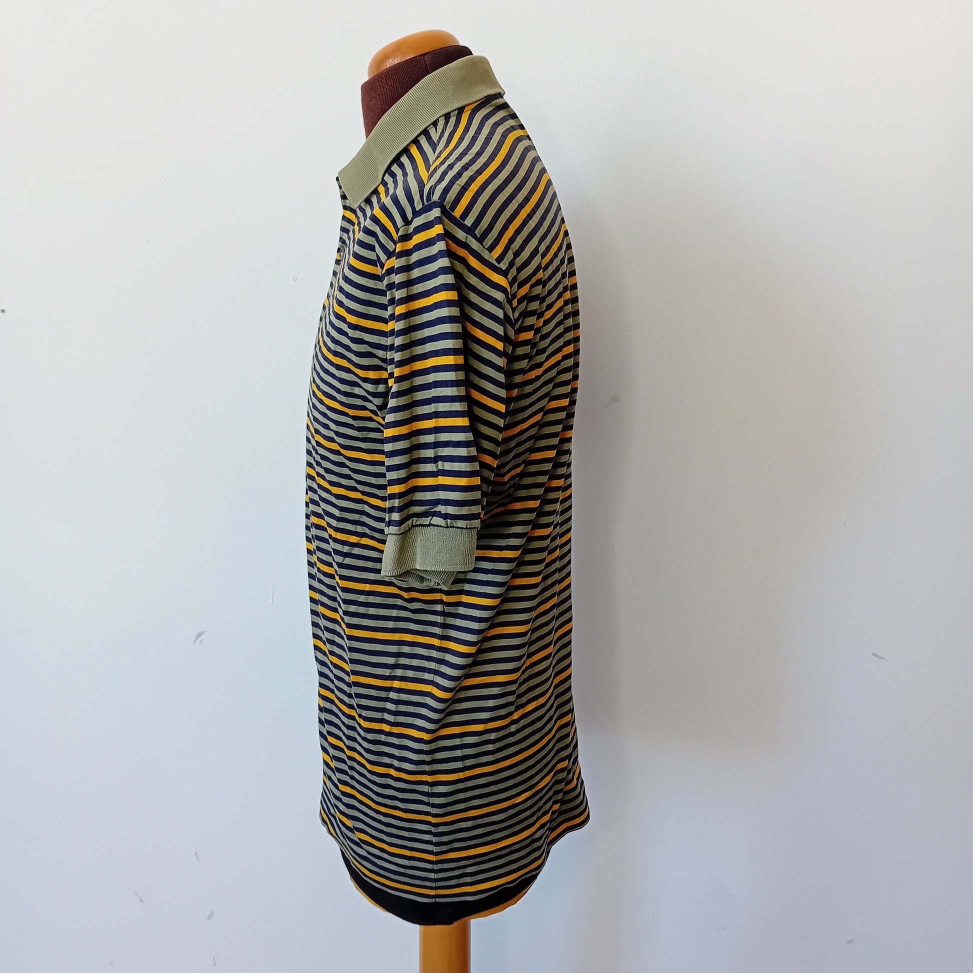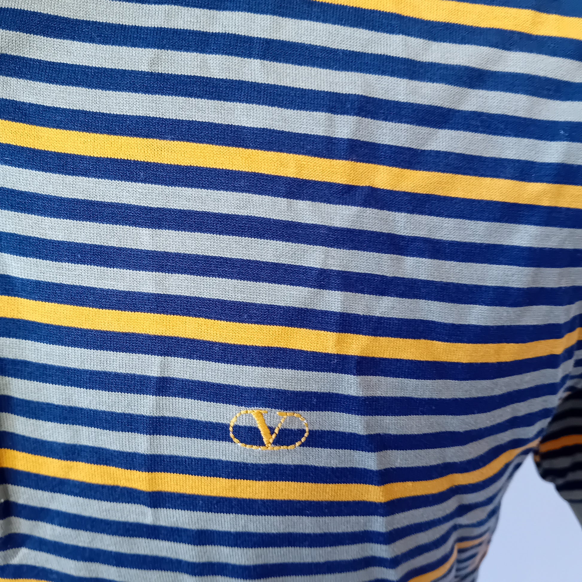 Polo vintage VALENTINO GARAVANI uomo, a righe verde oliva, giallo e blu, mezze maniche e tre bottoni. Amato, presenta segni di utilizzo sparsi e un piccolo foro a metà busto. Ben conservato.