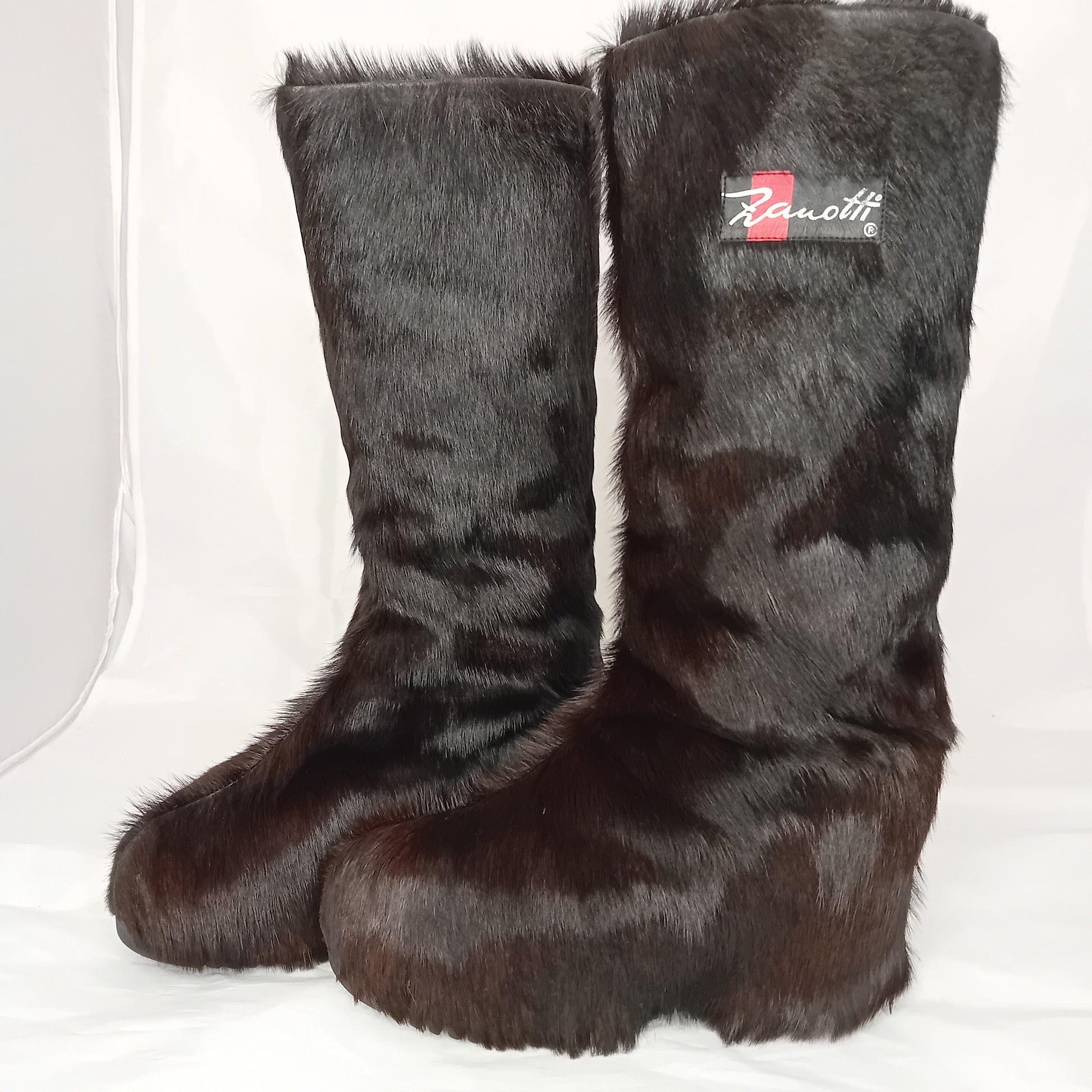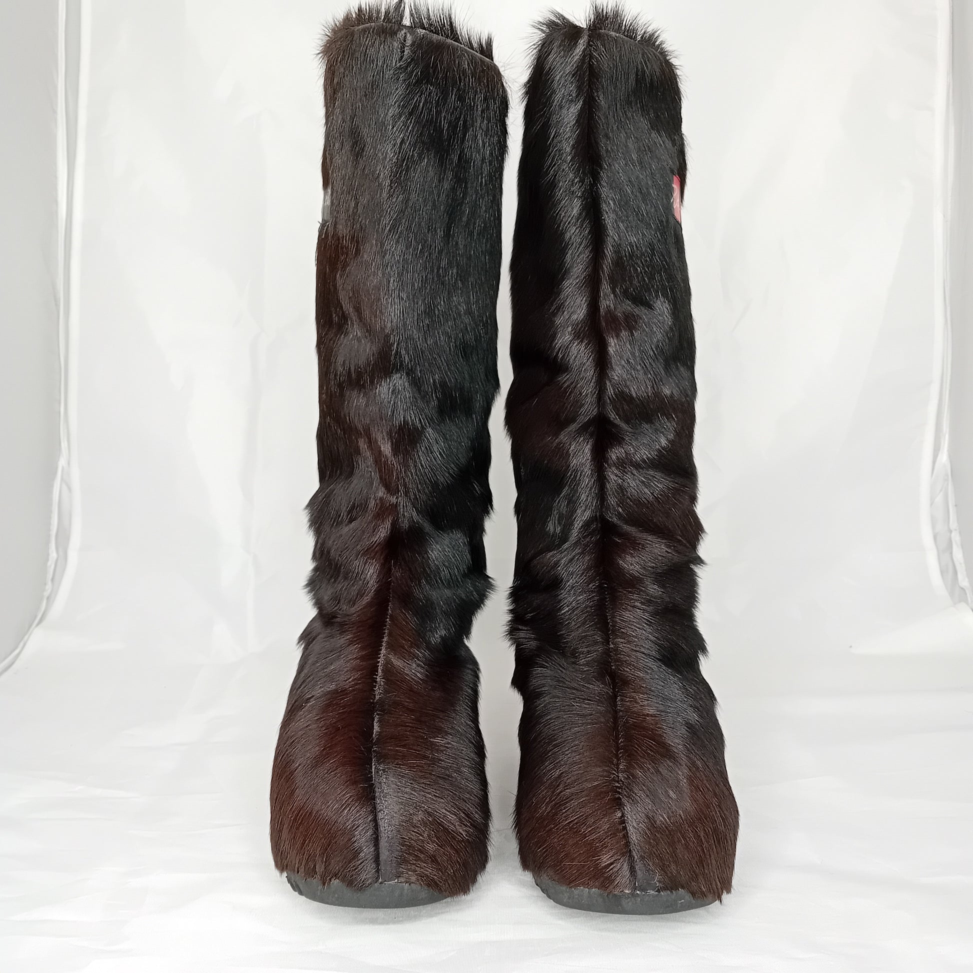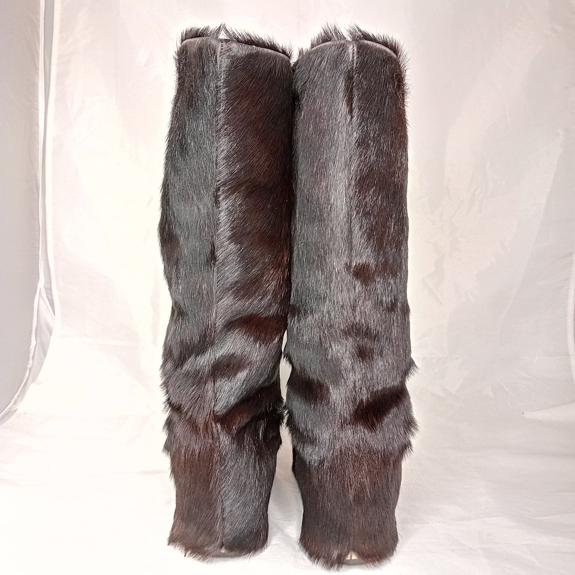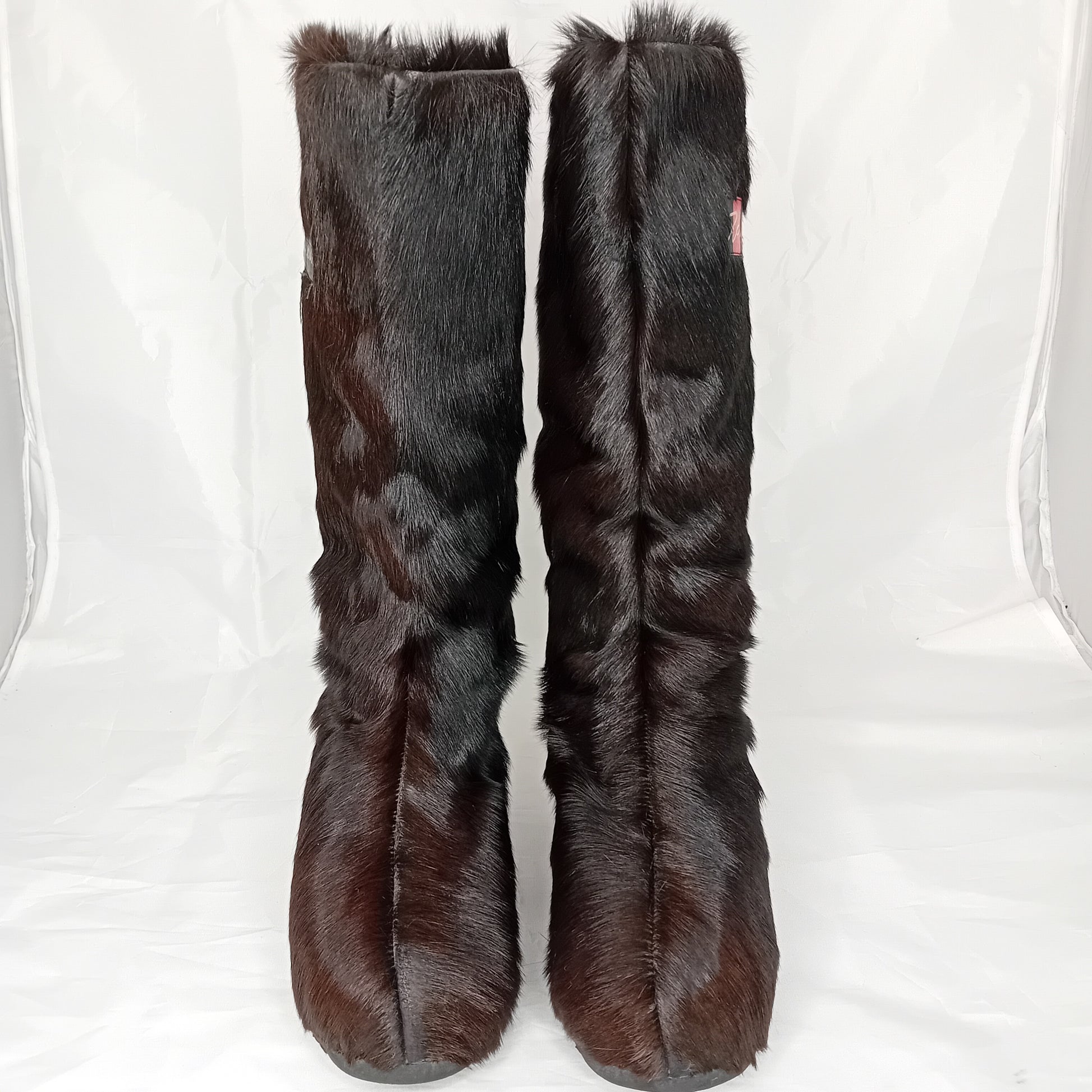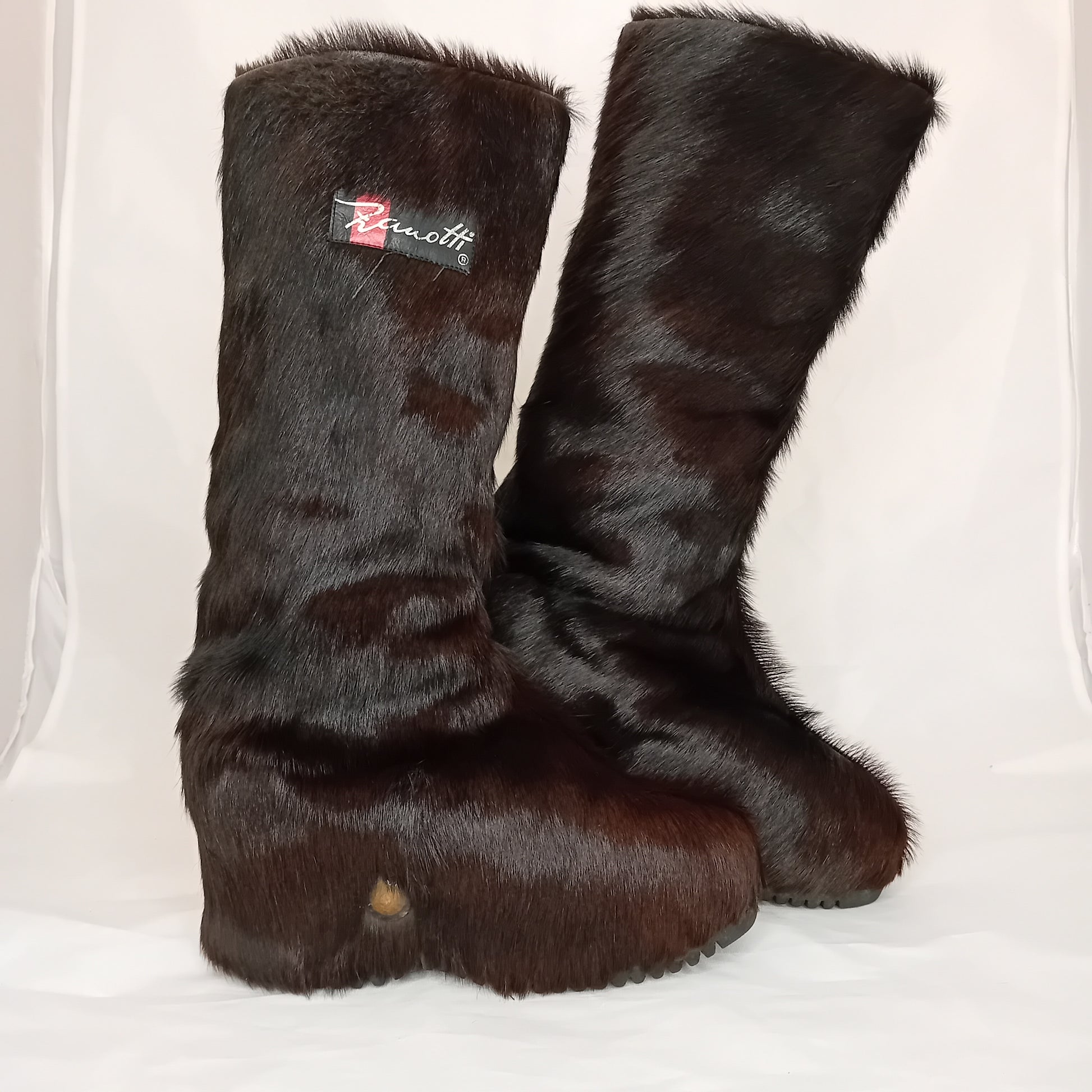 Doposci vintage ZANOTTI, in pelliccia marrone testa di moro a pelo medio, suola in legno. Amati, segni di utilizzo sparsi dentro e fuori. Ben conservati.